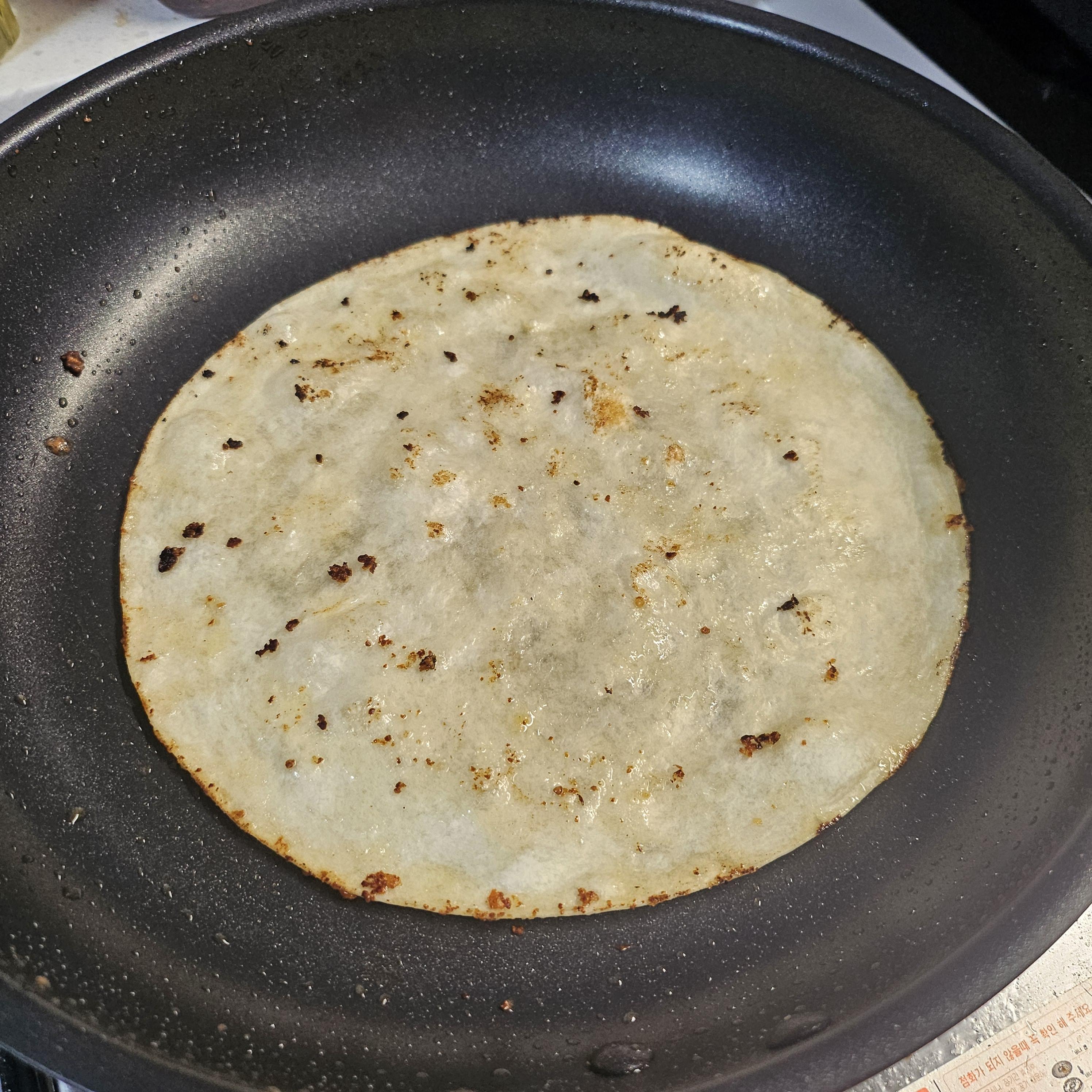 버터가 묻은 팬을 닦지 않고 또띠아를 구워준다.