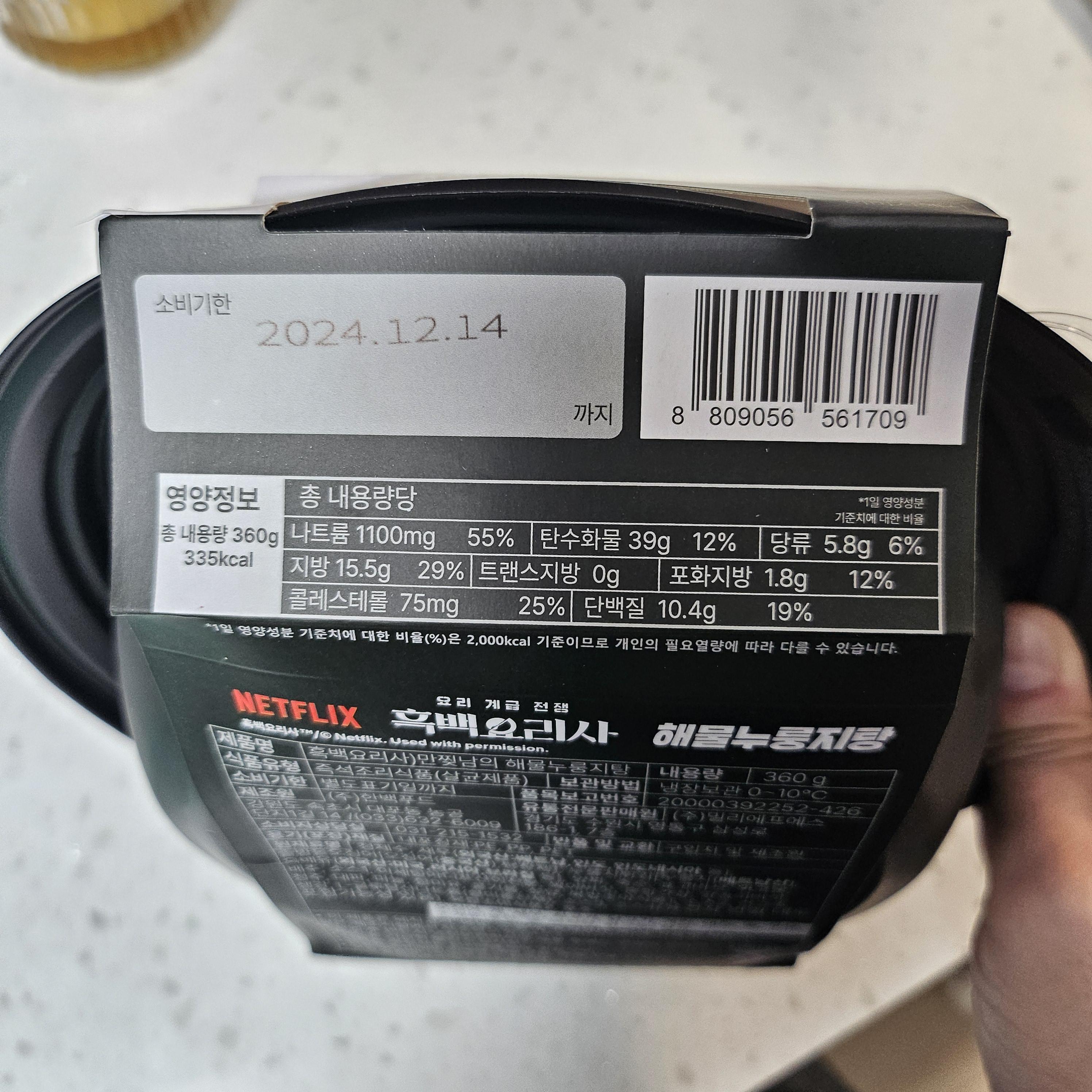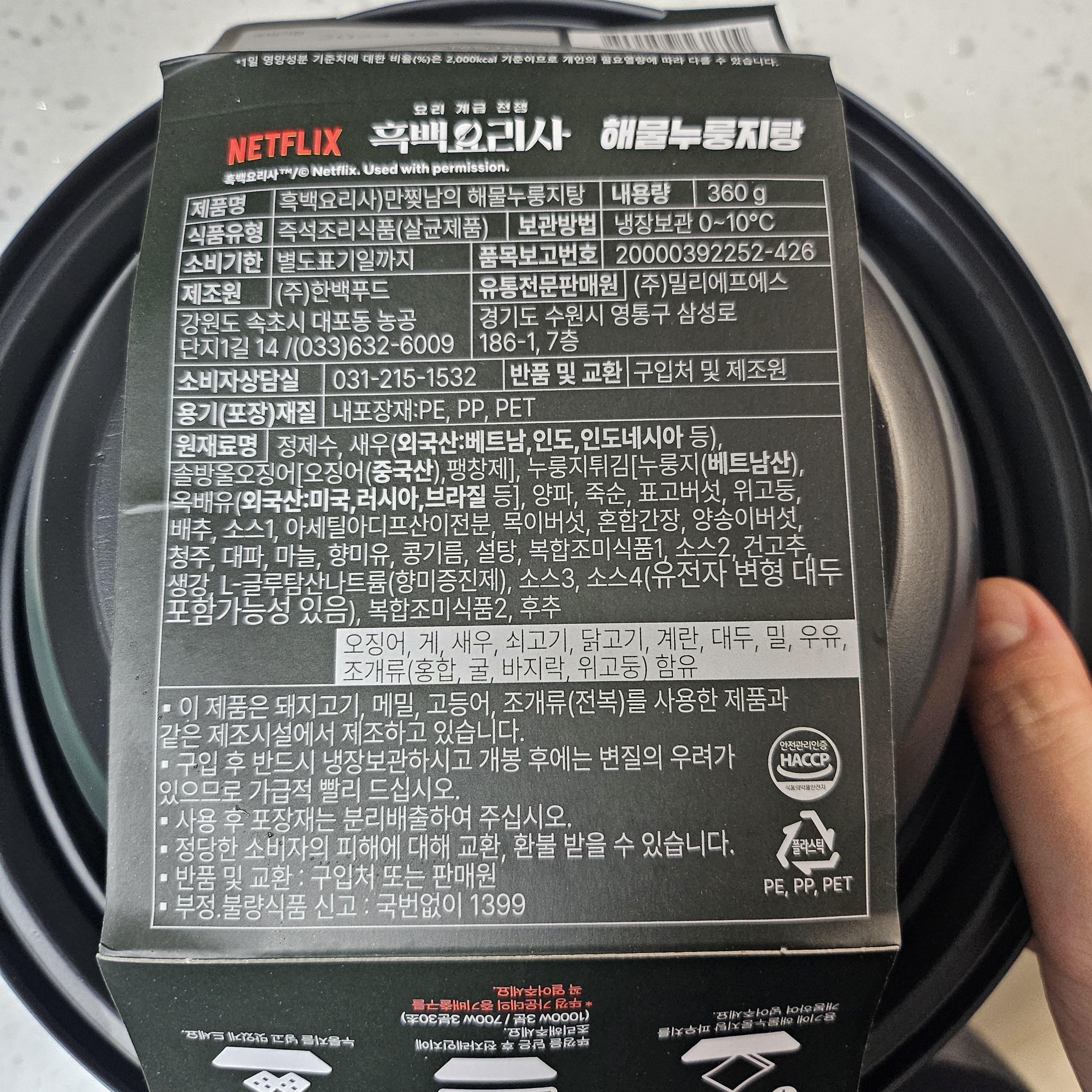 해물누룽지탕은 360g으로 1인분으로 적당한 양이었으며, 335칼로리로 열량이 비교적 낮았습니다. 해산물이 주재료로 들어간 덕분인지 고소한 맛과 함께 가벼운 한 끼로 즐기기 딱 좋은 제품이었어요. 구성은 누룽지 5%, 새우 8%, 솔방울 오징어 6%, 위고둥 2.7% 등 해산물이 골고루 포함되어 있었습니다. 재료 비율만 봐도 다양한 맛을 느낄 수 있을 것 같았어요. 냉장 보관이 필요하지만, 소비기한이 긴 편이라 냉장고에 비축해 두고 필요할 때 꺼내 먹기에 좋았습니다. 또한, 저처럼 바쁜 일상 속에서 가끔 특별한 요리를 즐기고 싶은 사람에게 적합한 선택지였습니다.