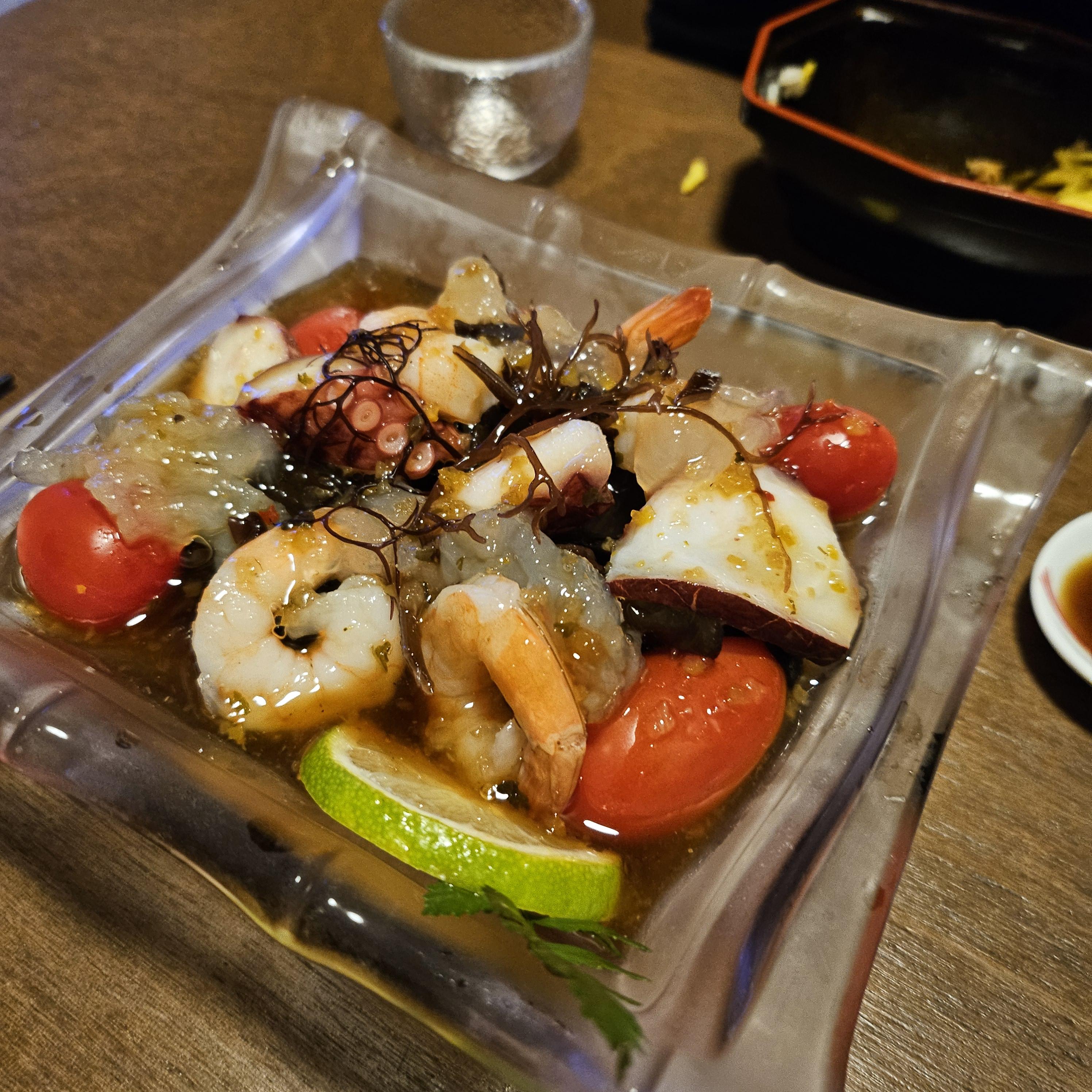 해산물샐러드는 폰즈 소스를 곁들인 문어, 해파리, 새우로 구성되어 있었는데요. 상큼한 소스 덕분에 입맛이 깔끔하게 정리되는 느낌이었어요. 해파리의 독특한 식감 덕분에 먹는 재미도 있었고요.