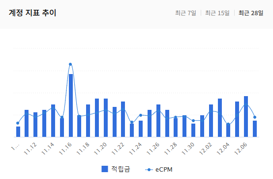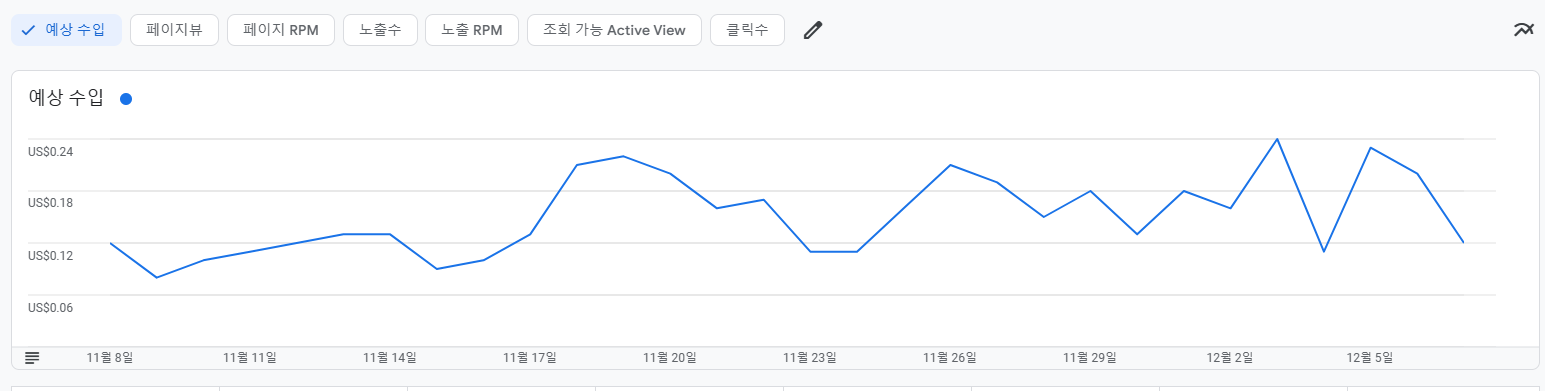 또한, 애드센스의 12월 3일 최고 수익은 **0.24달러(약 312원)**인 반면, 같은 날 카카오애드핏 수익은 14원에 불과했습니다.