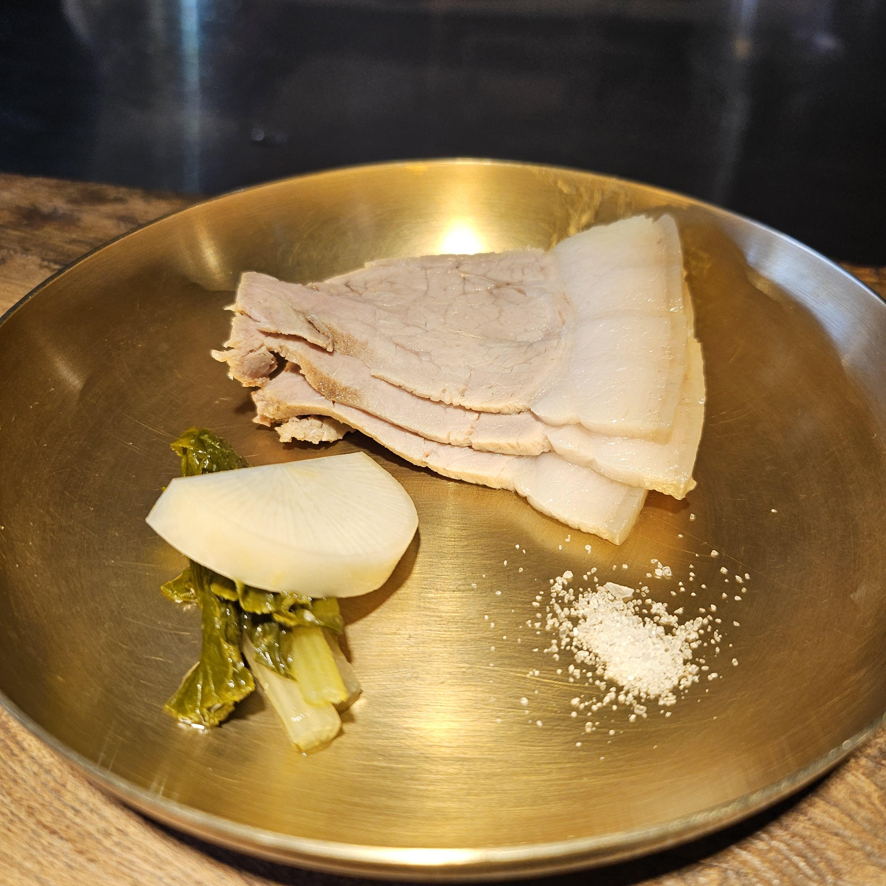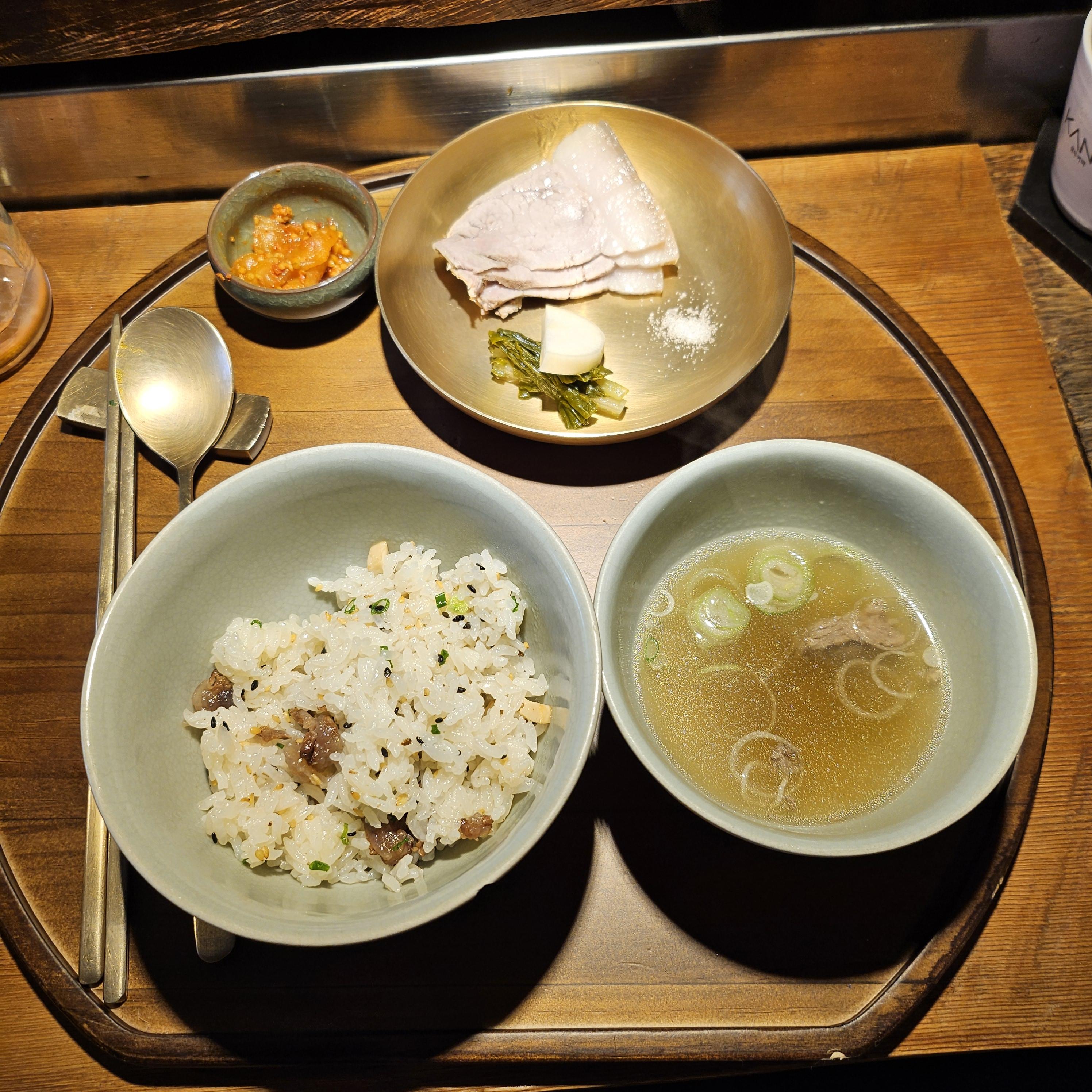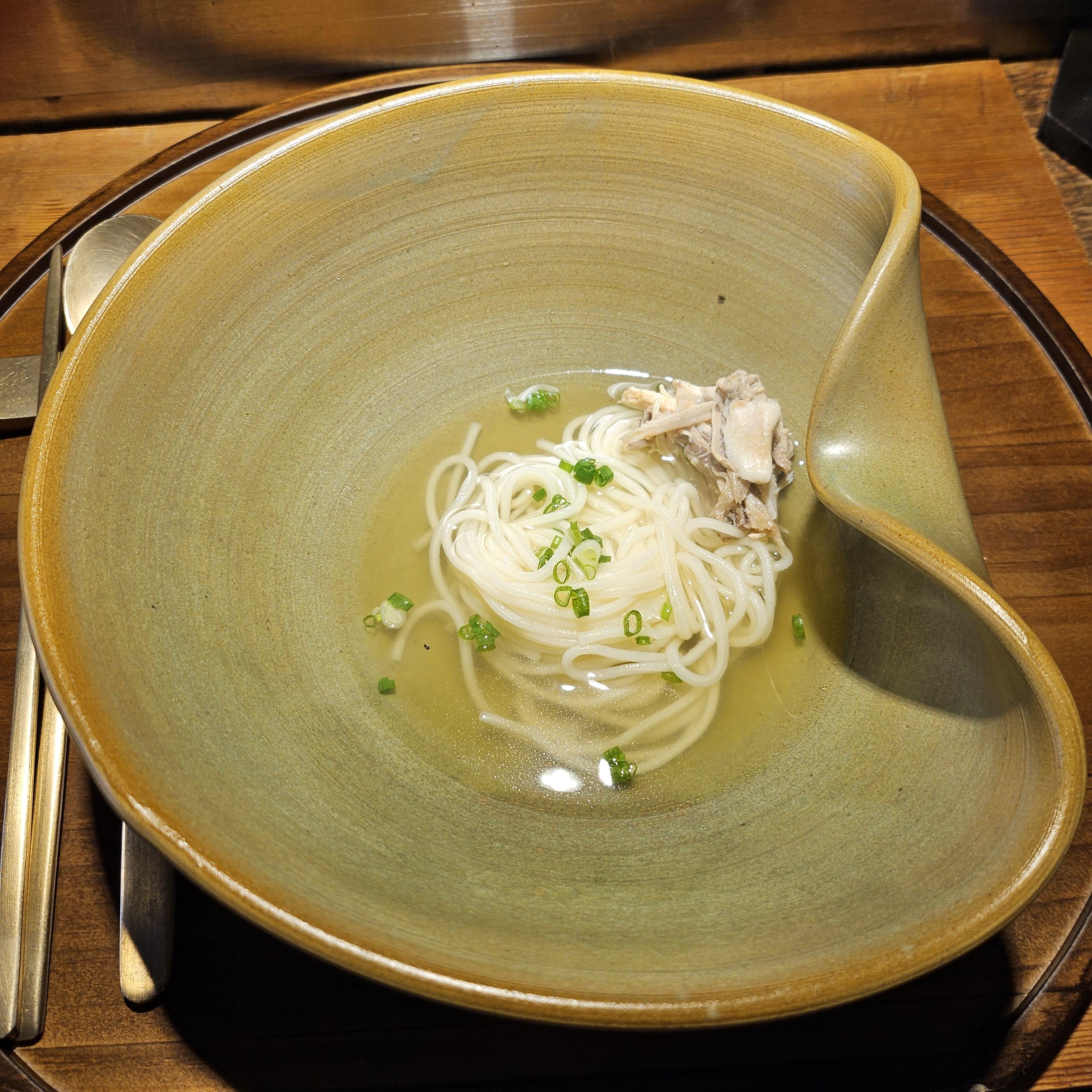 다음은 온면이었어요. 두 가지 베이스의 국물은 짭조름하면서도 깊은 맛이 느껴졌고, 장인이 만든 중면은 쫄깃하고 부드러웠어요. 면의 질감이 정말 훌륭해서, 국물과 함께 먹었을 때의 조화가 정말 좋았답니다. 다만, 뼈가 조금 많이 나와서 아쉬운 점이 있었지만, 그럼에도 불구하고 전체적인 맛은 정말 훌륭했어요!