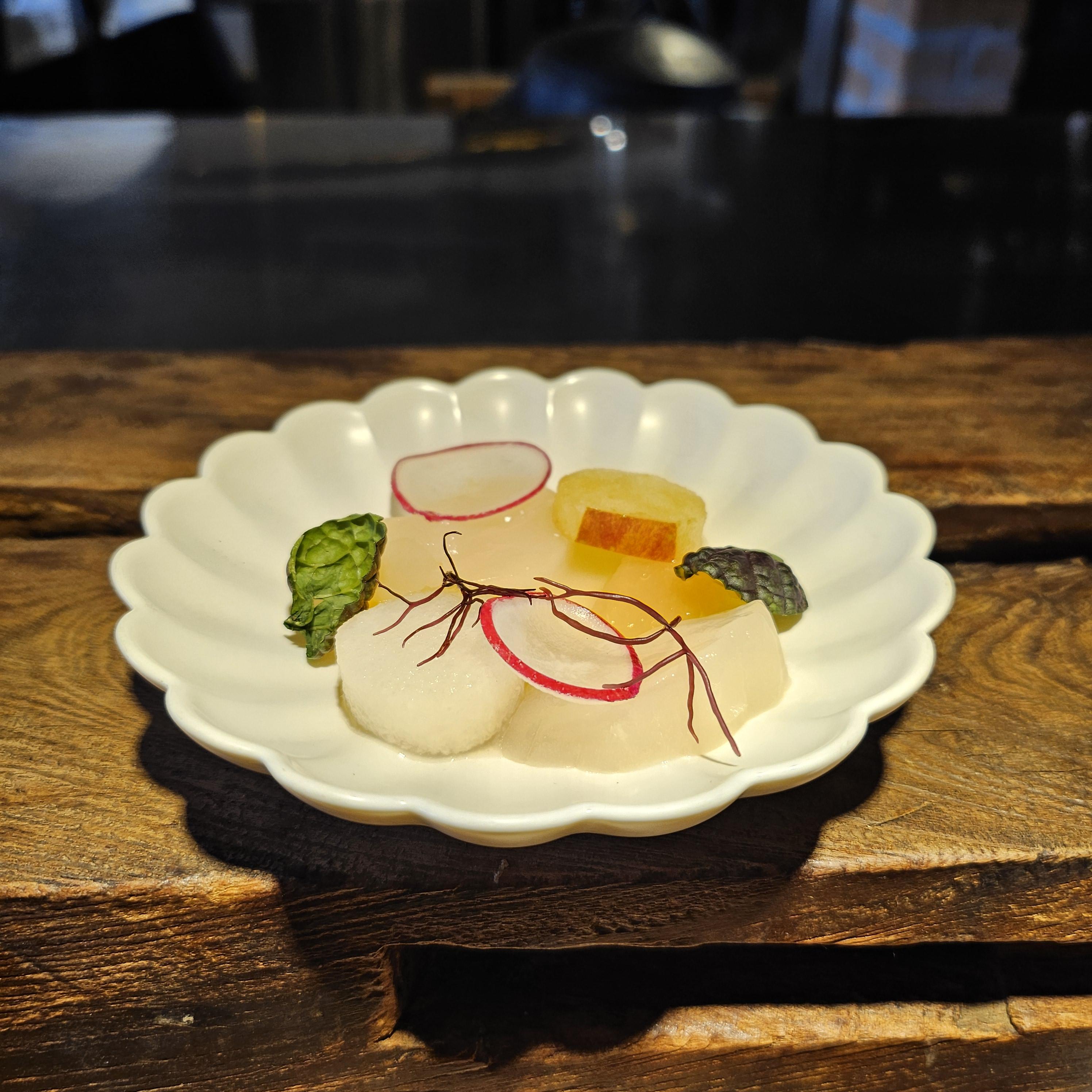 이어지는 원산물회는 원산 지역의 제철 식재료와 관자가 함께 나왔어요. 상큼한 소스와 함께 제공되었는데, 소스가 조금 과하게 새콤할 수 있으니 조심해야 합니다. 신선한 해산물의 맛과 소스의 조화가 정말 좋았고, 입안에서 상큼함이 퍼지는 느낌이 인상적이었어요. 해산물의 질이 매우 좋았고, 제철 재료를 사용한 만큼 맛이 더욱 깊었습니다.