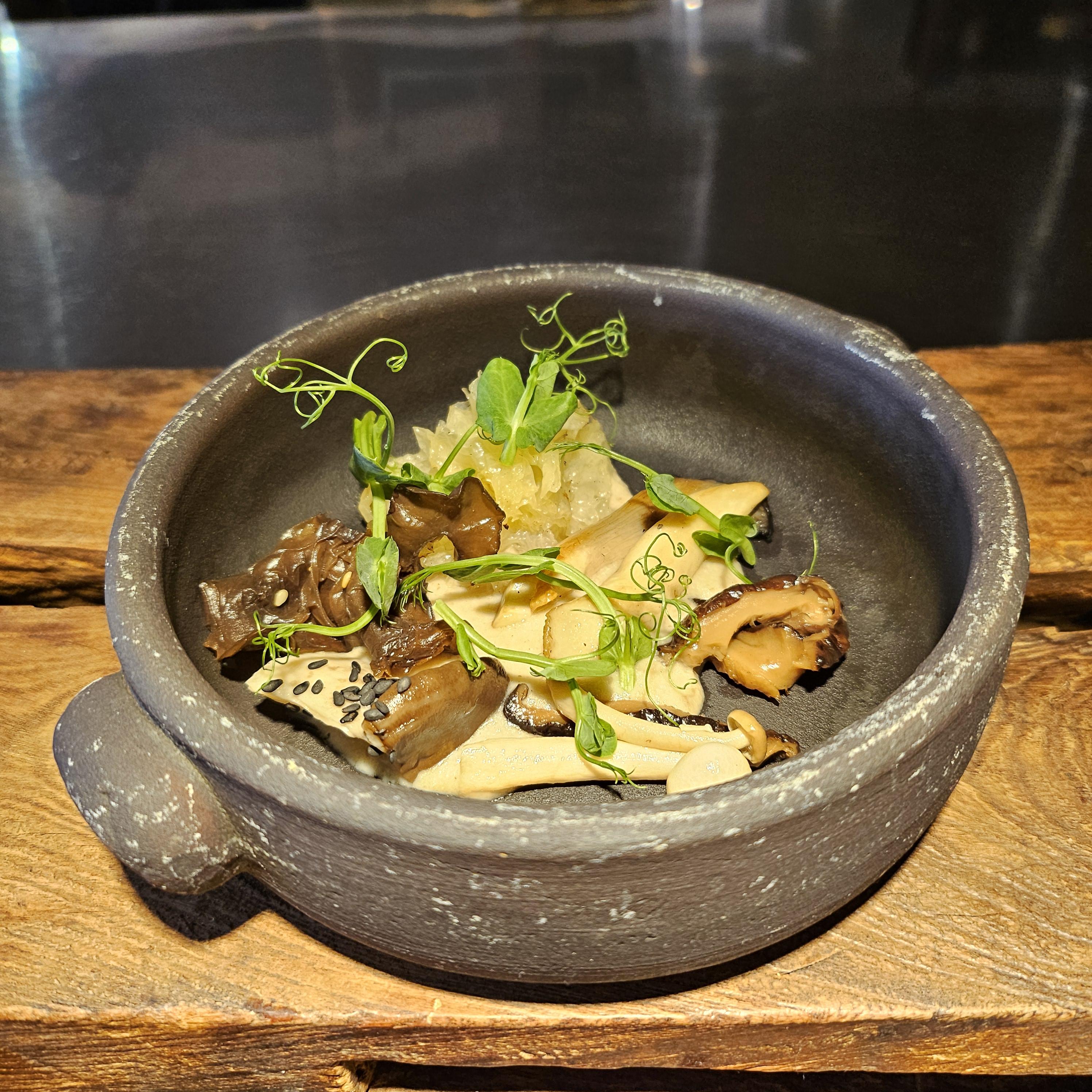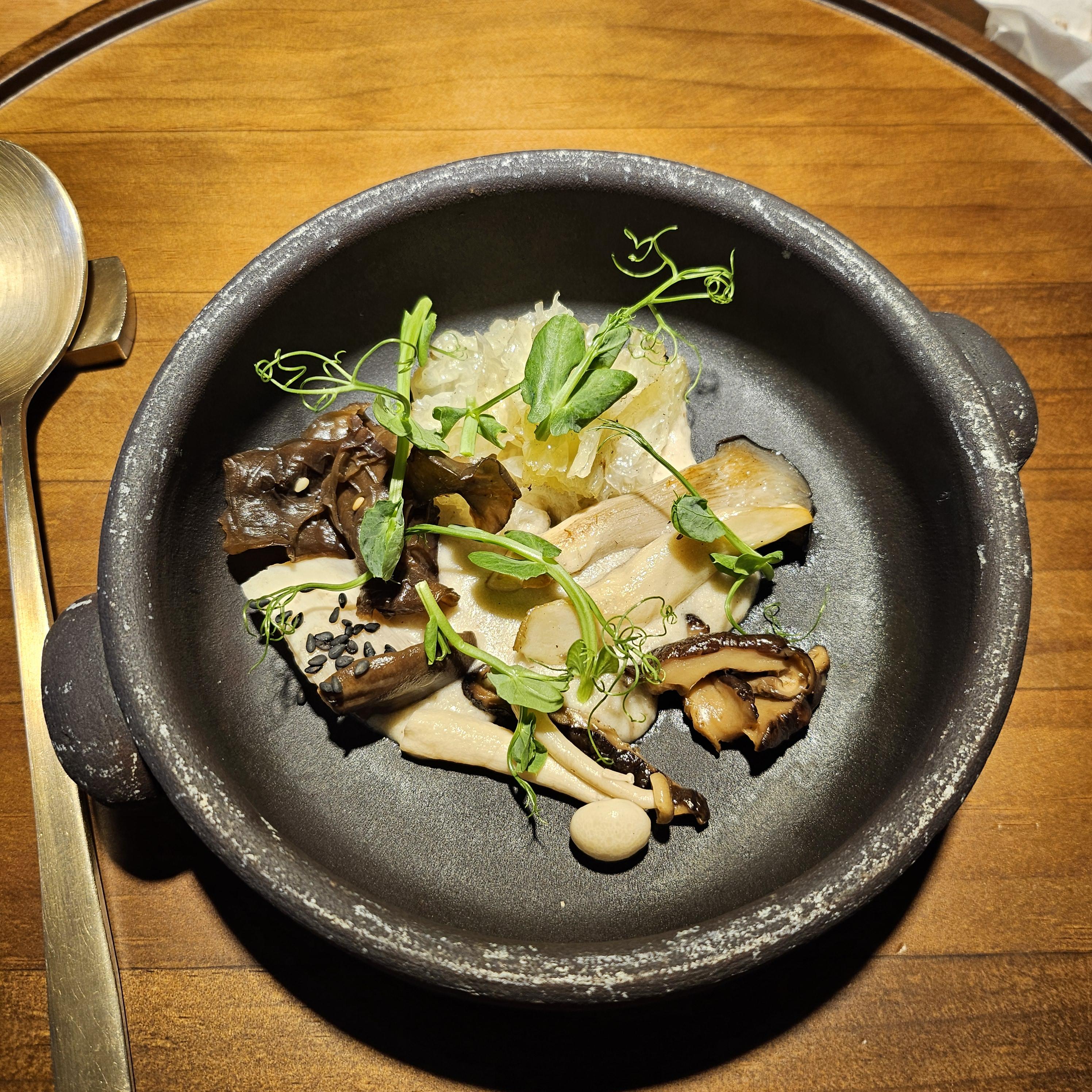 그 다음에는 다양한 조리법으로 조리된 6가지 버섯이 나왔어요. 은이버섯은 숯불에 구워서 고소한 맛이 더해졌고, 다른 버섯들은 졸이거나 볶아서 각각의 특성을 살렸답니다. 특히 만가닥 버섯은 살짝 새콤한 맛이 나서 전체적으로 너무 맛있었어요! 이렇게 다양한 조리법으로 제공된 버섯들은 각각의 식감을 느낄 수 있어 즐거운 경험이었답니다. 버섯의 신선함과 조리 방법이 정말 인상적이었어요.