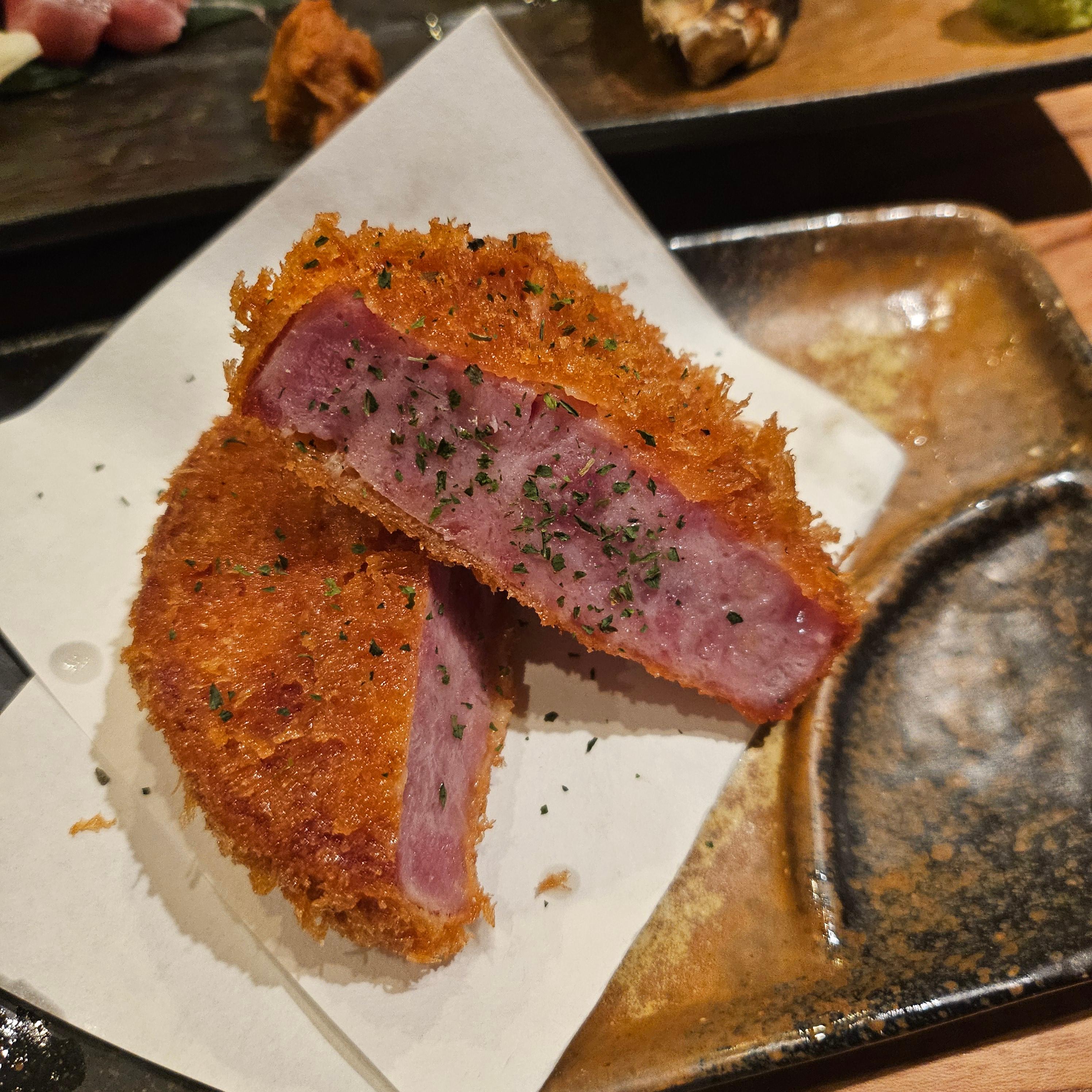햄을 튀긴 요리로, 한국에서는 보기 힘든 메뉴였어요. 고기가 아닌 햄 특유의 짭조름한 맛이 바삭한 튀김옷과 완벽하게 어울렸어요. 튀김 요리를 좋아하는 분이라면 무조건 만족할 맛이에요.