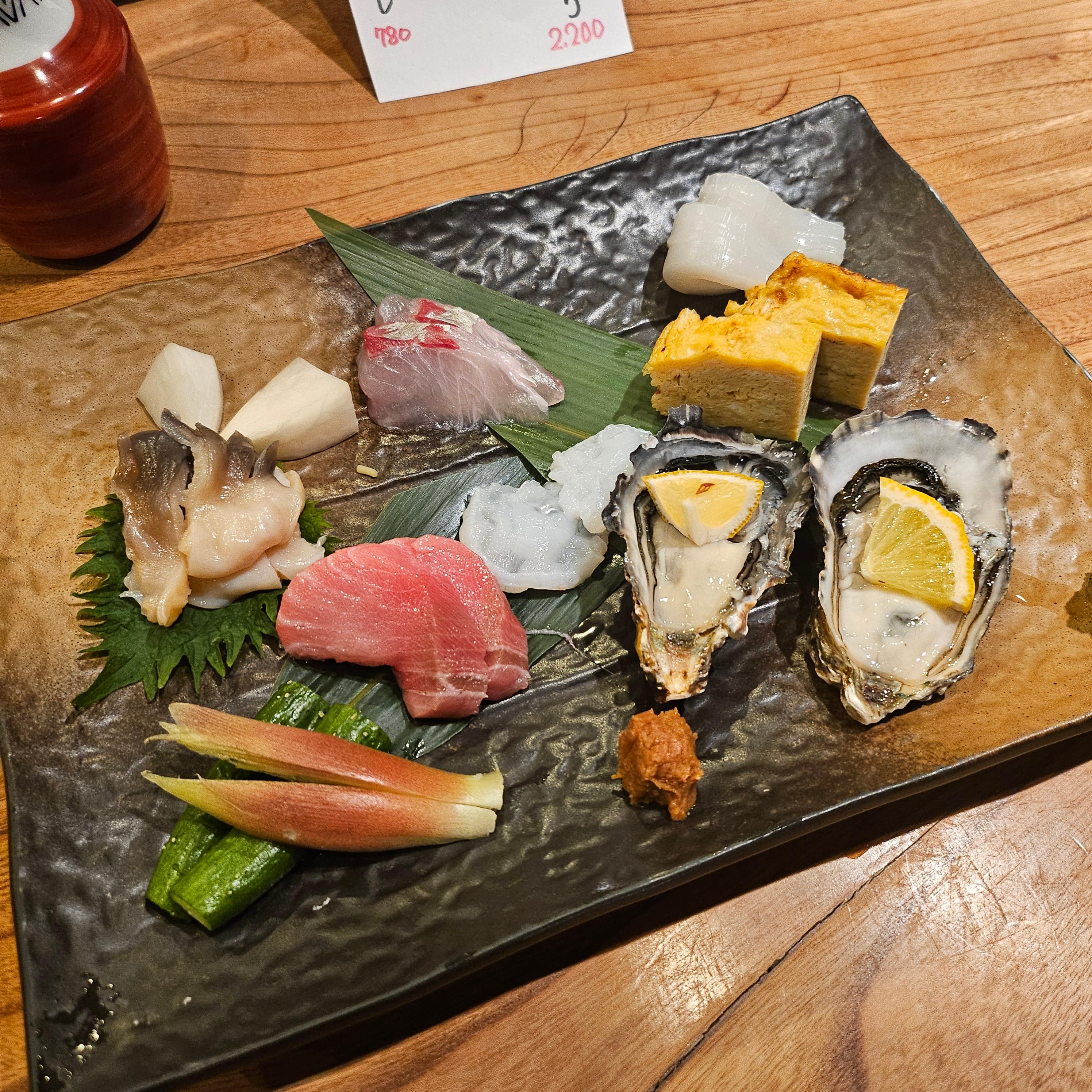 굴을 포함한 신선한 사시미 모둠이 나왔는데, 제가 평소에 굴을 잘 안 먹는데도 너무 맛있어서 깜짝 놀랐어요. 특히 참치는 입안에서 녹는 듯 부드럽고, 생선회도 신선함이 그대로 느껴졌답니다.