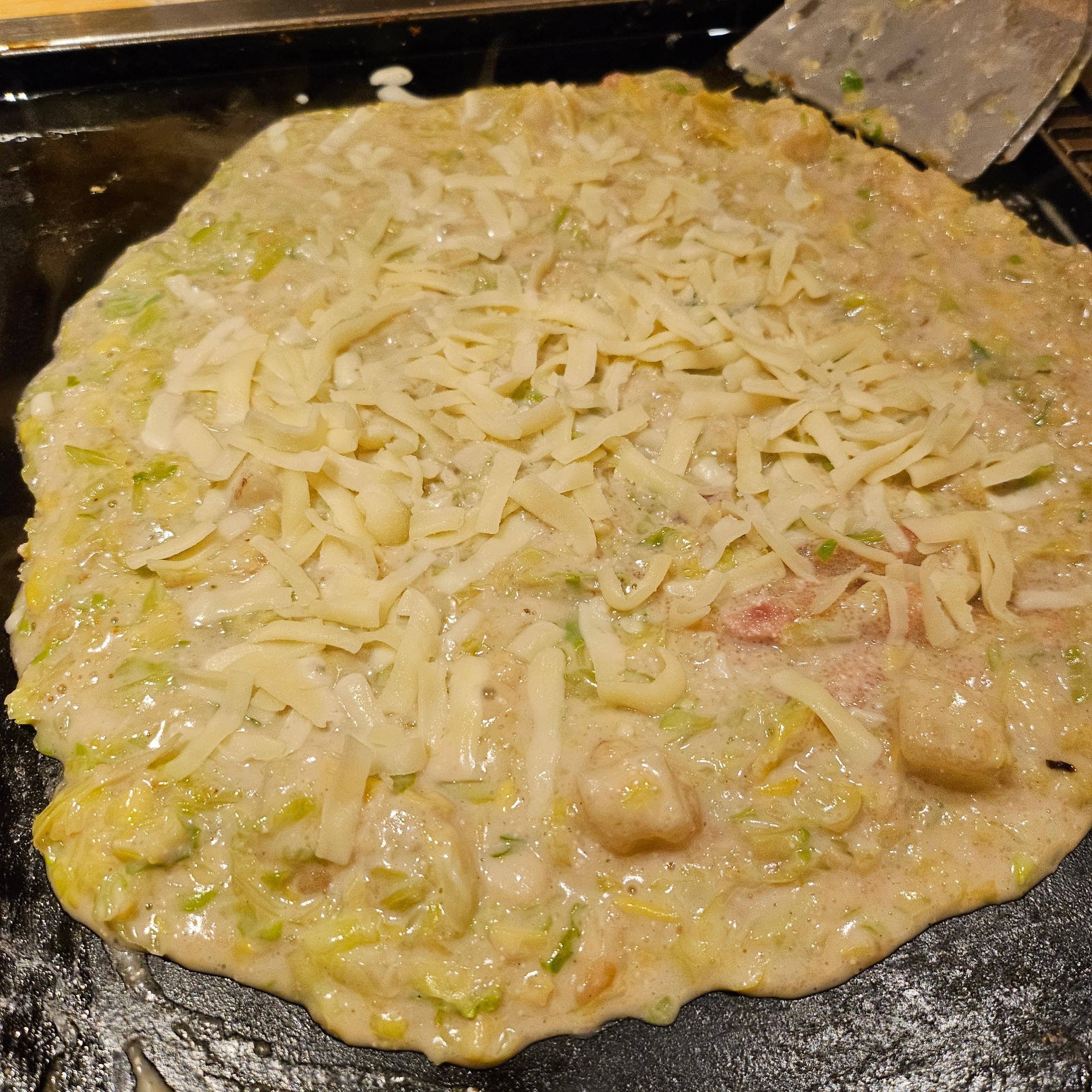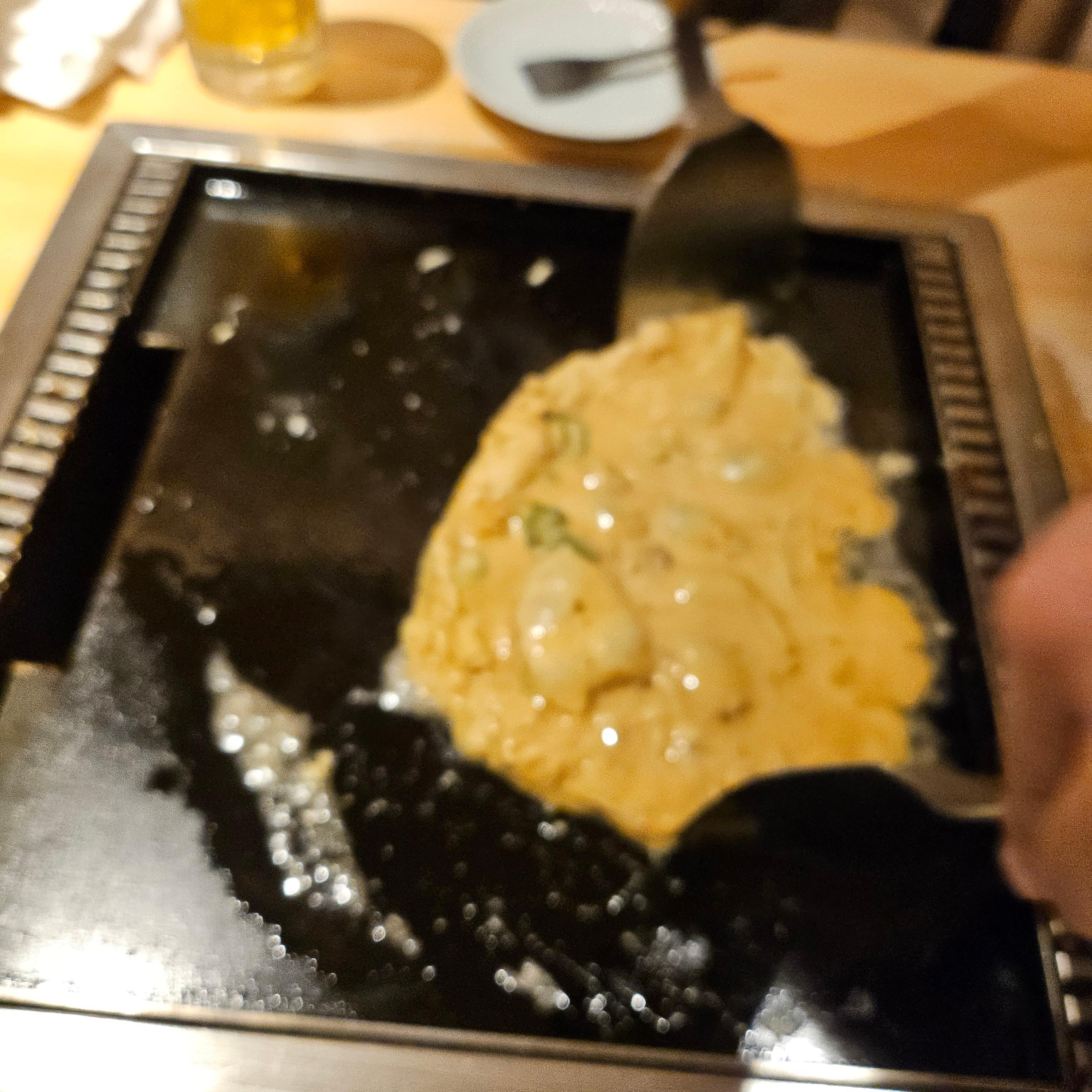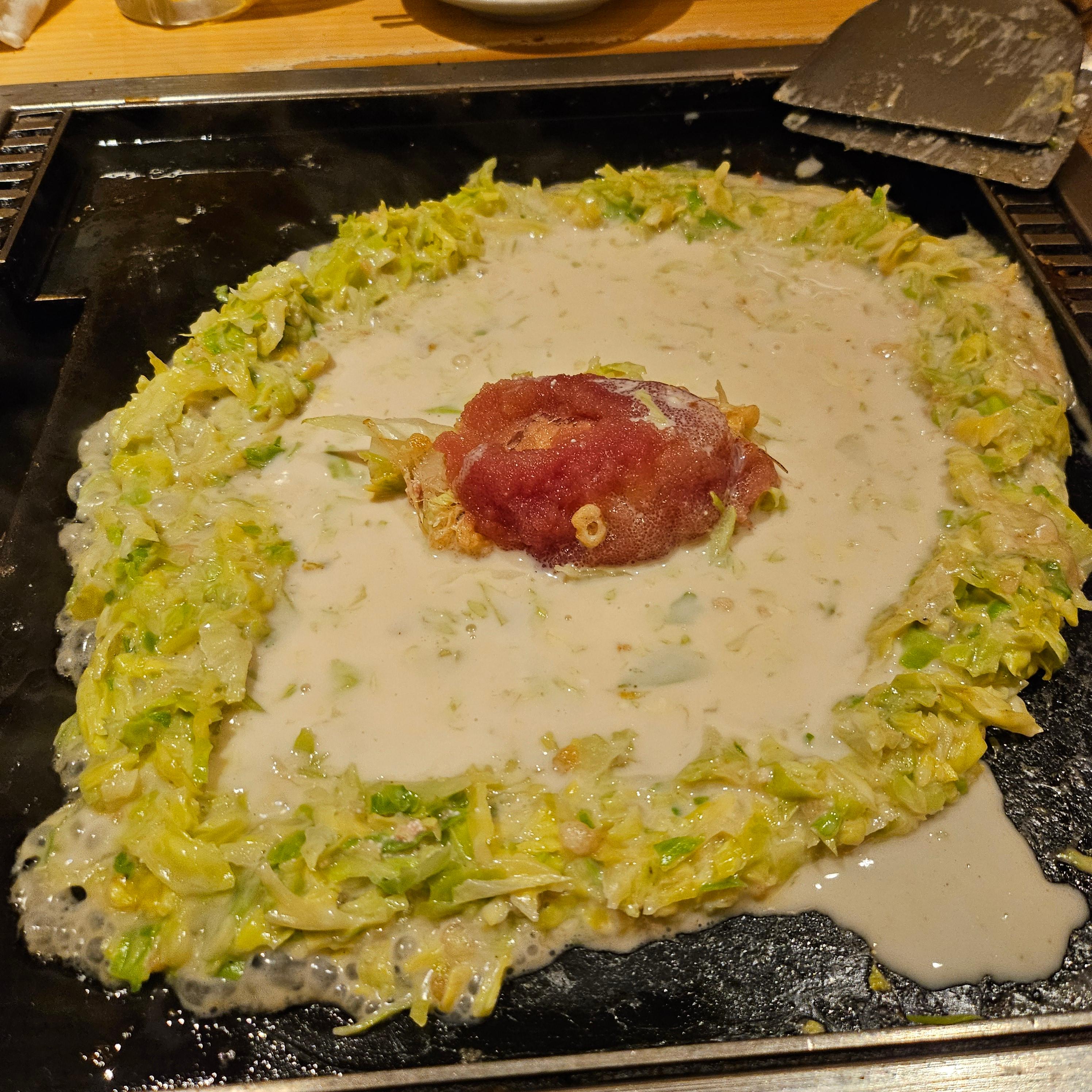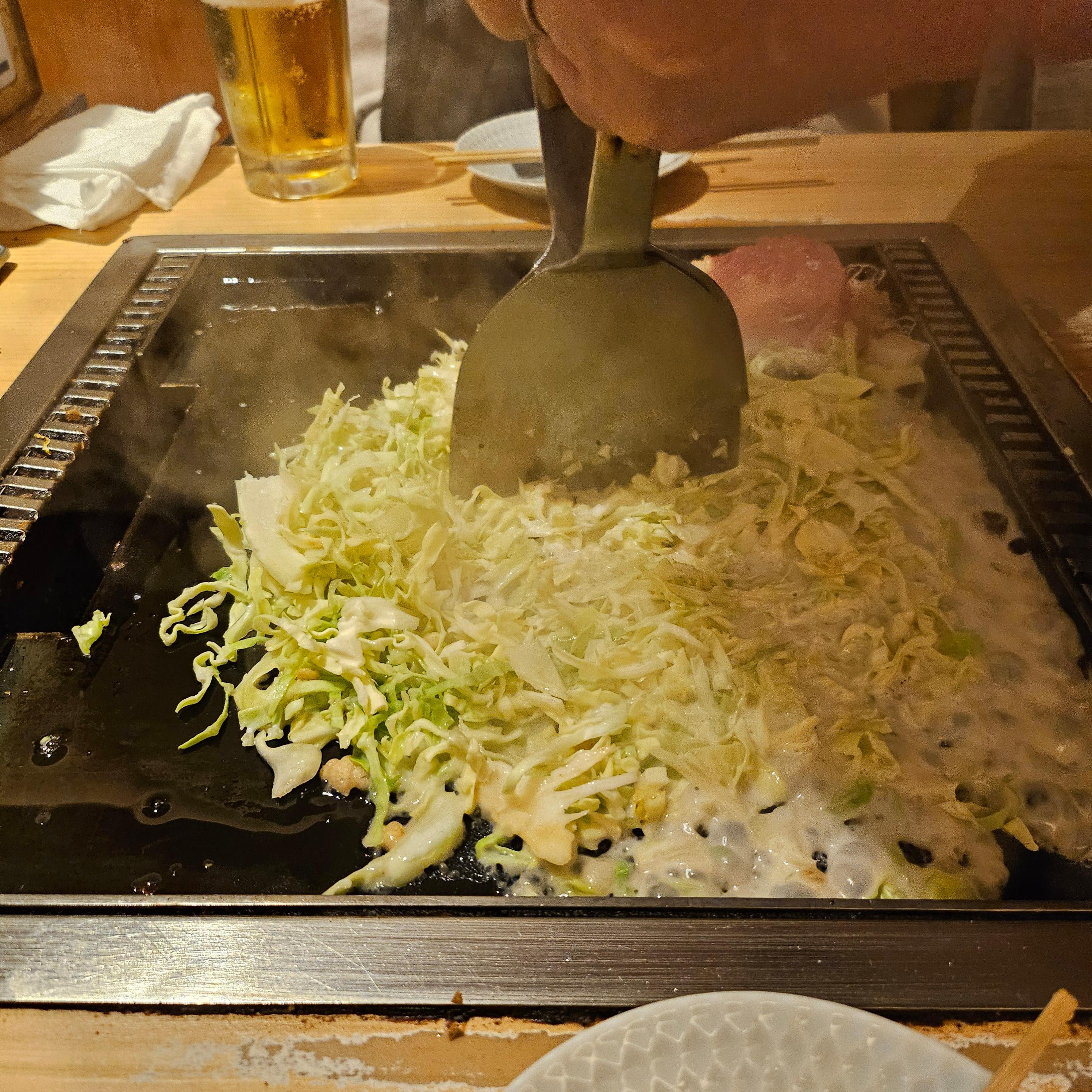 기다리면서 메뉴를 고르고 주문을 했어요. 한국어 메뉴판이 있어서 선택하기 편했답니다. 저는 모찌명란 몬자야끼와 야끼소바를 주문했어요. 몬자야끼는 사실 비주얼만 보면 ‘이게 과연 맛있을까?’ 싶은 비주얼인데, 한 입 먹어보니 생각보다 훨씬 맛있었어요! 쫀득한 모찌와 짭조름한 명란이 어우러져서 고소하면서도 깊은 맛이 나더라고요. 철판 위에서 서서히 익어가는 모습을 보면서 먹으니까 더 맛있게 느껴졌던 것 같아요.
