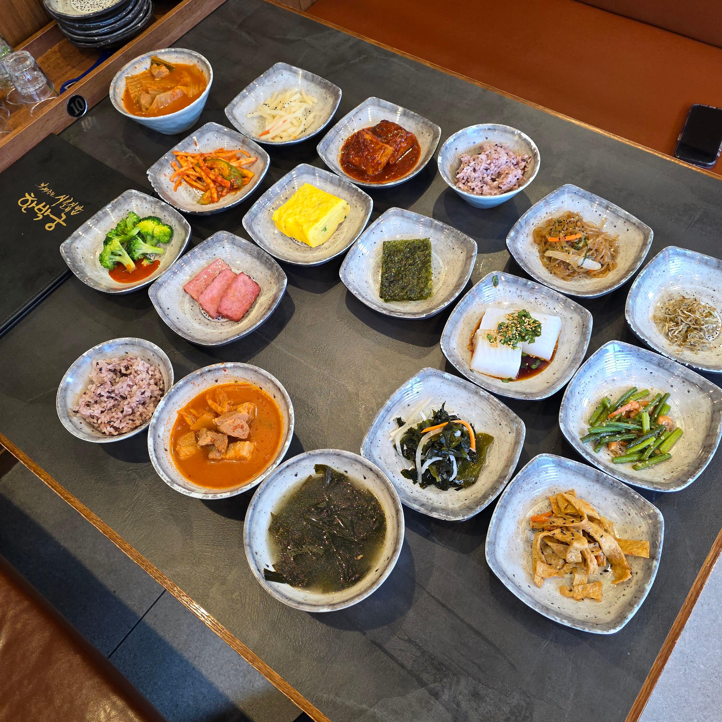 한박궁의 백반은 정해진 틀 없이 매일 반찬 구성이 조금씩 달라진다고 해요. 제가 방문했던 날은 무려 14가지 반찬이 나왔는데요, 초장브로콜리, 햄, 계란말이, 김, 미역무침, 묵, 두부조림, 감자채볶음, 도라지무침, 오뎅볶음, 마늘쫑볶음, 잡채, 멸치볶음 등등, 정말 빠질 게 없는 다양함이었어요. 이 구성만 봐도 단백질, 채소, 식이섬유, 나물까지 균형 잡힌 식단이라는 게 느껴졌고, 특히 기름지고 짠 반찬 없이 하나같이 정갈한 맛이었어요. 정말 집밥 같은 건강한 느낌이 인상 깊었고, 매 반찬마다 손이 가는 건 물론, 밥 두 공기는 기본으로 가능하겠더라고요.