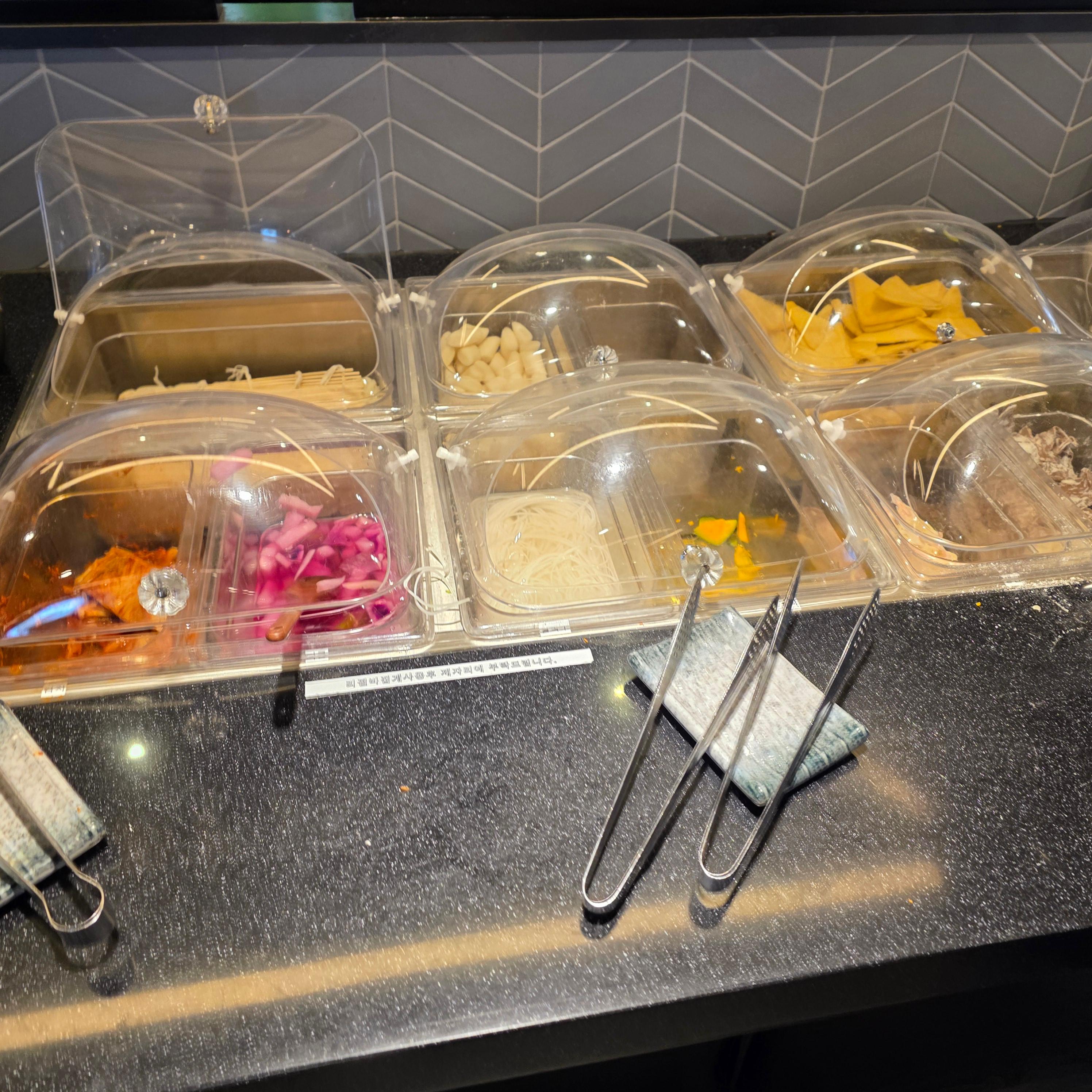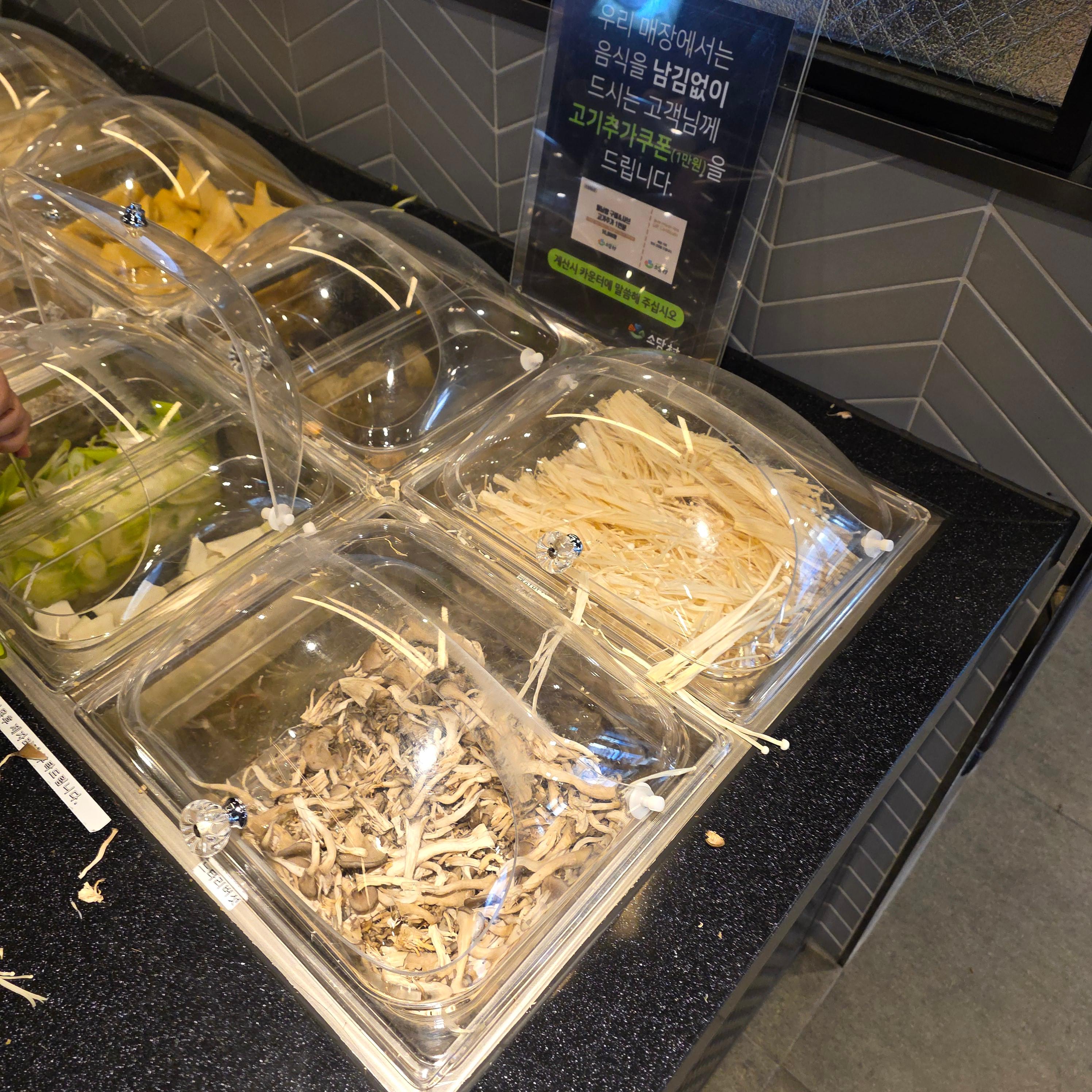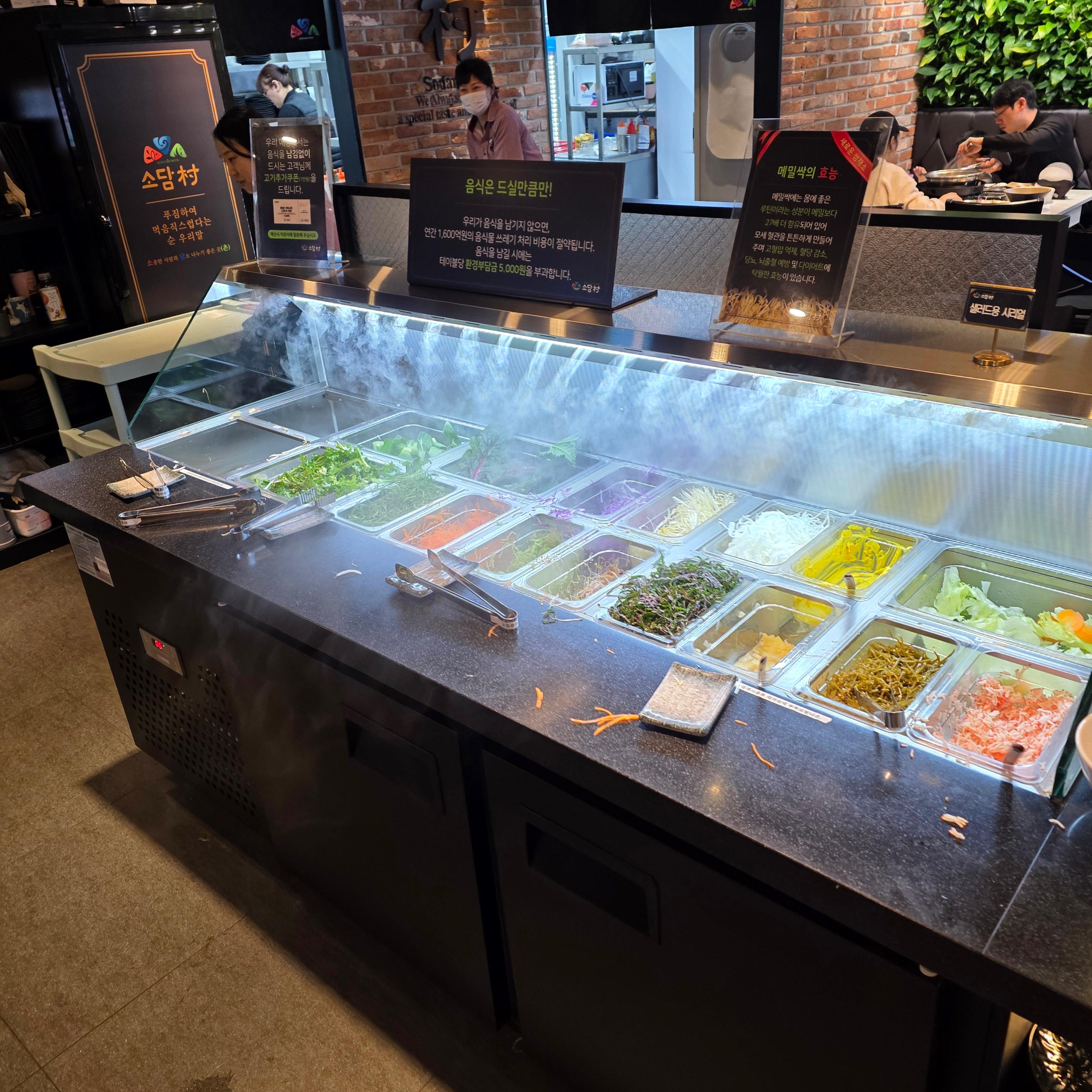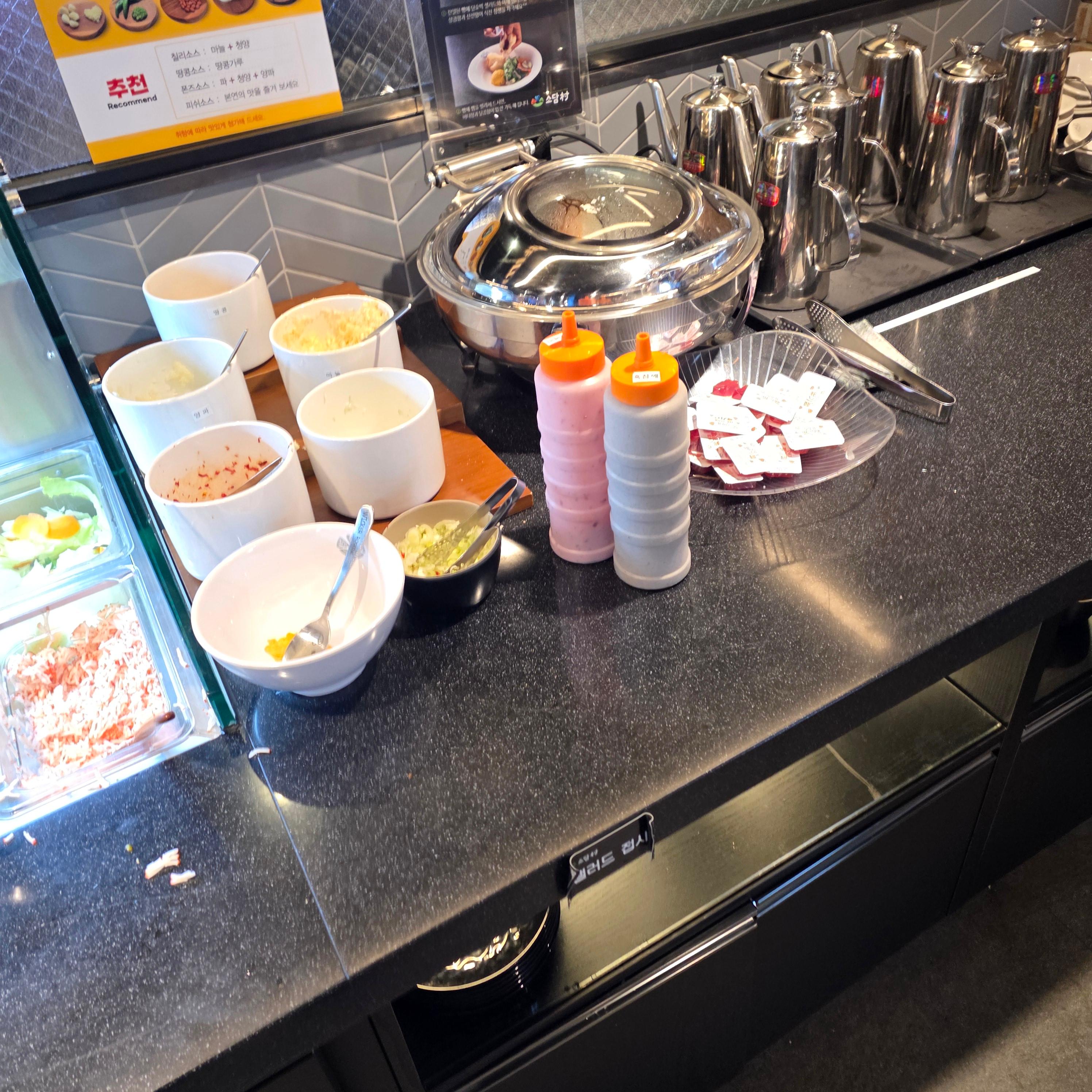 소담촌의 진짜 장점은 고기보다 야채와 월남쌈 재료의 무한리필이라는 거예요. 쌈 채소, 느타리버섯, 쑥갓, 양파, 배추 등등 정말 다양하게 갖춰져 있고, 모자란 재료는 직원분에게 요청만 하면 바로 바로 갖다 주세요. 월남쌈용 라이스페이퍼, 스프링롤용 소스, 마늘간장, 땅콩소스까지 준비되어 있어서 먹는 재미가 가득! 월남쌈을 먹다 보면 고기가 줄어도 아쉽지 않을 정도예요. 전 채소 좋아하는 편인데 진짜 배 터지게 먹고 나왔어요 ㅎㅎ 무한리필이라 해서 아무렇게나 나오지 않고, 재료 상태도 신선하고 정돈되어 있어 더 만족스러웠습니다.