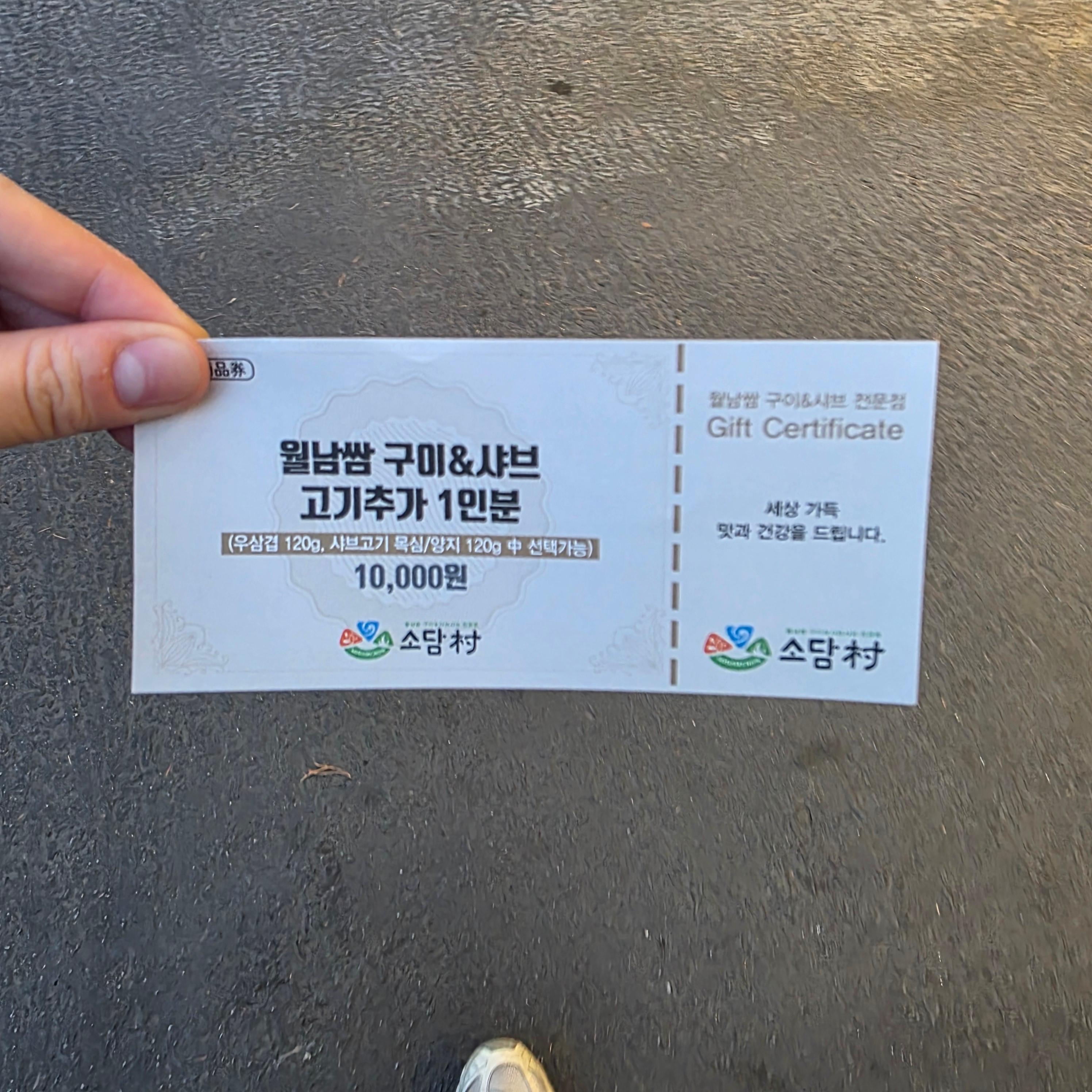 식사를 마무리할 땐 죽재료를 직접 요청해서 셀프로 죽을 만들어 먹는 재미도 있어요. 밥, 계란, 김가루, 쪽파까지 다 준비되어 있고, 육수에 남은 재료 넣고 조물조물 저어가며 죽을 끓이는 재미란... 마무리 식사로 최고입니다. 그리고 이 집만의 특별한 이벤트! 남기지 않고 깨끗하게 먹으면 고기 추가 쿠폰을 줘요 😆 저희는 정말 하나도 안 남기고 먹었더니, 1인 고기 추가 쿠폰 1장을 받았답니다. 다음 방문 때 쓸 수 있으니 더할 나위 없는 보너스! 데이트하면서 둘이 함께 “쿠폰 받자!” 하고 열심히 먹는 것도 소소한 재미였어요.