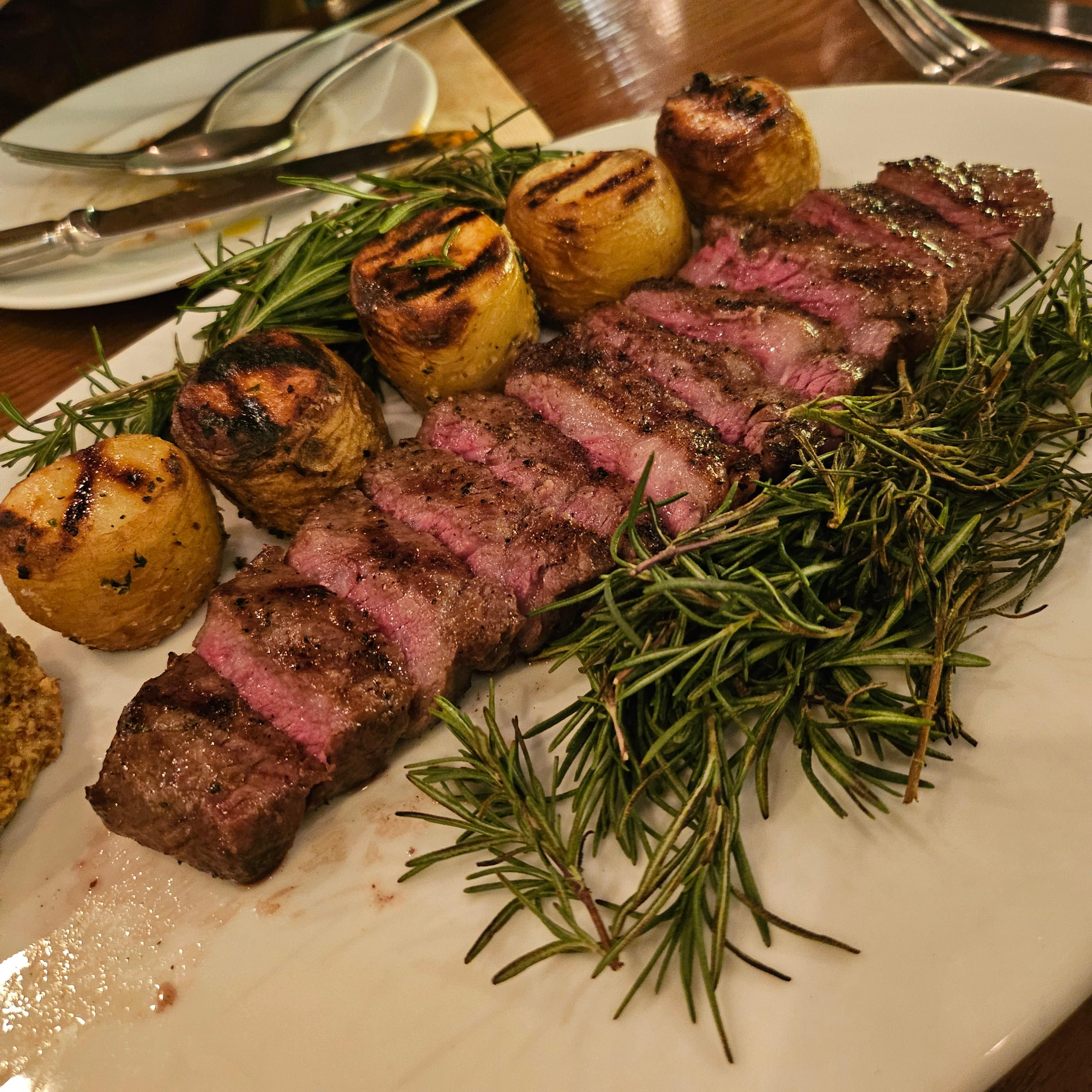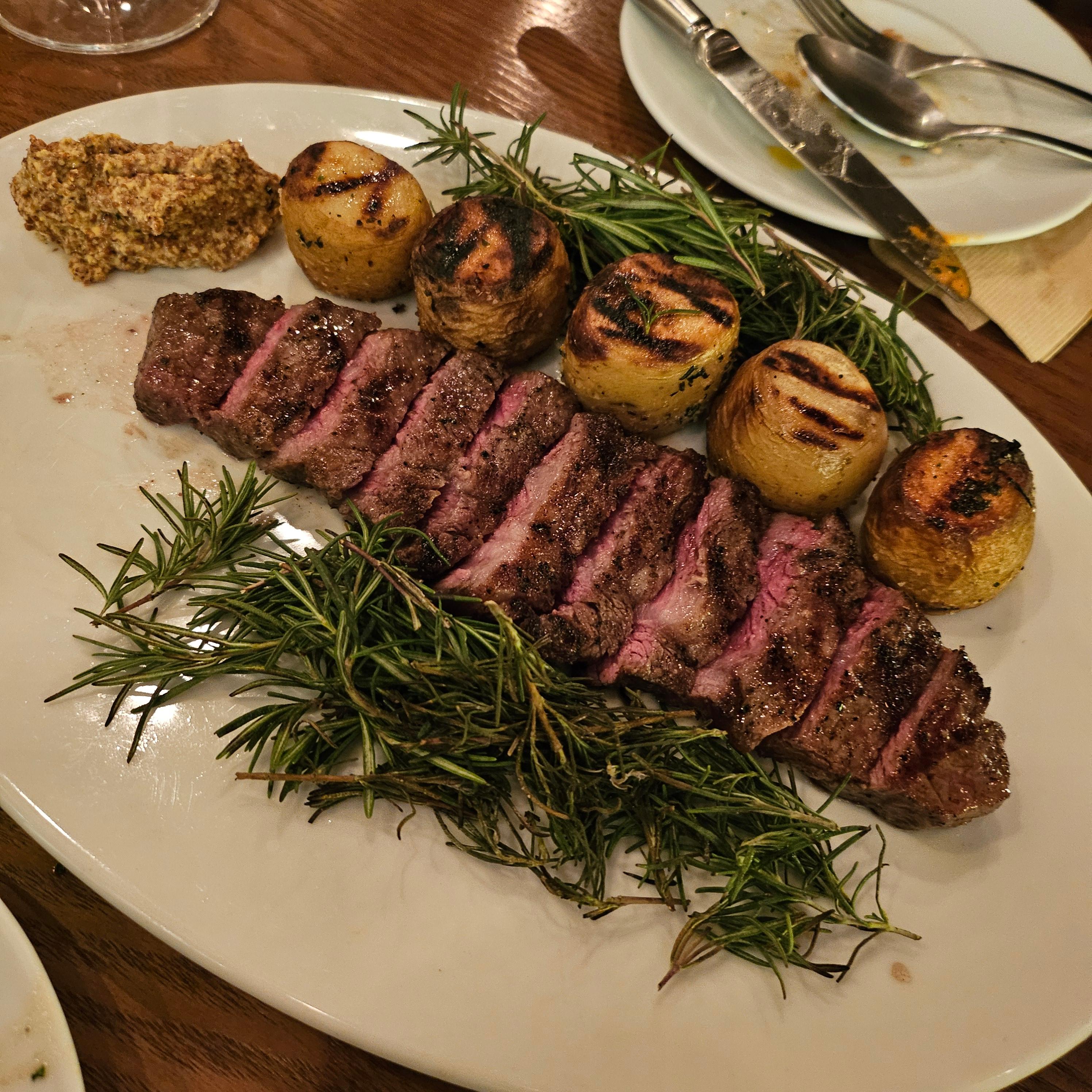 이번엔 스테이크 이야기로 넘어가볼게요. 주문한 스테이크는 로즈마리 훈연 방식으로 조리되어 고기 자체의 풍미에 향긋한 허브 향이 스며들어 있었어요. 처음 한 입 베어물었을 때의 느낌은 정말 감동이었어요. 겉은 바삭하고 안은 육즙이 가득 찬 미디움 레어 상태로, 씹을수록 고기 본연의 맛이 살아나고, 로즈마리의 향이 코끝에 맴돌며 식욕을 자극했답니다. 특히 플레이팅도 감각적이어서, 접시를 받는 순간부터 “와 이건 사진 찍고 먹어야겠다”라는 말이 절로 나왔어요. 이탈리안 레스토랑에서 퀄리티 높은 스테이크를 즐기고 싶다면, 합정데이트추천 코스에서 이 스테이크는 필수입니다.