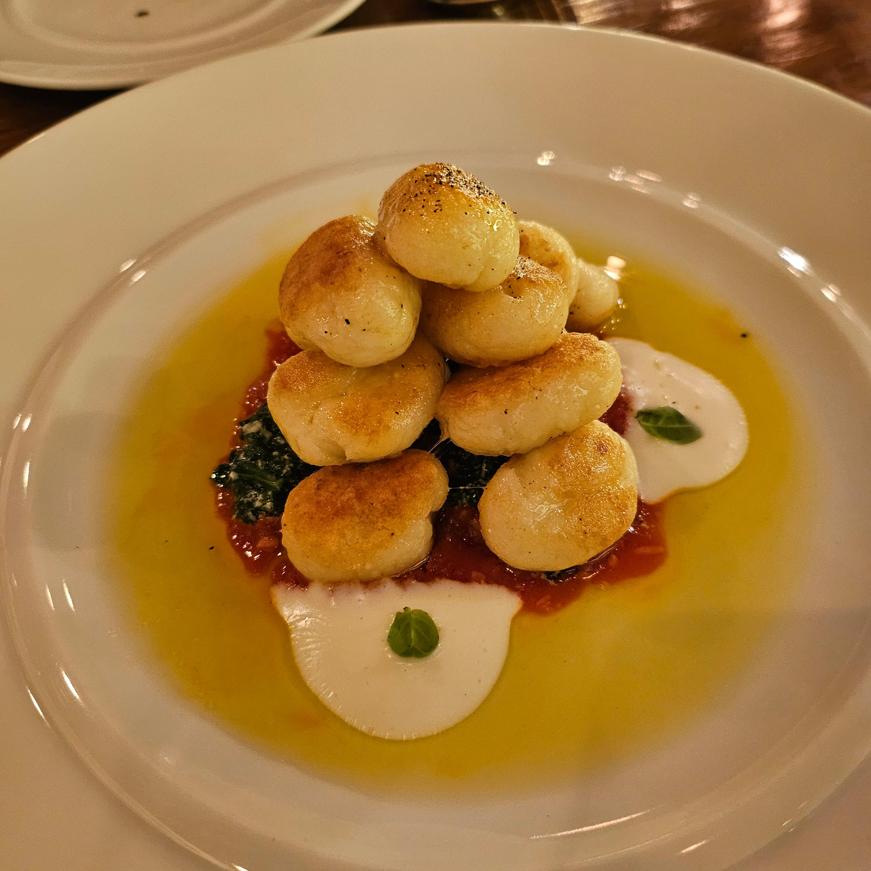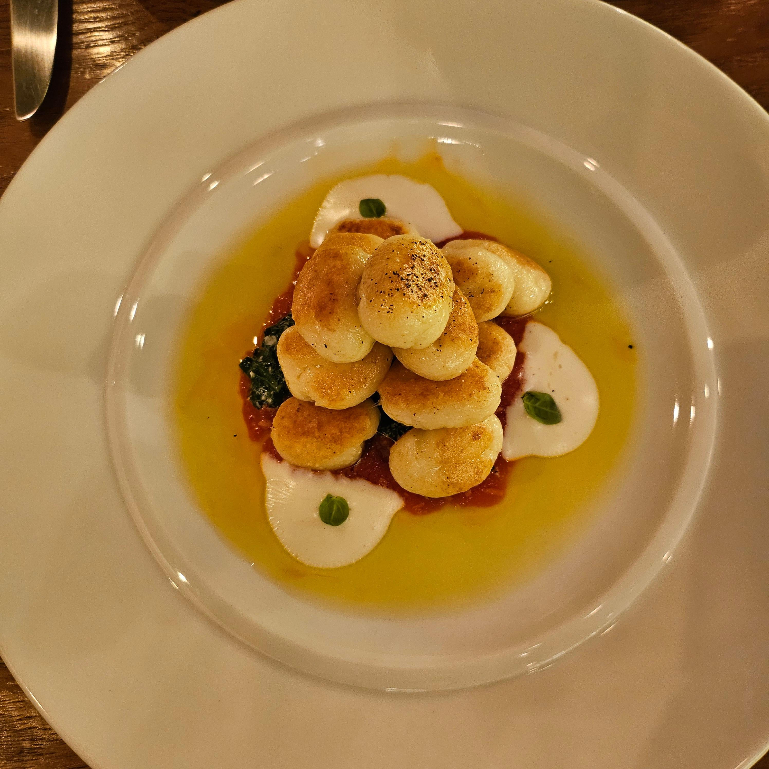사실 이번 방문에서 가장 인상 깊었던 메뉴가 뇨끼였어요. 개인적으로 뇨끼는 처음 먹어봤는데, 어쩜 이리 쫀득하고 부드러운 식감일 수 있을까요? 작고 동글동글한 감자 반죽이 입안에서 말랑하게 퍼지는데, 크림소스와 버터의 고소함이 어우러져 정말 감탄이 절로 나왔답니다. 한 입 베어 물면 그 고소한 풍미가 퍼지고, 혀 위에 살짝 느껴지는 치즈의 깊은 맛이 완벽하게 조화를 이루더라고요. 샐러드나 다른 음식과도 잘 어울려서 식전에도, 식중에도 부담 없이 곁들일 수 있었어요. 이 메뉴는 꼭 다시 먹고 싶은 맛이었고, 뇨끼에 대한 편견이 있다면 오스테리아 샘킴에서 꼭 재도전해보시길 추천드려요!