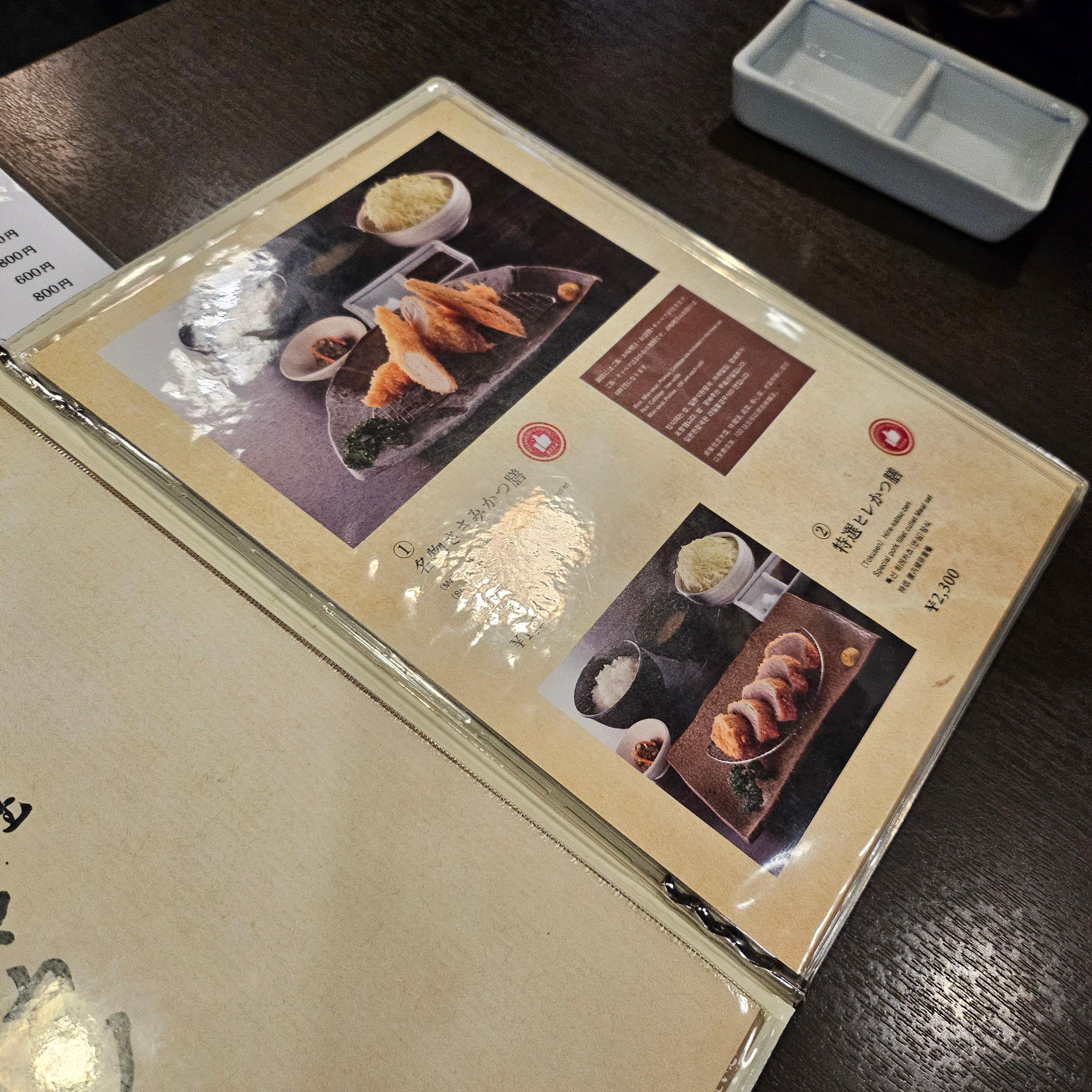 자리에 앉고 나면 메뉴판이 제공되는데, 이미 마음은 정해져 있었어요. 저는 닭가슴살카츠 세트와 등심카츠 세트, 그리고 포장용 가츠산도를 주문했습니다. 가츠산도는 공항 가기 전 간식으로 먹으려고 미리 요청했더니 식사 마칠 즈음에 맞춰 포장해서 주시더라고요. 센스 있게 타이밍 맞춰주는 게 정말 좋았어요. 테이블 세팅도 깔끔했고, 샐러드와 소스, 밥과 된장국, 절임류 반찬이 같이 나와서 일본 정식 느낌을 제대로 낼 수 있었어요. 소스는 고기와 샐러드 각각에 맞는 맛이었고, 고기와의 조화가 아주 좋았어요. 기본 구성만으로도 만족스러웠고, 메인 메뉴들이 하나하나 훌륭해서 곧 설명드릴게요!