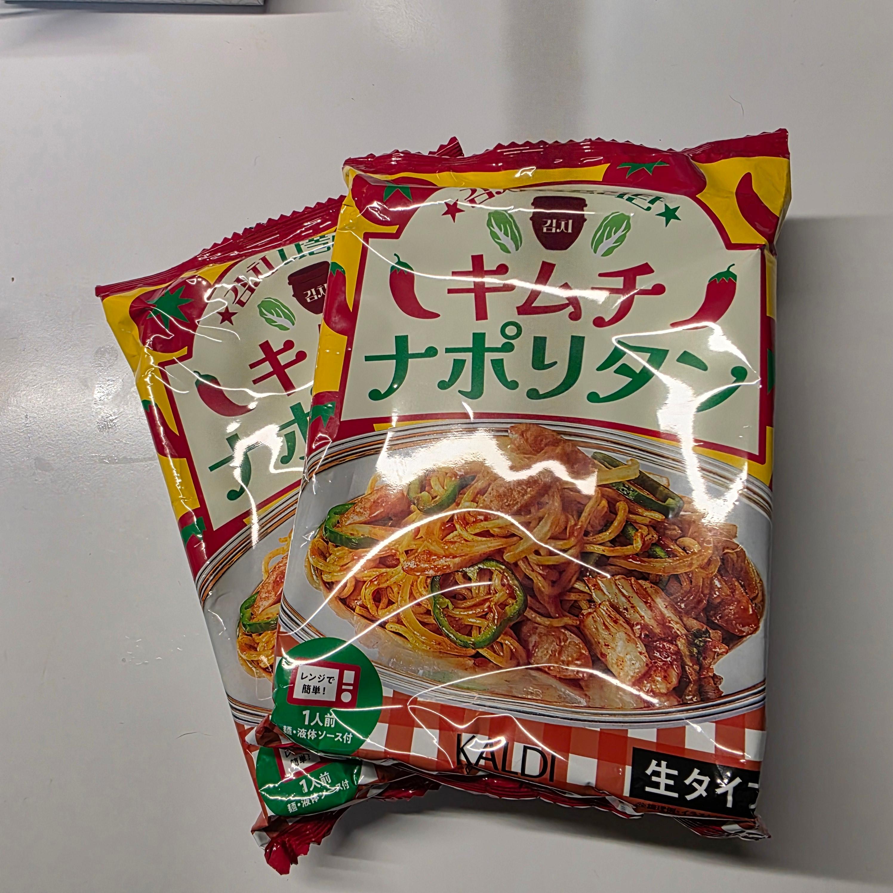 일본에 가면 꼭 들르게 되는 칼디 코피팜. 이곳은 원두와 스프레드, 조미료뿐 아니라 이색 밀키트 라인업도 정말 매력적이죠. 다양한 나라의 식문화를 쉽게 즐길 수 있도록 패키징된 제품들이 많아서, 마치 ‘식재료 편집숍’ 같은 느낌이에요. 그날도 한참 구경하다가 눈에 띈 것이 바로 김치나폴리탄 밀키트. 이름부터 시선을 사로잡는 이 제품은, 한쪽에는 진한 빨간색의 나폴리탄 파스타 이미지가, 다른 한쪽에는 ‘KIMCHI’라고 쓰인 라벨이 붙어 있었어요. 이건 그냥 지나칠 수 없다… 싶어 고민도 없이 바로 장바구니에 넣었습니다. 가격은 300~400엔대로 부담 없었고, 보관도 상온 가능이라 여행 중에도 들고 다니기 편했어요. 칼디답게 디자인도 깔끔하고 귀엽고, 소장 욕구를 자극하는 느낌이었답니다!