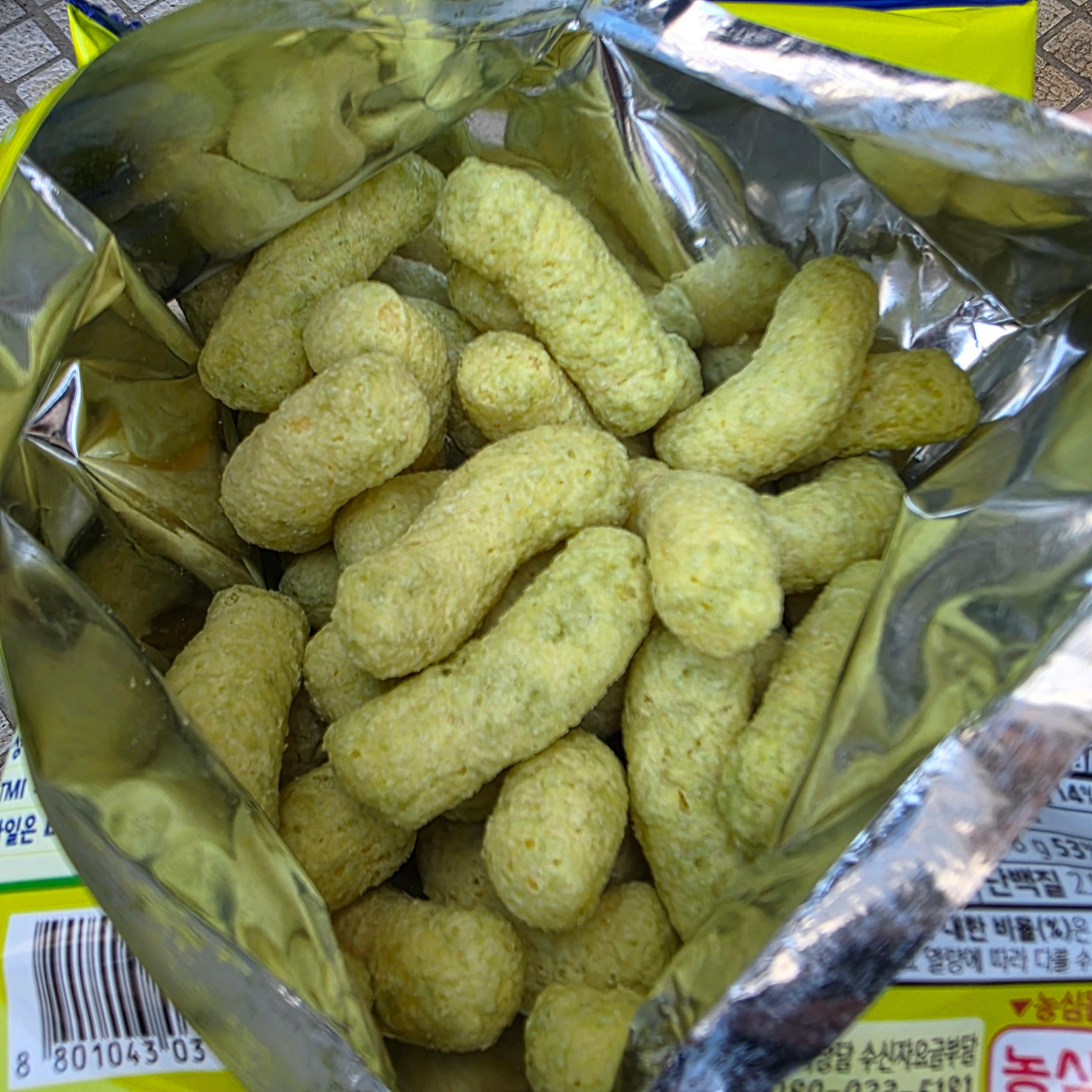 이 부분은 꼭 말씀드리고 싶어요. 메론킥의 비주얼은 조금 아쉬웠습니다. 노란빛이 섞인 연두색이라고 표현하면 될까요? 그런데 이게 보기엔 조금… 식욕을 떨어뜨리는 색이더라고요. 특히 기존 바나나킥의 노릇노릇한 색감을 생각하던 분들에게는 다소 낯설게 느껴질 수도 있어요. 포장지만 보면 메론맛에 대한 기대가 확 들게 만드는데, 정작 과자 자체의 색상은 그 기대에 부응하지 못하는 느낌이었어요. 물론 맛이 모든 걸 커버하긴 했지만, 색이 예쁘지 않아서 사진 찍기엔 애매한 비주얼이라는 생각이 들었답니다.