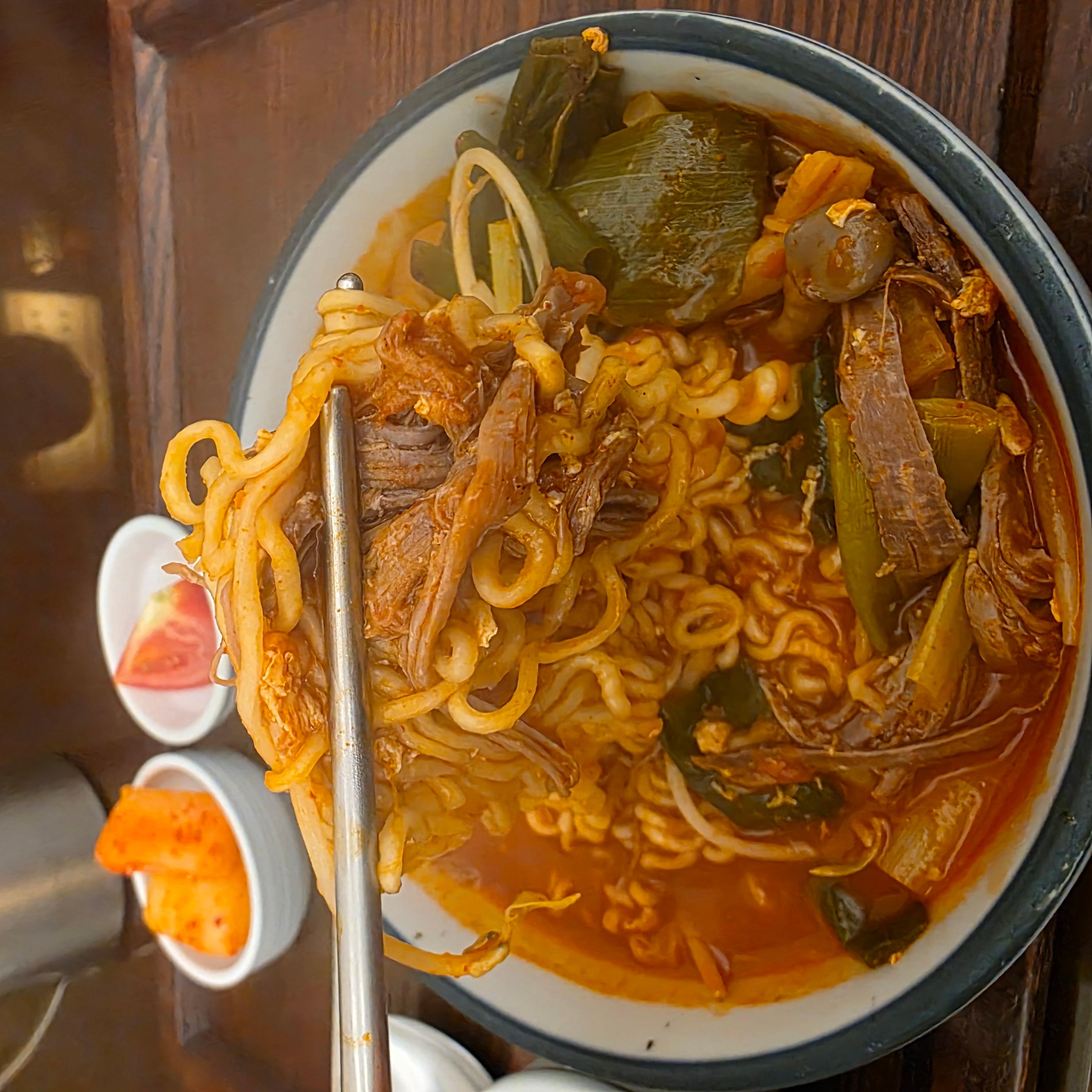 자, 이제 중요한 육라면의 맛을 말씀드릴게요. 첫 숟가락을 떠먹었을 때 ‘오! 엄청 강렬한 맛은 아니네?’ 싶었어요. 우리가 흔히 생각하는 자극적인 육개장이 아니라서 처음엔 다소 밍밍하다고 느껴질 수 있어요. 근데 그게 이 집의 매력이더라고요.