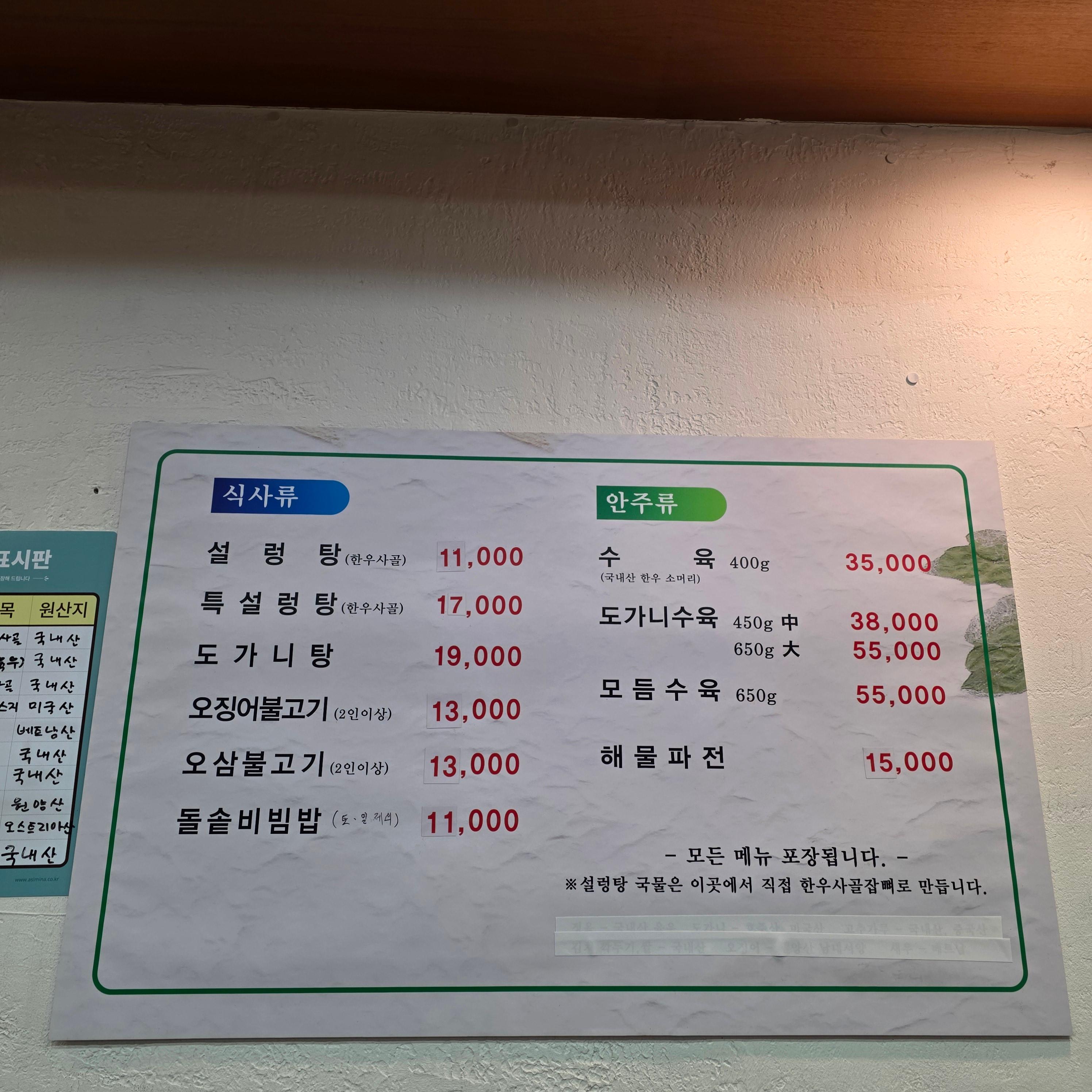 메뉴판을 보면 설렁탕 외에도 다양한 메뉴가 있는데요, 설렁탕 11,000원, 특설렁탕 17,000원, 도가니탕 19,000원 등 국물류부터, 오징어불고기·오삼불고기(각 13,000원), 돌솥비빔밥(11,000원)까지 꽤 다양하게 준비돼 있어요. 수육류(35,000원부터)와 해물파전까지 있어서 소주 한 잔 기울이기에도 좋은 메뉴 구성!