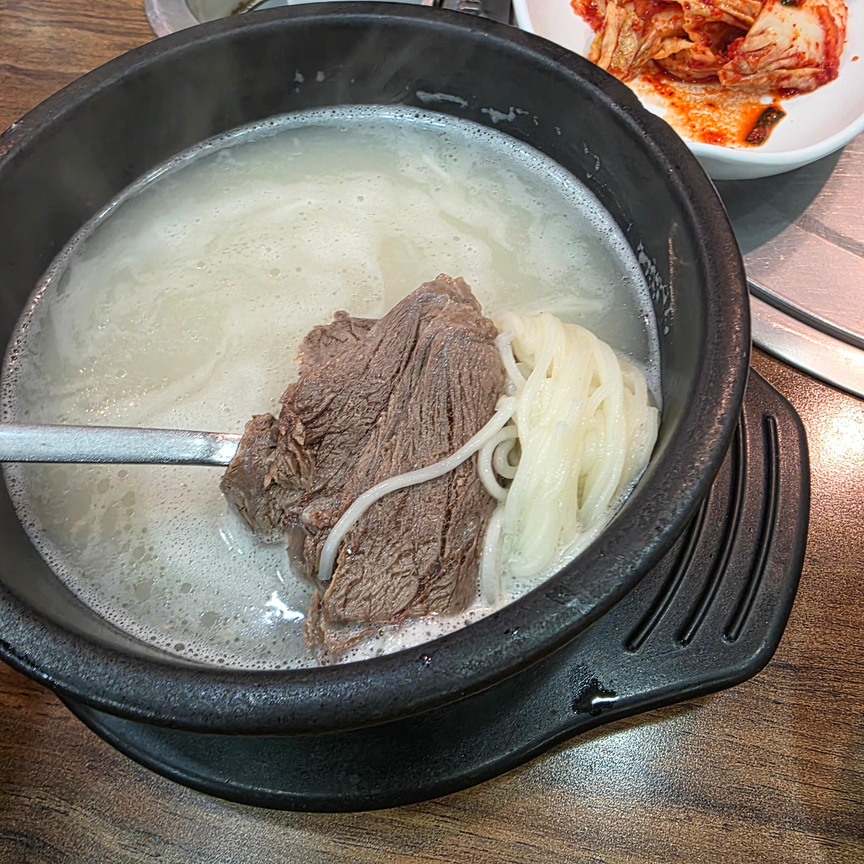 이번 방문에선 설렁탕 2인분을 주문했어요. 서래옥은 직접 한우 사골 잡뼈를 고아 만든 국물을 사용한다고 하는데, 한 숟갈 떠먹는 순간 “와... 진짜 보양된다”는 느낌이 팍 왔어요. 저는 평소 양천구 푸주옥을 자주 다니는 편인데, 거기보다 조금 더 맑고 가벼운 느낌이면서도 깊은 맛이 살아있더라고요. 푸주옥은 좀 더 진득~한 국물이고, 서래옥은 한결 깔끔하게 다가오는 스타일! 개인적으로는 이 날 먹은 국물이 너무 만족스러워서… 지금도 생각날 정도예요.ㅎㅎ