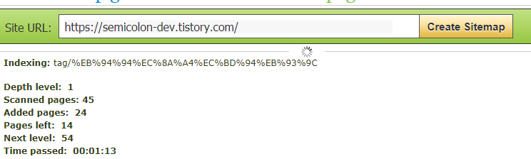 이 곳에 접속해서 주소를 넣는 곳에 본인의 티스토리 주소를 넣은 뒤 Create sitemap 버튼을 누르면 열심히 분석을 시작한다.