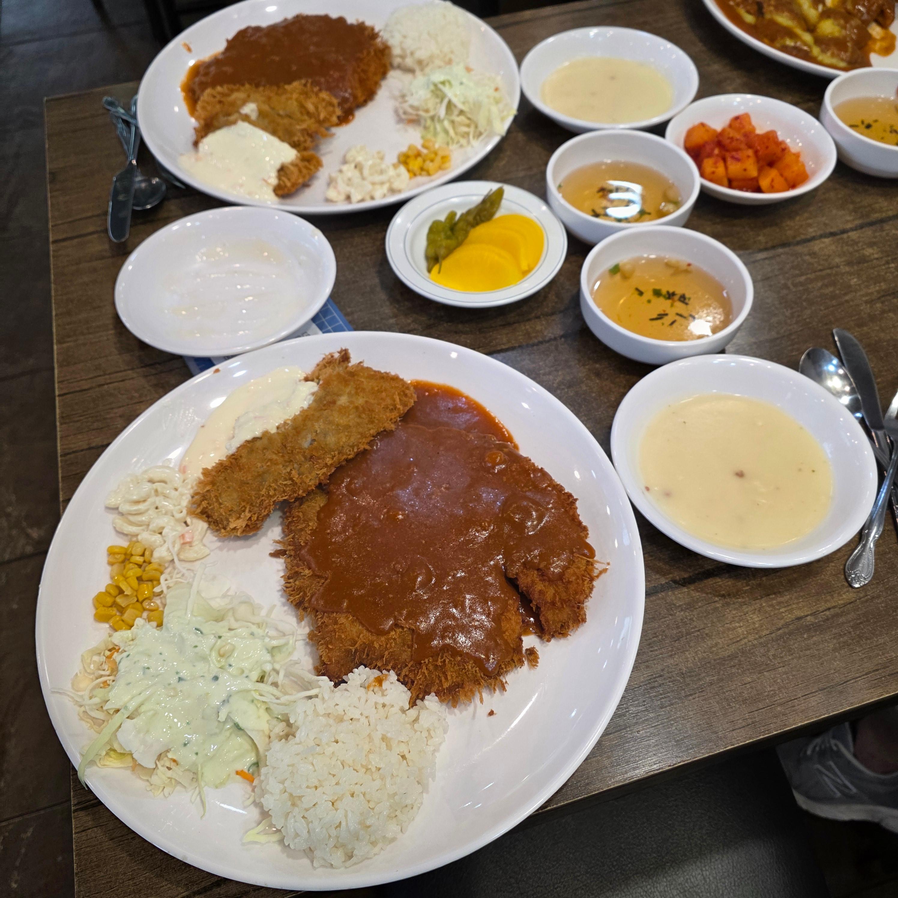 제가 주문한 메뉴는 모둠돈까스였는데요, 이름 그대로 돈까스와 생선까스를 모두 맛볼 수 있는 메뉴예요. 한 접시에 꽉 찬 구성이 눈을 사로잡고, 배도 제대로 채워주는 메뉴였습니다. 접시는 일반 식당보다 훨씬 커서 먼저 놀라고, 위에 얹힌 큼직한 돈까스와 두툼한 생선까스에 또 한 번 놀랐어요. 특히 생선까스는 폭신한 식감과 바삭한 튀김옷이 인상적이었고, 생선 살이 생각보다 훨씬 두툼해서 놀랐어요. 일반 생선까스는 얇거나 비린 경우가 있는데, 여긴 비린 맛도 전혀 없고 고급스러운 맛이 나요. 같이 간 동료 중 한 명은 생선까스를 더 좋아한다며 다음에 생선까스 단품만 먹겠다고 할 정도였어요. 돈까스도 고기 두께가 적당하고, 튀김옷은 바삭한데 느끼하지 않아서 무난하게 맛있는 스타일이었어요. 밥, 샐러드, 국물까지 함께 나오는 구성이라 한 끼 식사로 아주 만족스러웠습니다.