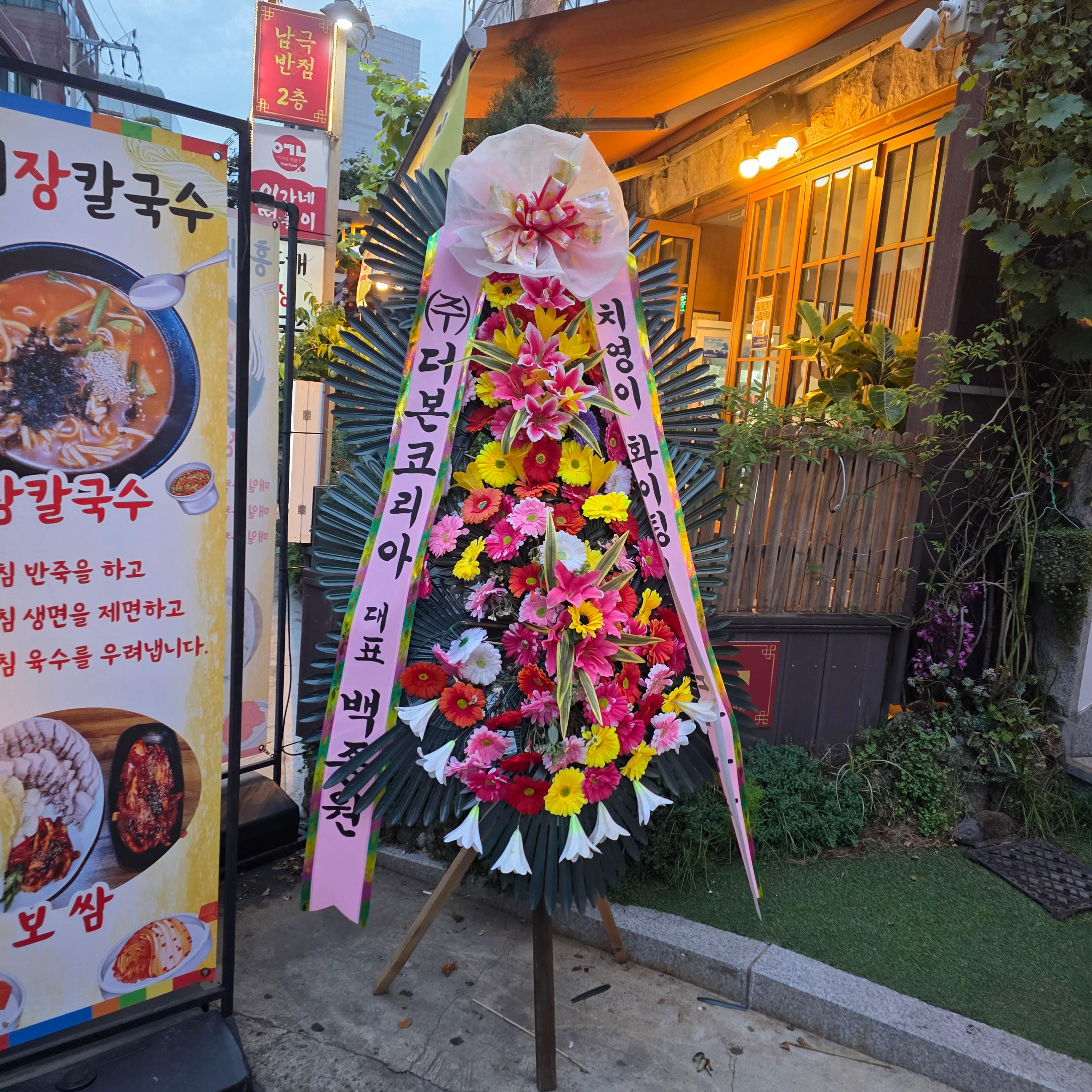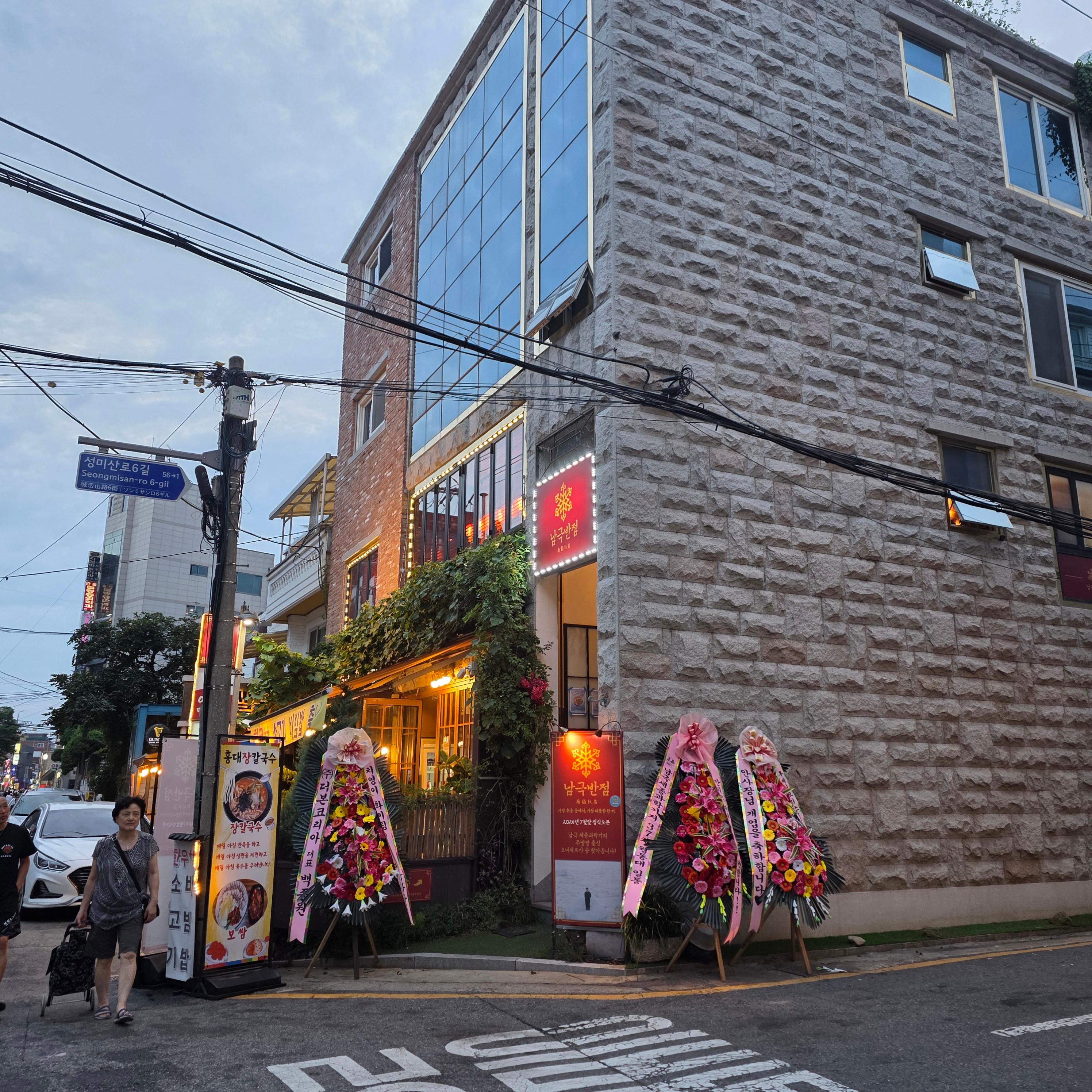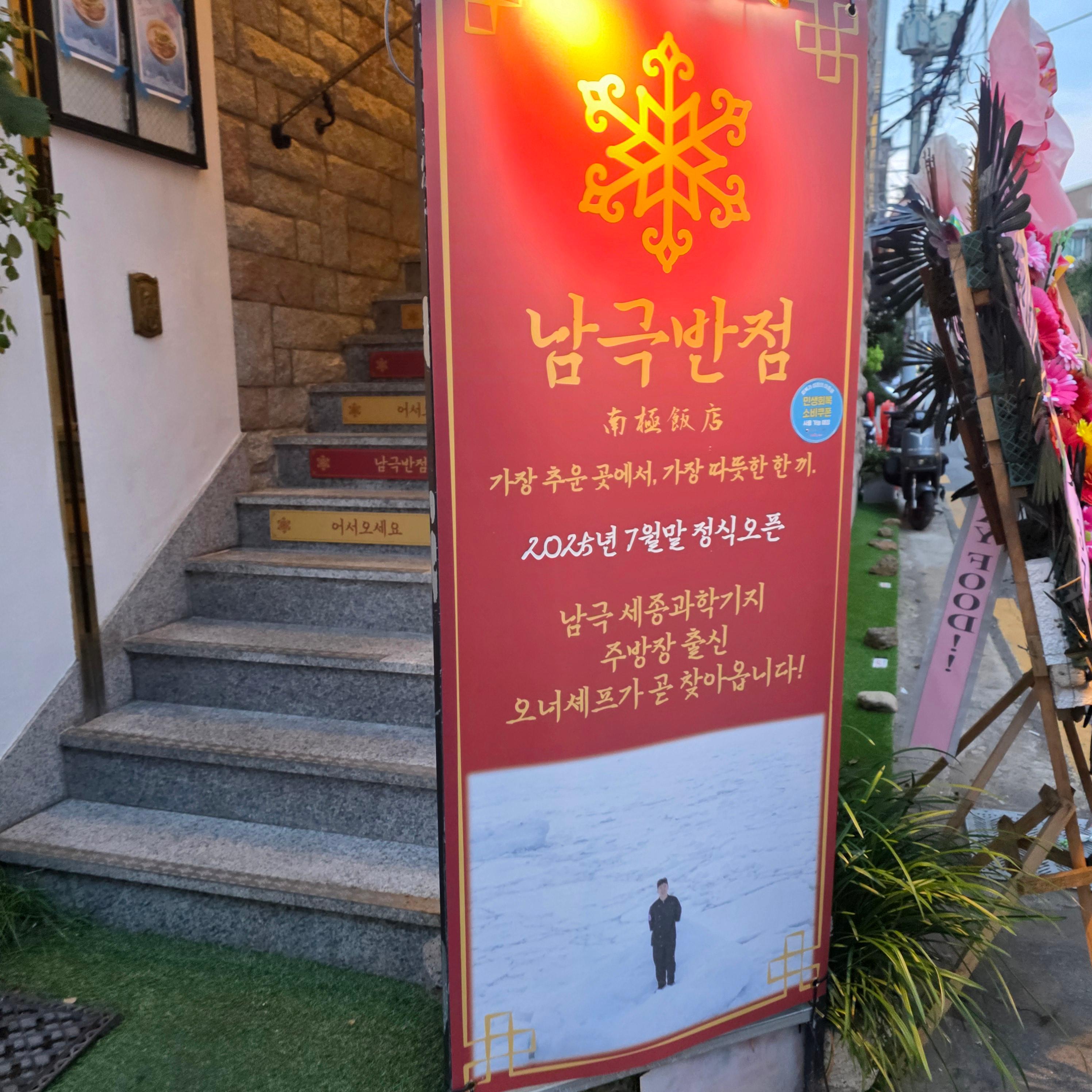 남극반점은 7월 말에 새로 문을 연 서교동 신상중국집으로, 예전 우육면집 한상팔삼이 있던 2층 자리에 그대로 들어섰어요. 가게 인테리어와 집기는 거의 그대로 사용하는 듯했는데, 이런 부분 덕분인지 익숙한 느낌이 들더라고요. 흥미로웠던 점은 백종원이 보낸 화환이 눈에 띄었다는 것! 아마 사장님과 친분이 있는 듯했어요. 가게 이름인 '남극반점'은 셰프님이 과거 남극에서 요리사로 일했던 이력이 있어서 붙여진 이름이라고 합니다. 독특하면서도 기억에 확 남는 이름이더라고요. 내부는 1인석도 준비되어 있어 점심 장사에도 신경을 쓴 듯 보였고, 혼자 방문해도 부담 없이 식사할 수 있는 구조였어요. 오픈한 지 얼마 안 됐음에도 벌써 서교동에서 신상 맛집으로 입소문을 타는 분위기가 느껴졌습니다.