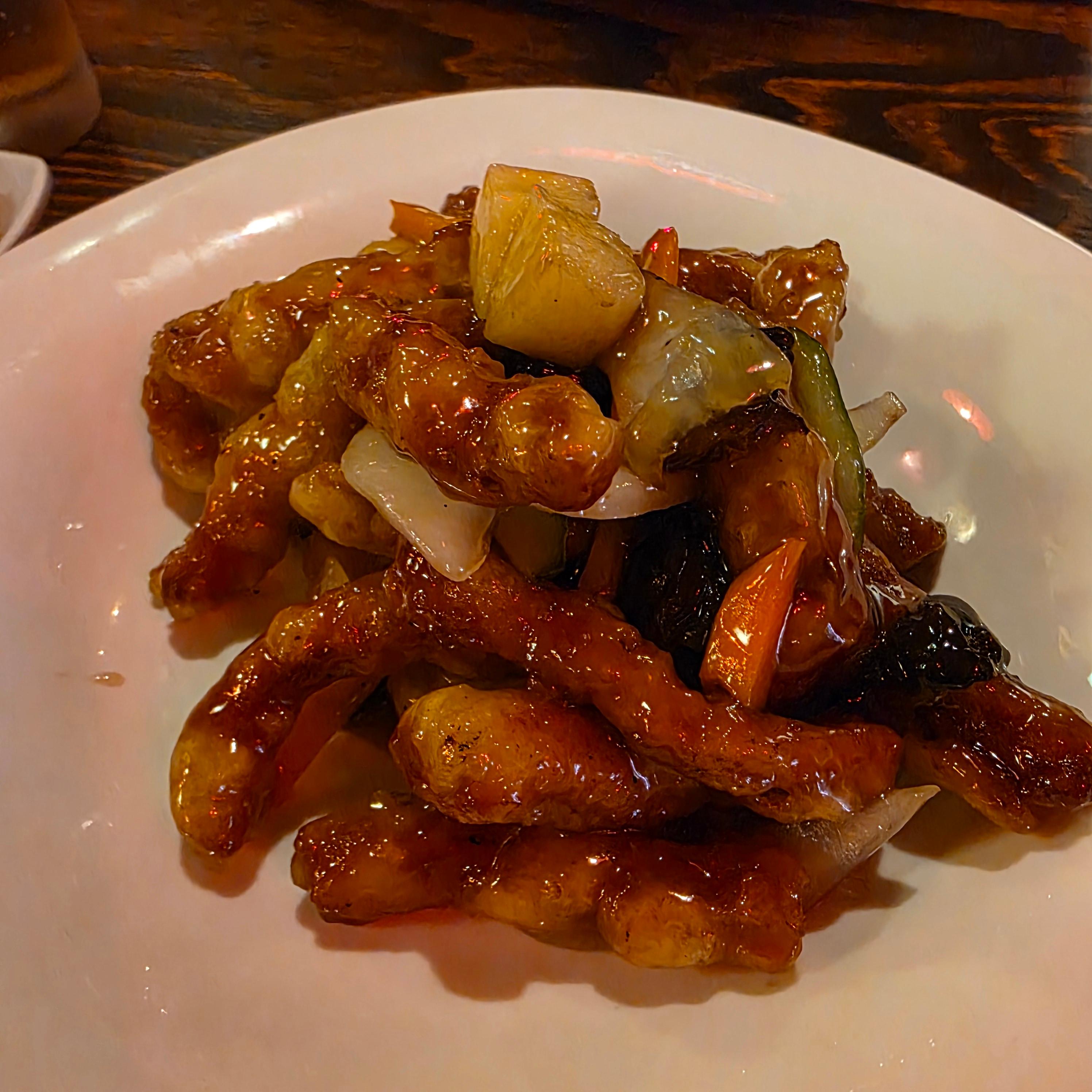남극반점에서 가장 먼저 주문한 메뉴는 마늘탕수육이었어요. 가격은 19,000원으로, 소스에 푹 잠기는 부먹 스타일이 아니라 소스에 빠르게 볶아내는 ‘볶먹’ 방식이었어요. 덕분에 튀김의 바삭함이 살아있으면서도 소스가 골고루 배어 있어 아주 별미였습니다. 왜 마늘탕수육인지 정확히는 모르겠지만, 마늘향이 은은하게 풍겨 고기의 풍미를 더해주더라고요. 겉은 바삭하고 속은 촉촉하게 유지된 식감이 정말 만족스러웠어요. 보통 탕수육은 찍먹과 부먹의 취향 차이가 갈리기 마련인데, 이곳은 그 중간 지점인 볶먹 스타일로 모두가 만족할 수 있는 맛을 완성한 듯했어요. 다음번에 방문하면 마늘탕수육은 아마도 무조건 다시 주문하게 될 것 같아요. 기본 반찬으로 단무지와 짜사이가 나왔는데, 짜사이가 특히 탕수육과 잘 어울려 곁들임으로 먹기 딱 좋았습니다.