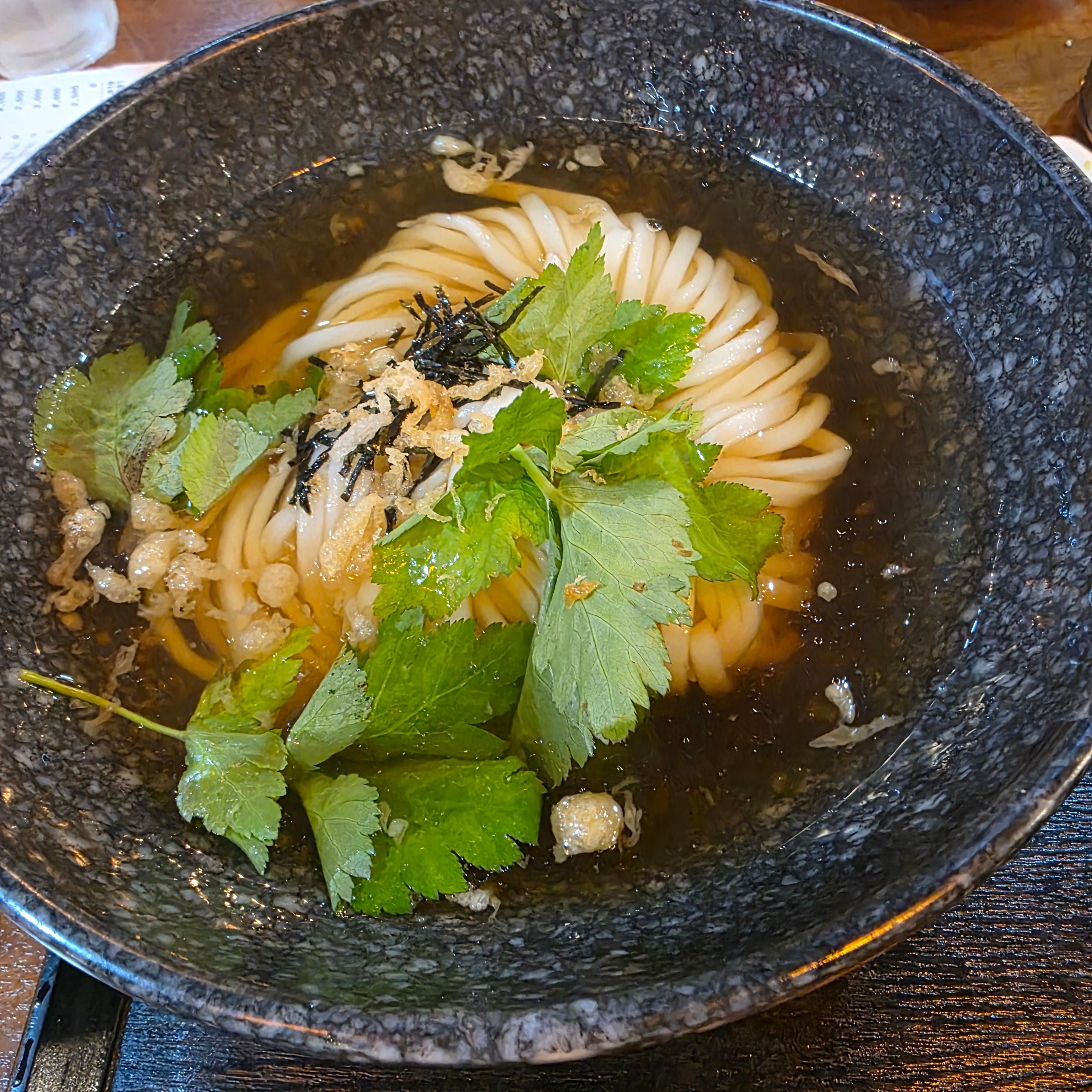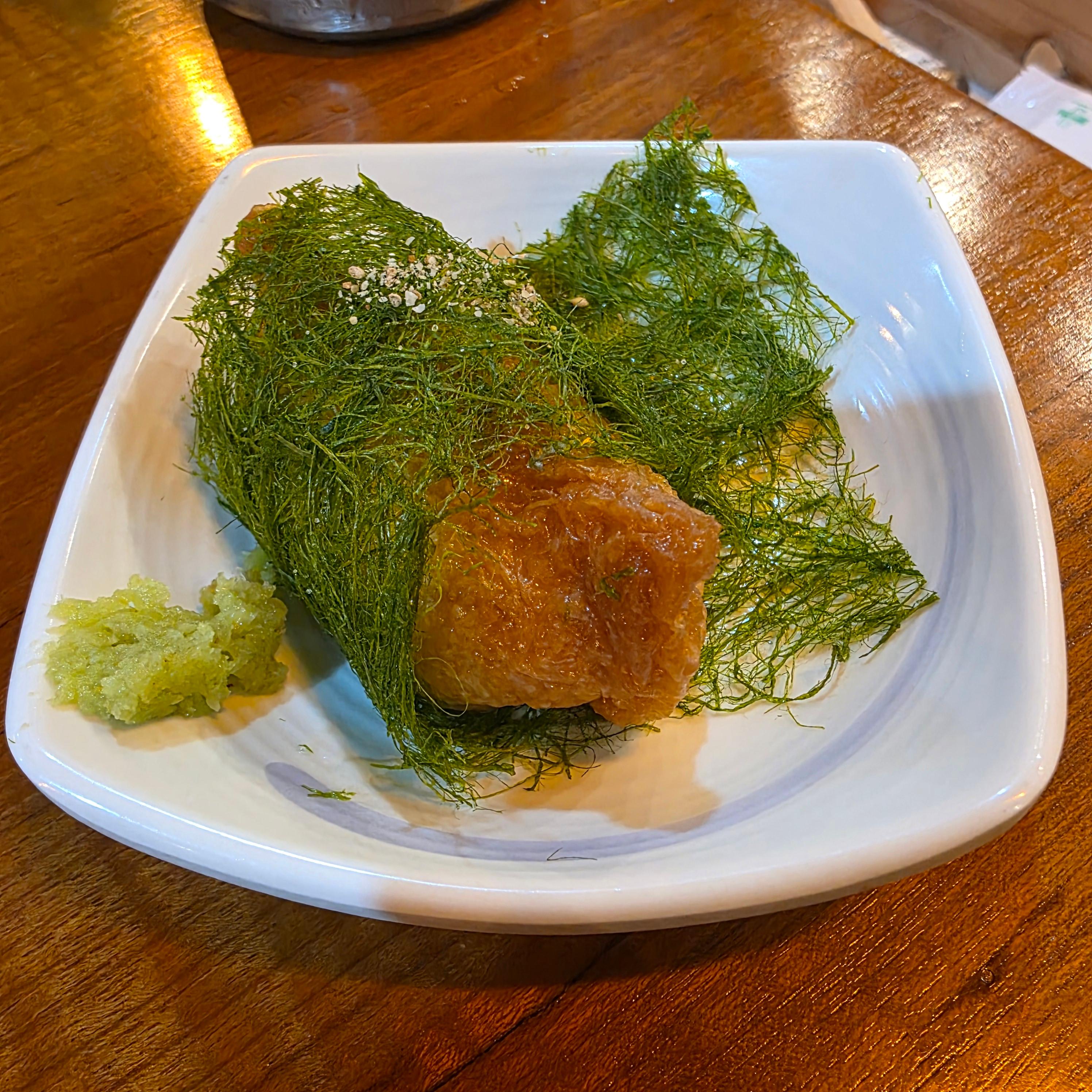 자리에 앉자마자 기본으로 나온 건 감태 유부초밥이었어요. 일반 유부초밥 위에 감태가 올려져 있어 향긋하고 달짝지근한 맛이 일품이었는데, 솔직히 말하면 이날 먹은 메뉴 중 이게 제일 맛있었습니다. 기본 제공인지 몰라서 또 주문했다가 유부초밥만 잔뜩 먹게 됐는데, 이건 기분 좋은 해프닝이었죠. 유부의 단맛과 감태의 바다향이 조화를 이뤄 우동 국물과도 잘 어울렸습니다.
