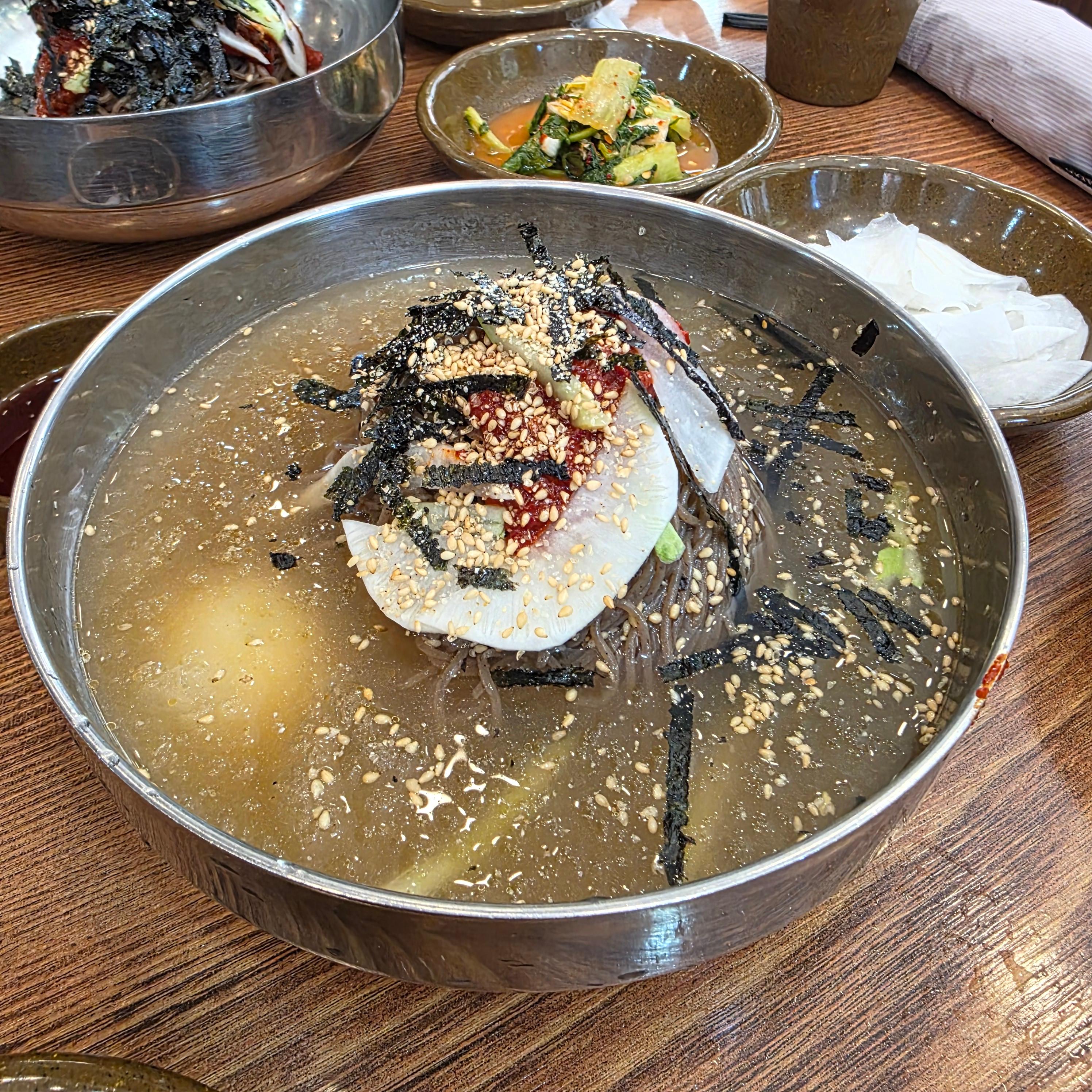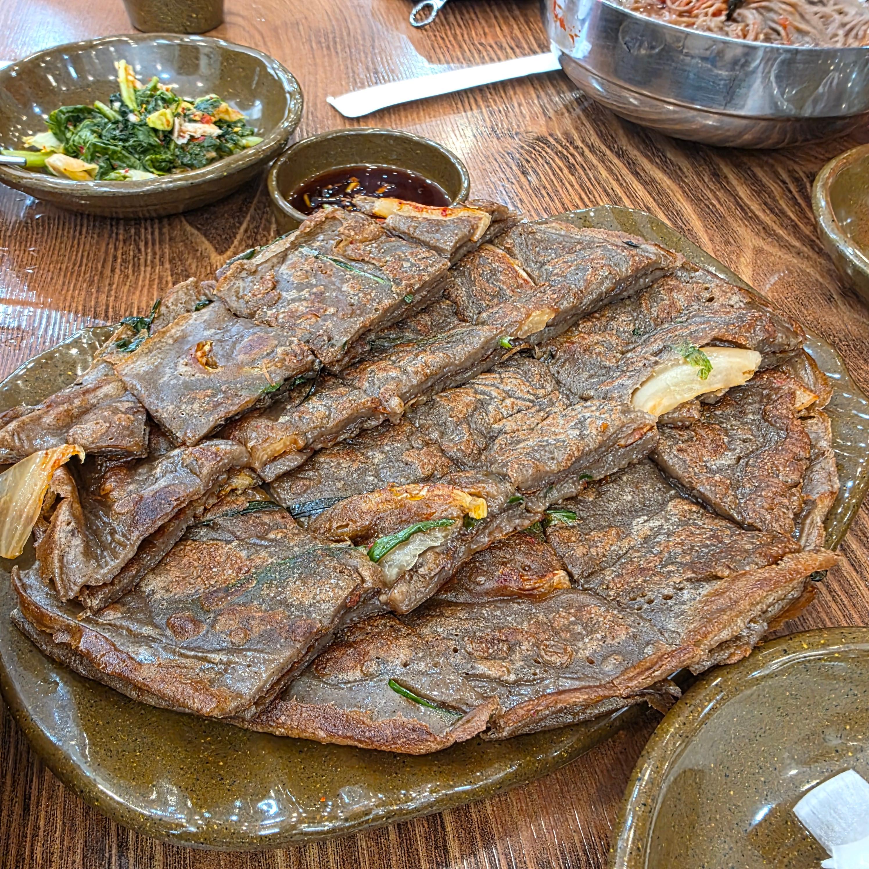 메밀 막국수만으로도 배부르지만, 저희는 사이드 메뉴까지 푸짐하게 주문했습니다. 먼저 메밀전은 생각보다 크기가 커서 네 명이서 나눠 먹기에 충분했어요. 겉은 바삭하고 속은 촉촉해서 막국수와 함께 먹으면 궁합이 좋았습니다. 다음으로 주문한 메밀만두는 양이 꽤 많았는데, 만두피가 얇고 속이 꽉 차 있어서 만족스러웠어요. 메밀 특유의 구수한 맛이 은은하게 느껴져서 담백하게 즐길 수 있었습니다. 막국수와 사이드를 함께 먹으니 푸짐한 한상차림 느낌이 나서 더욱 든든했어요. 전체적으로 양과 질 모두 만족스러운 구성이었습니다.