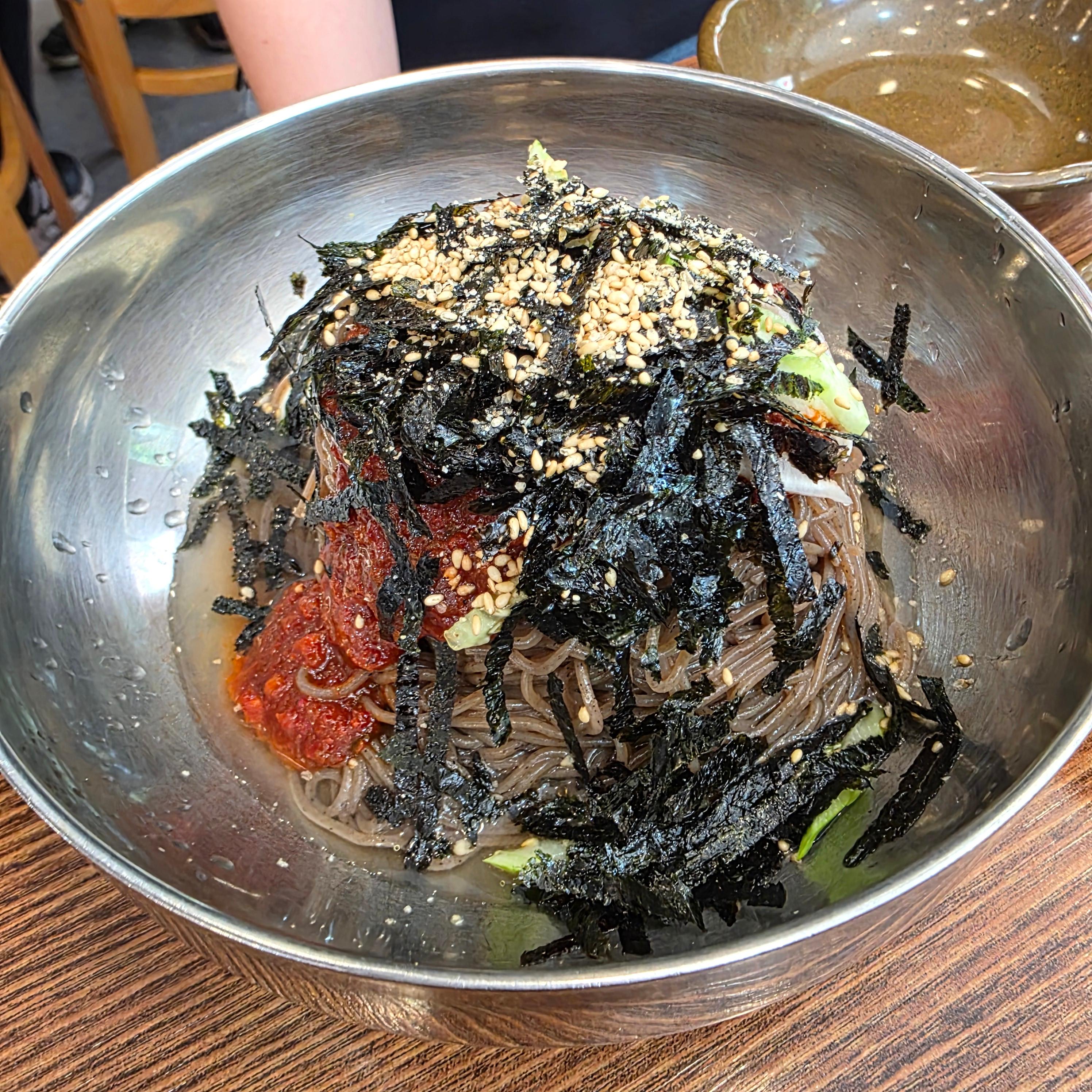 이 집의 가장 큰 특징은 양이 많다는 점이에요. 발산역막국수라는 이름이 무색하지 않을 정도로 푸짐하게 나와서 배부르게 먹을 수 있습니다. 저는 메밀물막국수를 시켰는데, 얼음 동동 띄워진 육수가 아주 시원하고 감칠맛이 좋았어요. 새콤하면서도 담백한 맛이라 더운 날씨에 특히 잘 어울렸습니다. 같이 간 동료는 비빔막국수를 주문했는데, 고추장 양념이 적당히 매콤달콤해서 식욕을 확 끌어올리더라고요. 비빔과 물막국수 모두 양이 상당히 많아서 보통 한 그릇이면 충분히 배부를 정도였어요. 점심 한 끼로 든든하게 먹기 좋은 메뉴였습니다.
