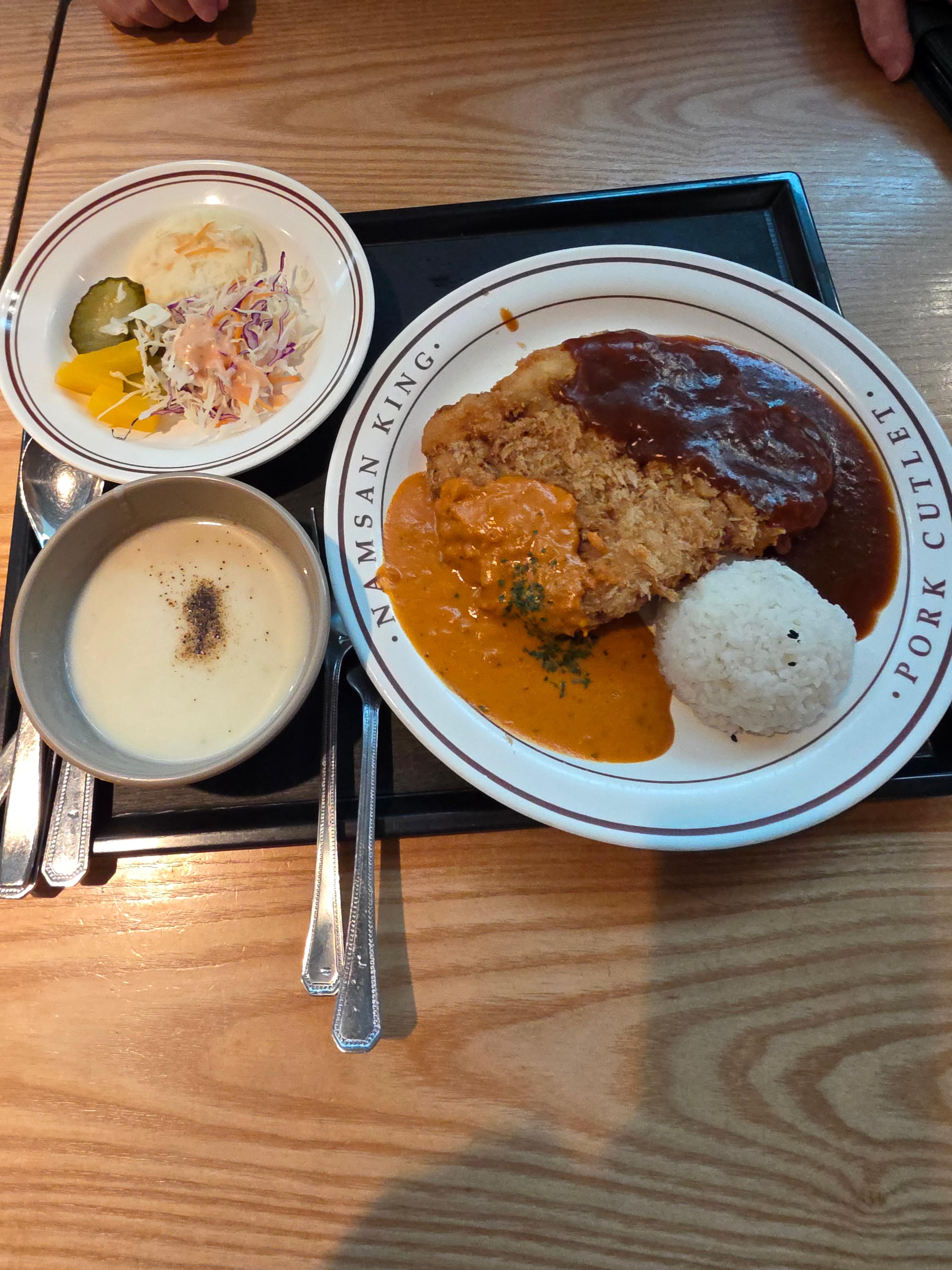 같이 주문했던 남산왕돈까스 반반로제는 이름만 들어도 익숙한 경양식 돈까스 스타일이었어요. 브라운소스와 로제소스를 반반으로 선택할 수 있는 메뉴였는데, 저는 로제소스를 기대하면서 주문했거든요. 근데 막상 먹어보니 살짝 느끼했음. 내 입맛엔 브라운소스가 더 맞는 것 같더라구요. 고기가 바삭하게 튀겨져 나오길 바랐는데, 방금 나온 건데도 튀김옷이 바삭하지 않고 조금 눅눅했던 건 아쉬웠음. 그래도 돈까스 자체는 두께감 있고 푸짐한 편이라 양은 충분했어요. 인천공항에서 돈까스를 먹어야겠다 싶으면 선택지는 괜찮은데, 굳이 로제 말고 브라운으로 가는 게 더 무난할 듯 싶었음ㅋㅋ