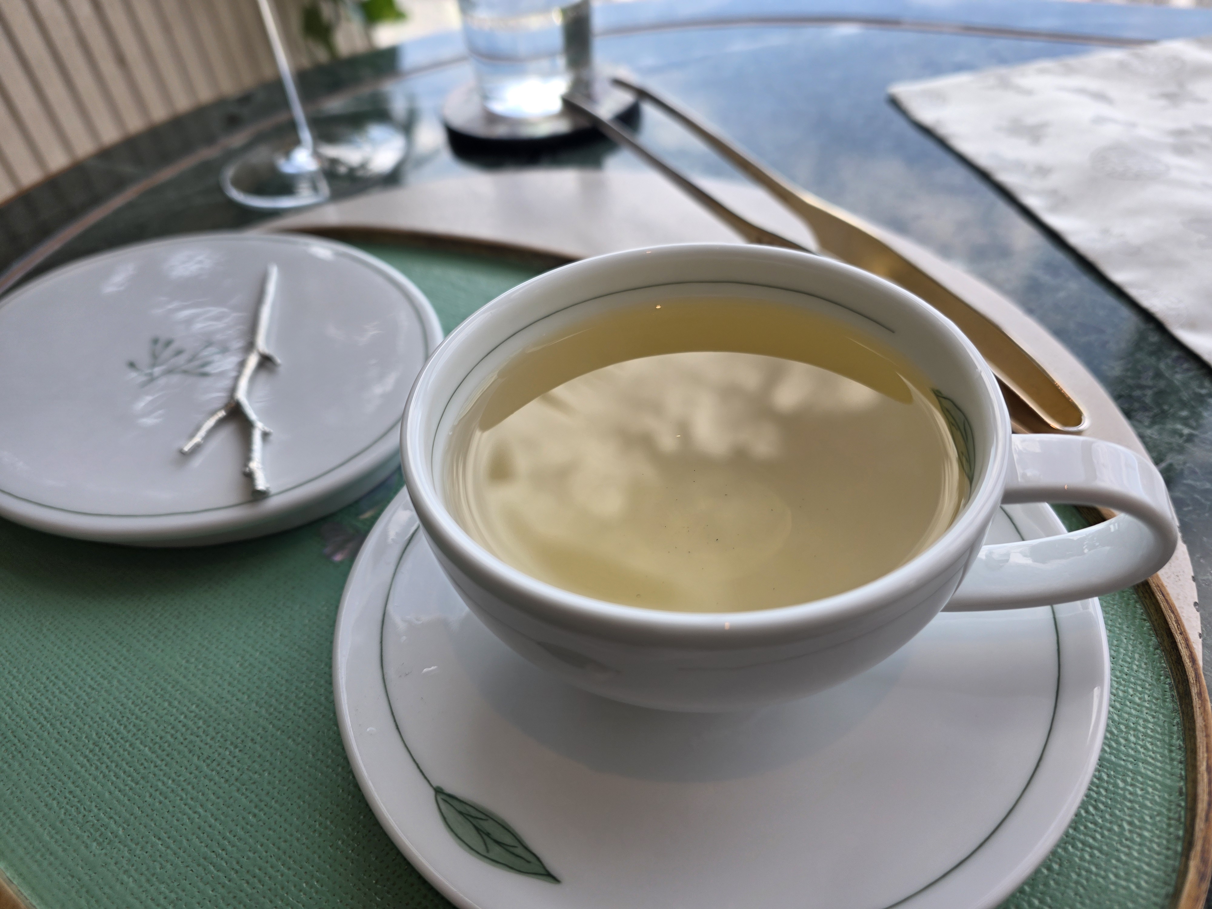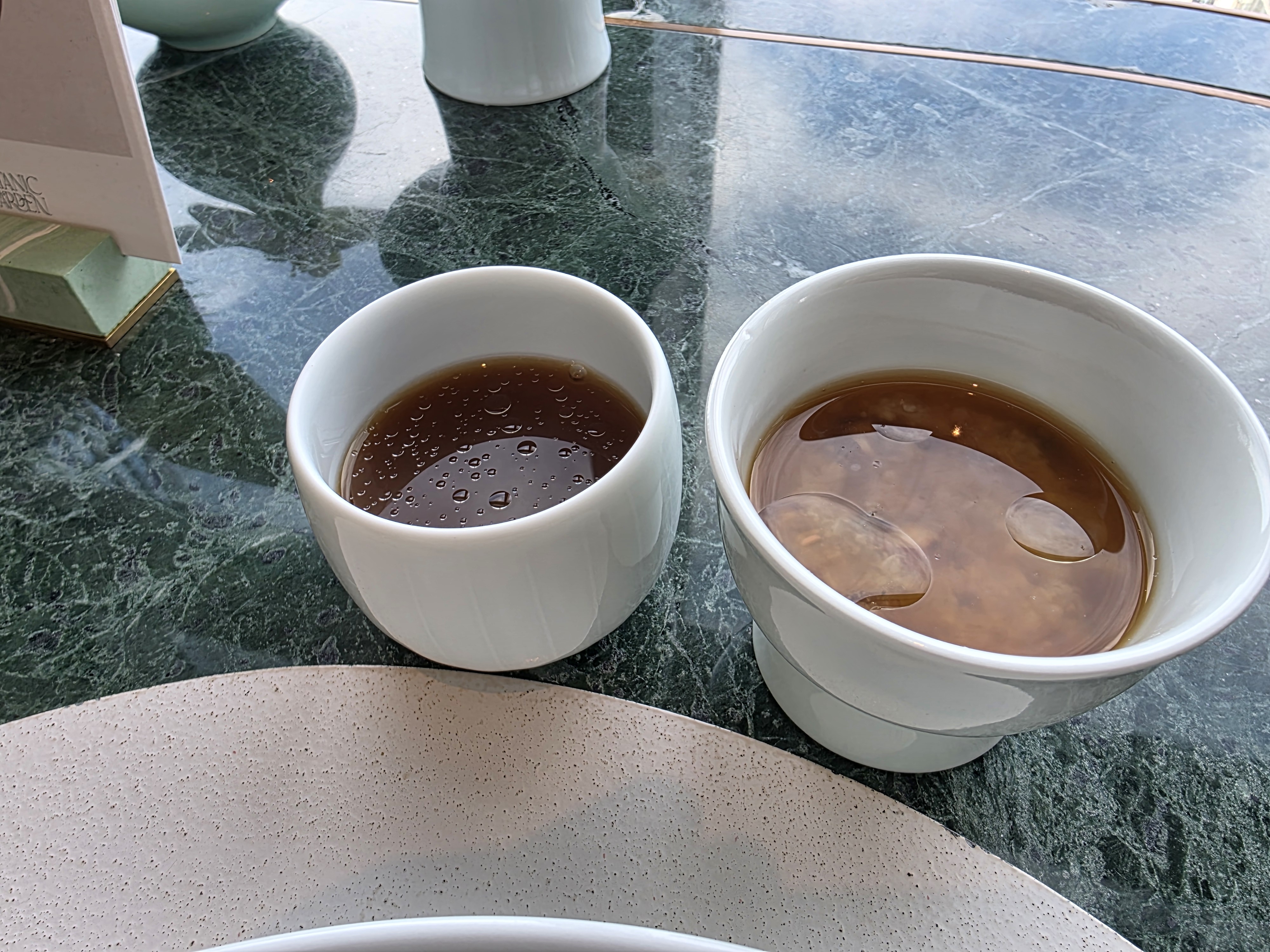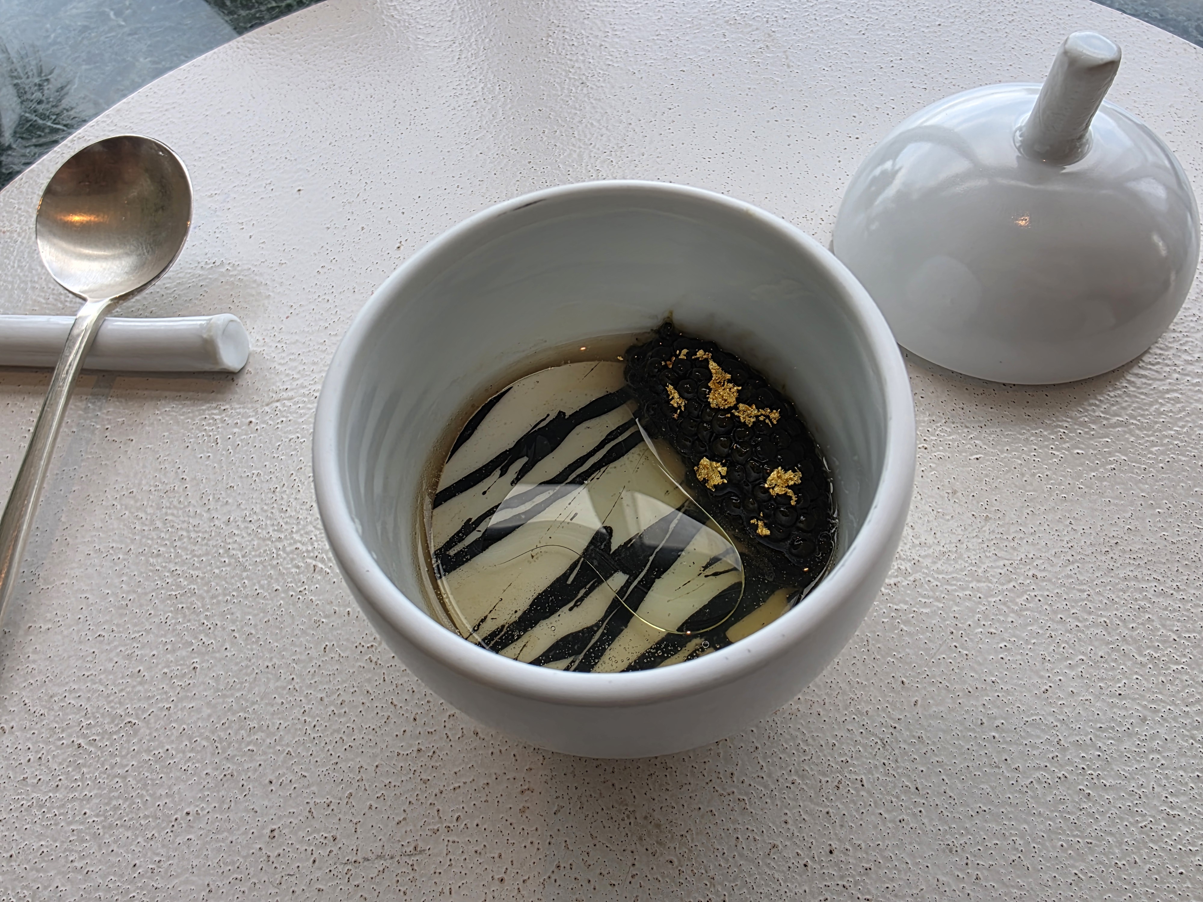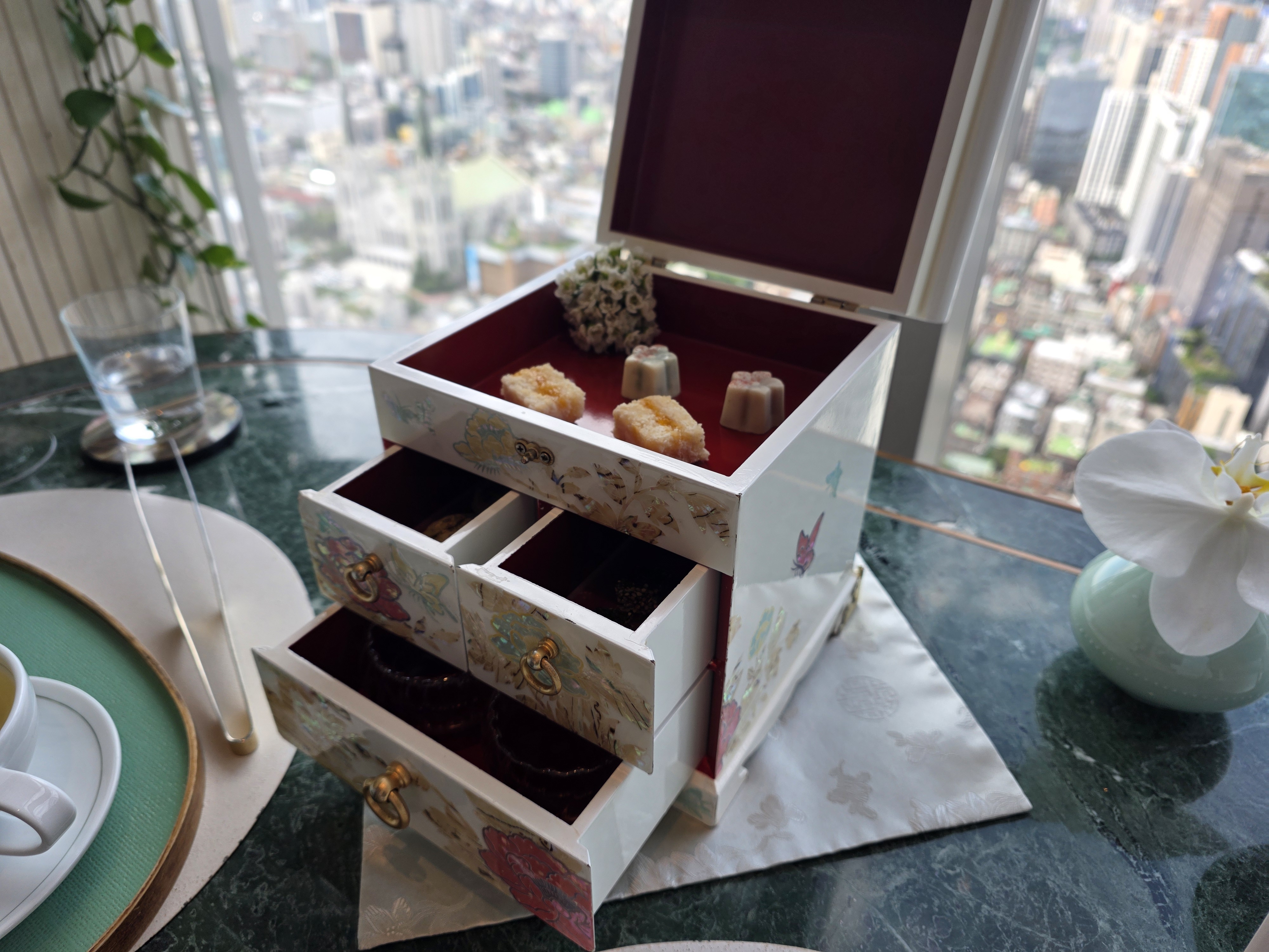 디저트는 개성약과로 마무리됐습니다. 약과를 층층이 쌓아 만든 형태라 기존의 찐득한 식감이 아니라 바삭하면서도 달콤했어요. 이런 약과라면 매일 먹을 수 있겠다 싶었음. 빙수도 나왔는데, 술찌개미가 들어간 빙수 위에 생강 소스가 올라가 있어서 입안이 개운했습니다. 마지막 자개함에는 다양한 디저트와 차가 담겨 있었는데, 저는 대나무 죽순차를, 연인은 박하차를 선택했습니다. 특히 감동이었던 건, 제가 견과류를 피한다고 했더니 잣 초콜릿 대신 감태 초콜릿을 따로 만들어주신 거예요. 이게 또 말도 안 되게 맛있어서 지금도 생각나요.