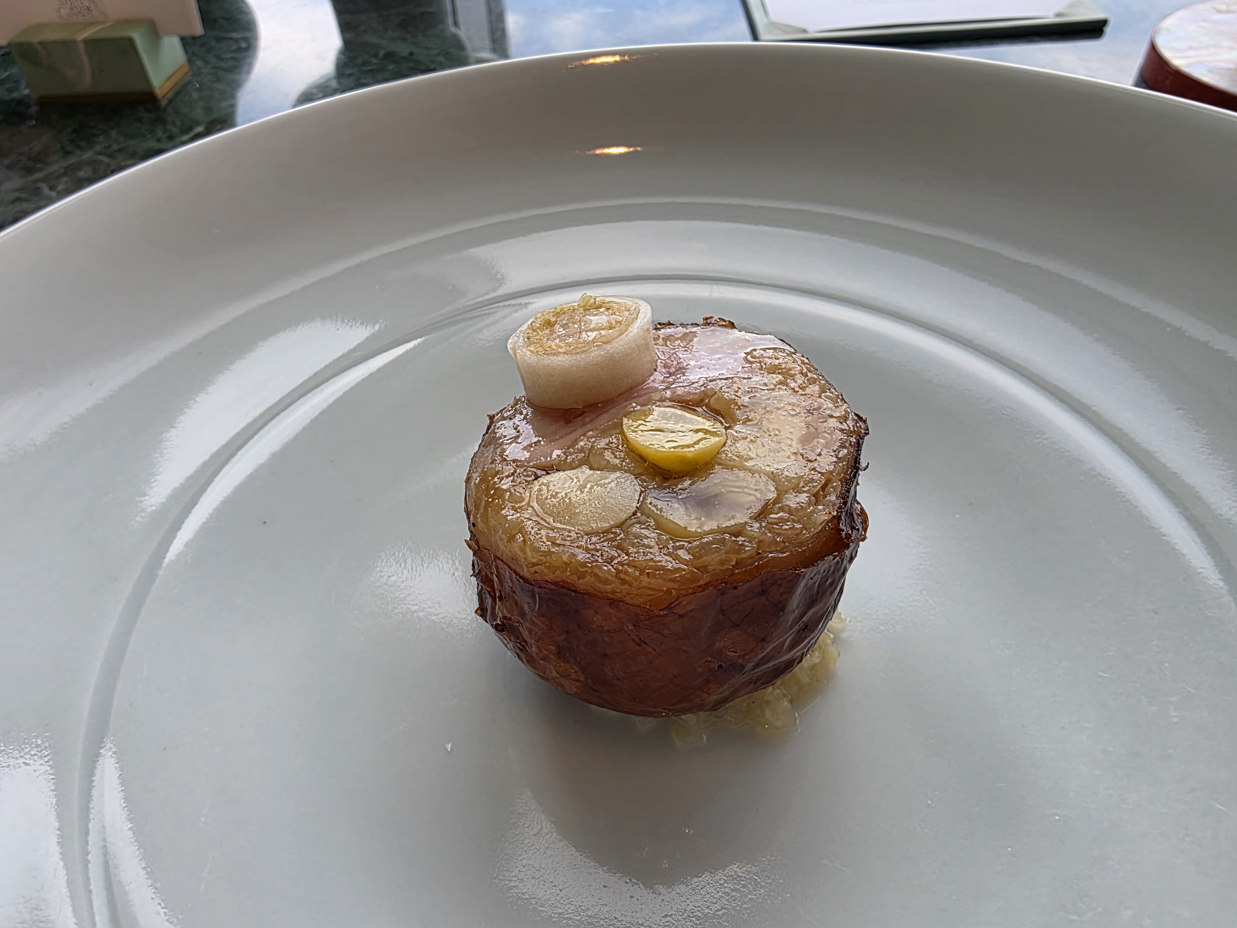 토마토 요리는 다양한 조리법으로 만들어진 토마토들이 줄맞춰 세팅돼 있었고, 아래쪽에는 게살이 깔려 있었어요. 게살은 잣과 겨자 소스로 버무려져 있었는데, 이게 진짜 압권이었음. 먹는 순간 아까의 최애가 바로 바뀔 정도였어요ㅋㅋ ‘내 기준에서는 이거 오늘 원탑이다’ 싶었음. 이어서 추가 메뉴로 나온 진도대파 요리는 7만 5천 원이 추가되는 구성이었는데, 대파에 큰 우럭과 갑오징어가 들어가 있고, 위에는 캐비어가 듬뿍 올라가 있었습니다. 금가루까지 뿌려져 있어서 시각적으로도 화려했어요. 대파를 이렇게 맛있게 먹을 수 있다니, 집에서 맨날 썩히던 대파가 미안해질 지경이었음ㅋㅋ