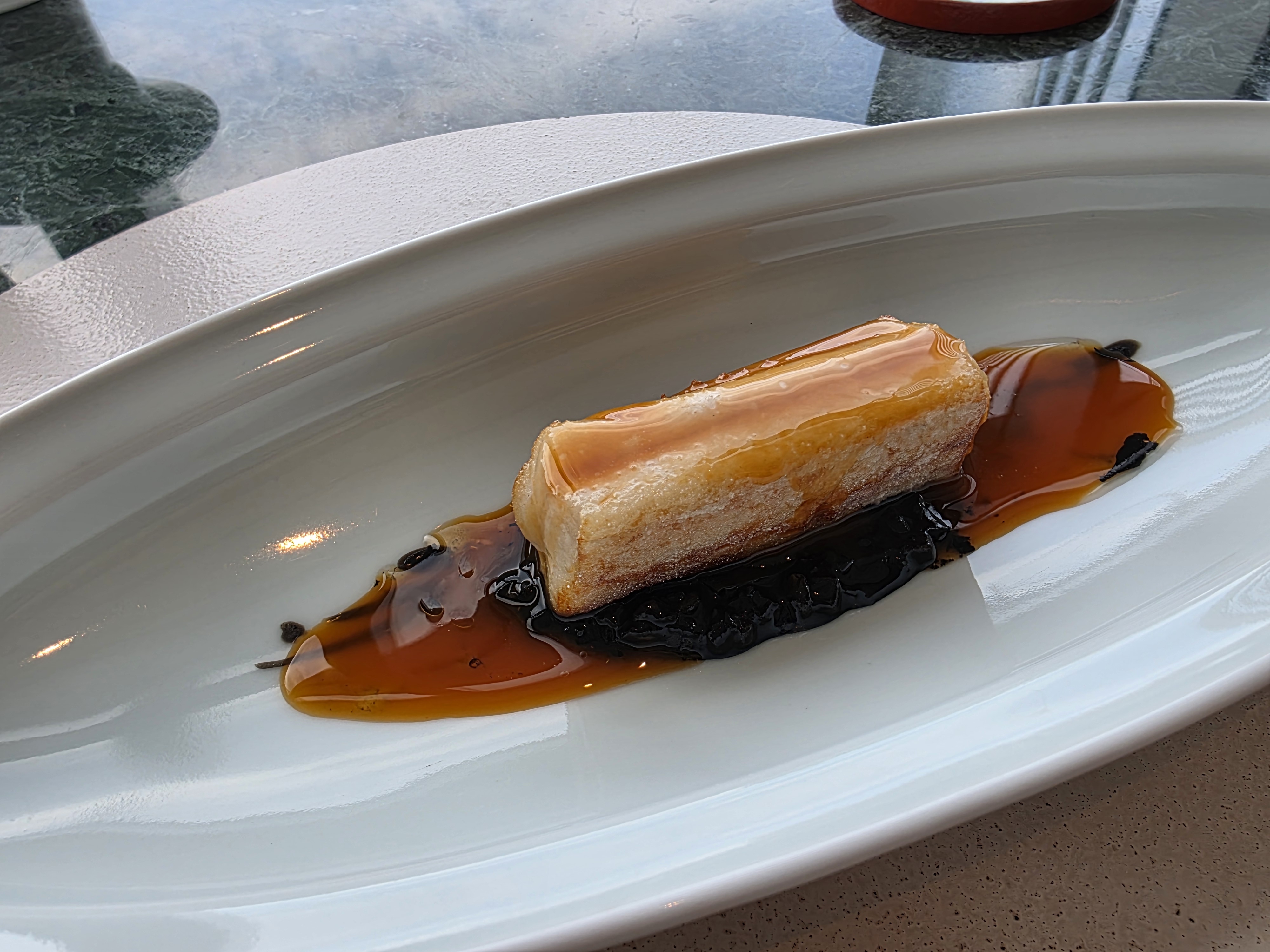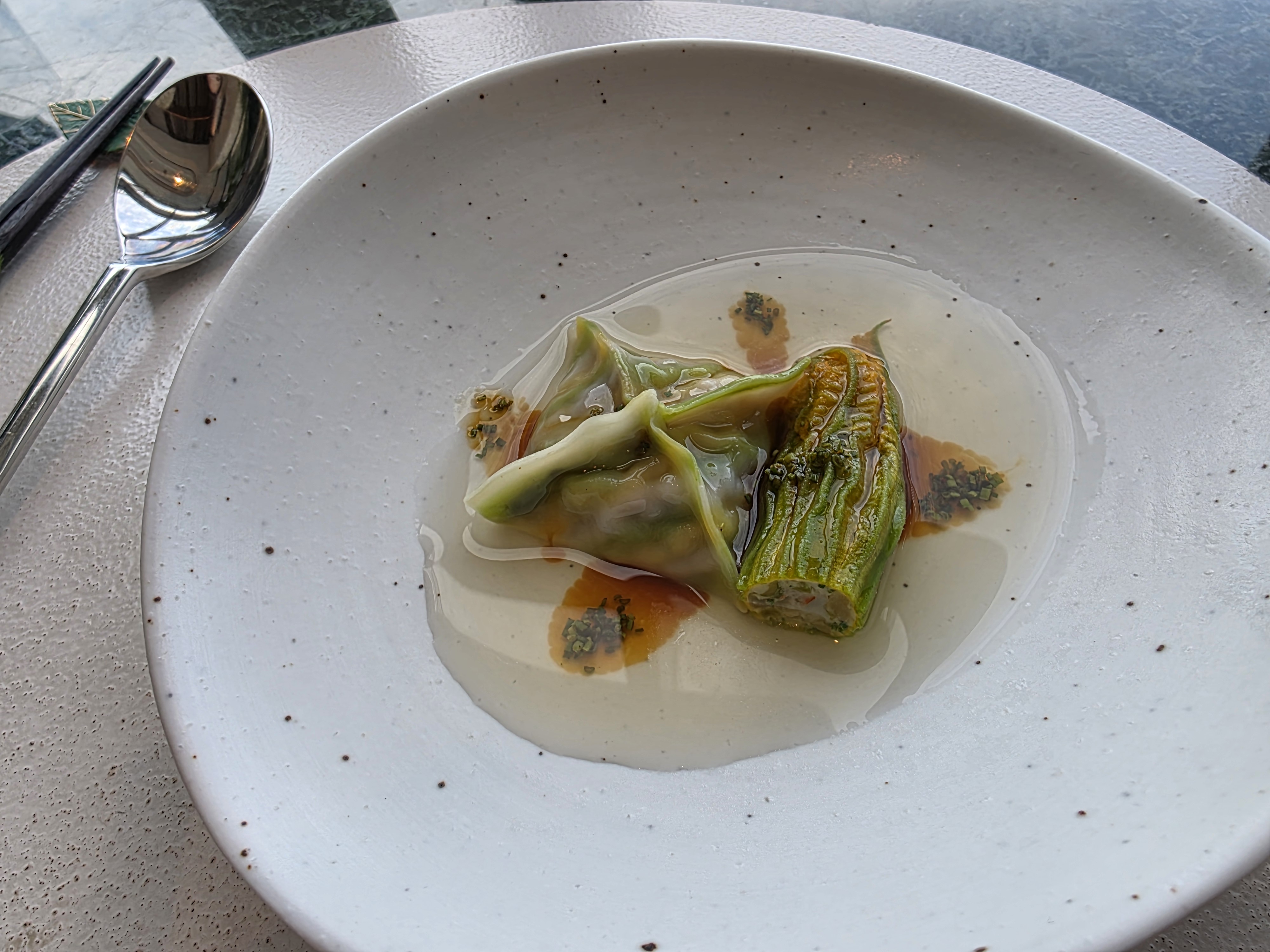 돼지호박 요리는 만두로 나왔습니다. 호박꽃에 싼 만두와 네모난 모양 만두, 안에는 새우살이 들어 있었는데 특이하게 차가운 만두였어요. 국물은 조개와 고기를 우려낸 맑은 국물인데 비리지도 않고 깔끔했음. 특제 간장까지 더해져서 진짜 만족스러웠습니다. 먹으면서 괜히 평양냉면 생각났음ㅋㅋ 여름고추 요리는 갈치구이와 함께 나왔는데, 갈치 아래에 보리와 고추로 만든 소스가 깔려 있었고, 붉은 소스는 고추장으로 만든 소스였다고 해요. 맵지 않고 은은하게 매콤해서 입에 착 붙는 맛이었어요. 전혀 자극적이지 않고 균형 잡힌 맛이 돋보였습니다.