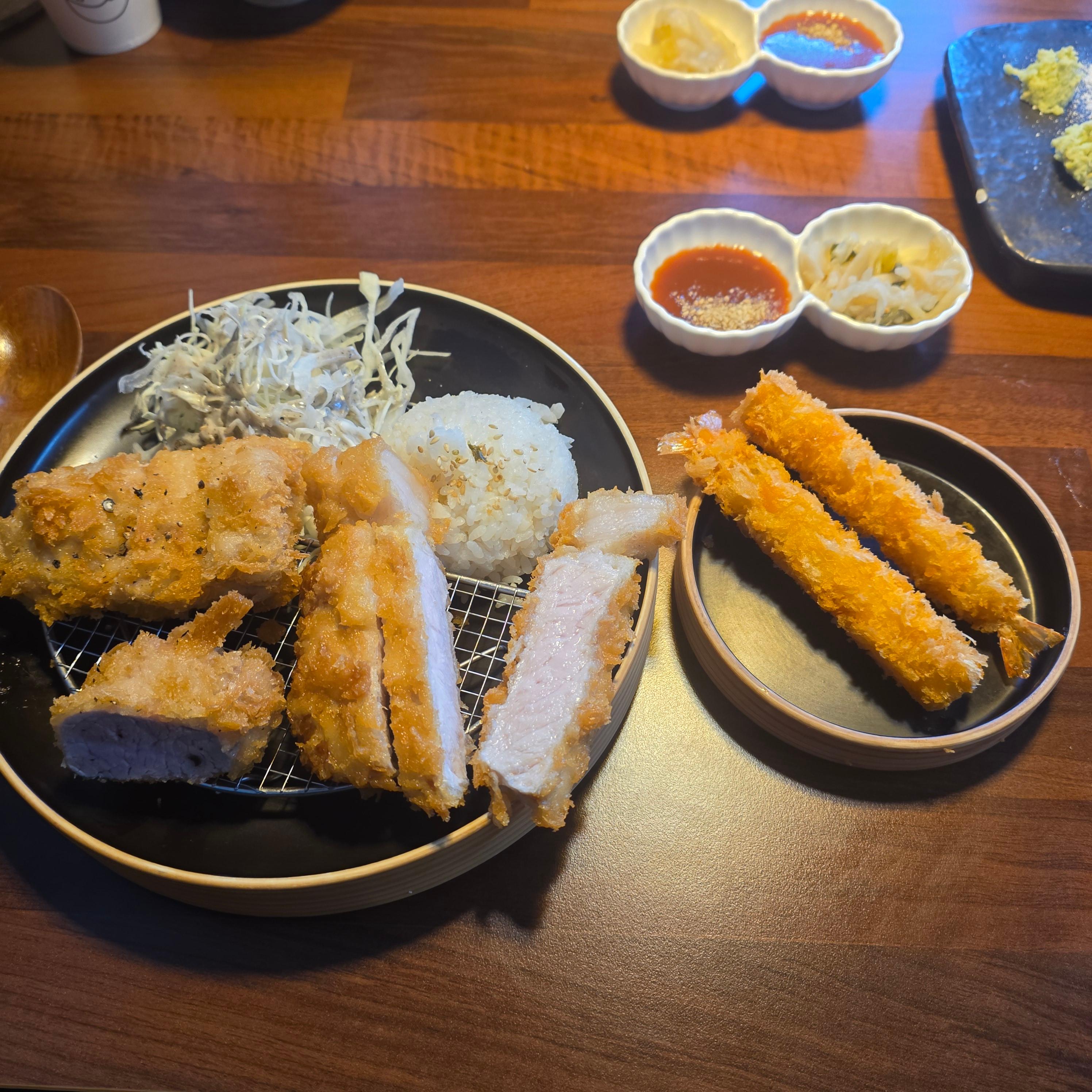 저희는 마제소바(13,000원), 안심+등심정식(14,000원), 가브리등심카츠, 그리고 새우튀김(2p, 2,800원)을 주문했어요. 마제소바는 비주얼부터 합격. 면발이 탱탱하고 간이 진해서 아주 괜찮았어요. 돈까스는... 진짜 맛있었어요. 특히 안심이 부드럽고 육즙이 살아있었어요. 튀김옷이 바삭한데 기름기 없이 깔끔하게 떨어져요. 그리고 소스! 소스 맛이 진하면서도 단맛이 강하지 않아서 고기 본연의 맛이 잘 느껴졌어요. 같이 간 사람들 다 “와, 이건 진짜 잘 튀긴 돈까스다” 했을 정도. 그런데 새우튀김은 살짝 아쉬웠어요. 뭔가 딱 먹자마자 “이건 기성품인가?” 싶었거든요. 물론 맛이 나쁘진 않았는데, 다른 메뉴들이 워낙 잘 나와서 더 비교가 됐달까. 만약 진짜 수제라면, 조금만 더 바삭하거나 튀김옷 얇게 조정되면 완벽할 것 같아요.
