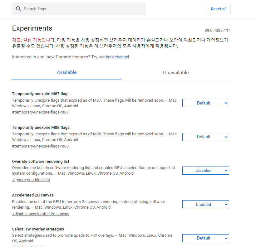 나 말고도 굉장히 많은 사람들이 이런 문제점때문에 아주 괴로워하고 있다. 그래서 쉽게 해결할 수 있는 방법을 소개하려고 한다. 우선 chrome://flags/#enable-npapi 링크로 접속해준다. 이 링크로 접속을 하면 아래 이미지와 같은 페이지가 뜨는데 여기에서 오른쪽 위에 있는 Reset all 버튼을 눌러주면 된다. 여기는 실험 중인 기능을 모아놓은 곳이다. 즉 크롬에서 무슨 기능을 적용하면서 실험 기능으로 자동완성 기능이 생겼다는 것이다.