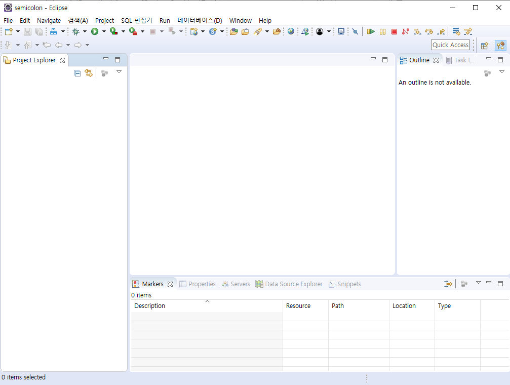 그러면 이렇게 이클립스가 실행됩니다. 이제 여기에서 원하는 개발 프로젝트를 생성하여 개발을 시작할 수 있습니다. 다음 시간에는 실제로 프로젝트를 생성하여 개발의 기본을 배워보도록 하겠습니다.