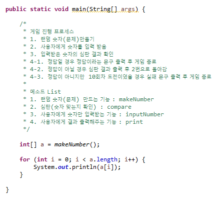 미리 이렇게 주석으로 적어두면 따로 문제를 보면서 개발하지 않아도 되어 편리하답니다. 다만 프로세스와 메소드 리스트를 꼼꼼히 적지 않으면 개발 사항에 누락이 생기게 되기 때문에 빠진 기능이 없이 적어주도록 합니다. 자, 그럼 우선 makeNumber()를 만들어볼까요?