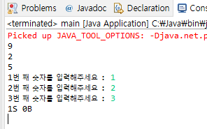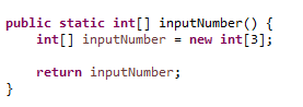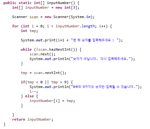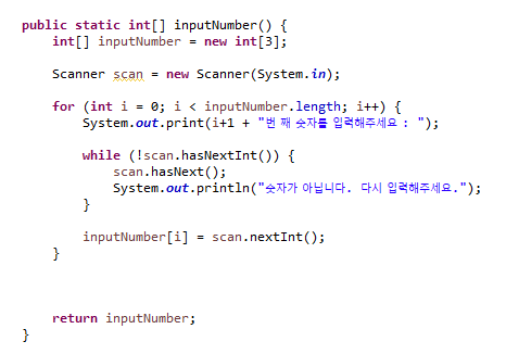 이번에도 makeNumber() 때와 마찬가지로 int배열을 통해 리턴을 받을 예정입니다. 그럼 내용을 만들어보겠습니다. 우선 간단하게 숫자를 3번 입력받아 배열에 넣는 소스를 먼저 만들어보겠습니다.