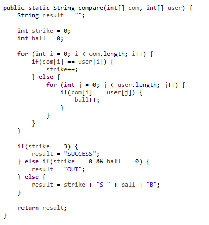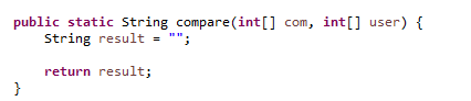 심판은 컴퓨터가 만들어낸 숫자와 유저가 입력한 숫자를 비교하여 결과를 뱉어낼 예정입니다. 따라서 메소드 명 뒤에 파라미터라고 불리는 친구를 받아서 실행 예정입니다. compare를 실행할 때 컴퓨터가 만들어낸 숫자 배열 com과 유저가 입력한 숫자 배열 user를 받아서 결과는 String, 즉 문자열 형태로 반환 예정입니다.