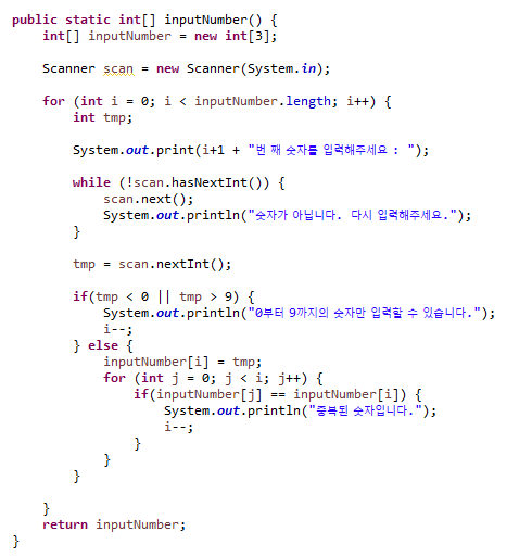 변화된 점의 가장 큰 것은 for문 안에서 입력 받은 숫자를 곧바로 inputNumber 배열에 넣지 않고 int tmp라는 변수를 선언하여 해당 변수에 값을 넣어서 조건을 검사한다는 점입니다. 처음 검사는 tmp가 0보다 작거나 또는( ||로 표현합니다) 9보다 큰 경우 0부터 9까지의 숫자만 입력하라는 메세지 출력 후 i를 감소 시켜 해당 for문을 다시 돌게 만들었습니다. 그리고 범위가 맞을 경우 (else의 경우) inputNumber의 i번째 자리에 tmp에 있던 숫자를 넣어주었습니다. 그렇다면 이제 조건을 하나 더 추가하여, 범위는 맞지만 중복된 숫자를 입력한 경우에 대해서도 대응해보겠습니다.