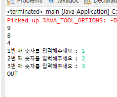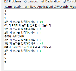 이렇게 하면 숫자를 3번 입력받을 수 있습니다. 다만 문제점이 발생합니다. 바로 중복된 숫자를 입력할 수도 있고, 범위를 벗어나는 숫자 역시 입력이 가능합니다. 따라서 제한 조건을 추가하도록 하겠습니다.