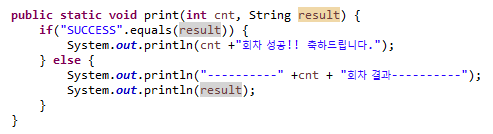 매우 간단한 소스가 완성됐습니다. 하지만 처음 보는 함수가 있습니다. 바로 "SUCCESS".equals(result) 부분인데요. equals()는 문자열을 비교할 때 사용하고 있습니다. 기존에 == 로 비교한 것과 다른 이유는 String이 사실 주소를 담고 있는 자료형이기 때문이에요. 자세한 내용은 추후 다시 다루기로 하겠습니다. 지금은 문자열을 비교할 때는 equals를 사용한다는 것만 기억하면 될 것 같습니다.