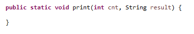 지난 시간에 compare 메소드까지 만들었으니 오늘은 print 메소드와 실제 게임 진행 프로세스를 만들어볼 예정입니다. 우선 print 메소드를 만들어보도록 하겠습니다. 게임 진행 조건 중 10회가 관련된 것이 있으니 print에서는 현재 게임이 몇 회차인지 함께 출력할 예정입니다.