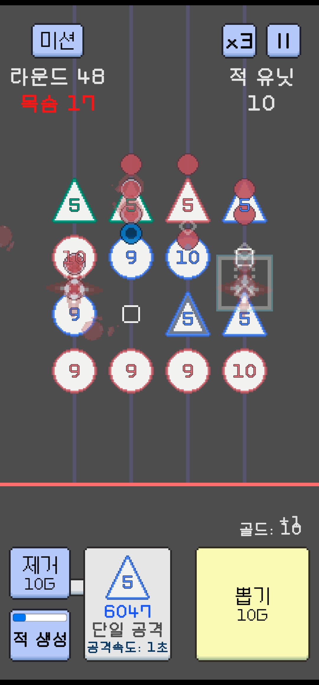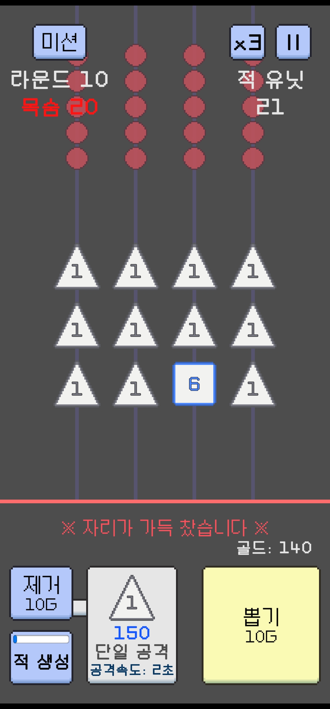 보스가 내려오는 라인에 맞춰서 4레벨을 모조리 합쳐 6레벨로 만들어준다. 그러면 이제 기본 도형의 레벨이 하나 올라 기본적으로 뽑기만 해도 1레벨 도형을 만들수 있다.