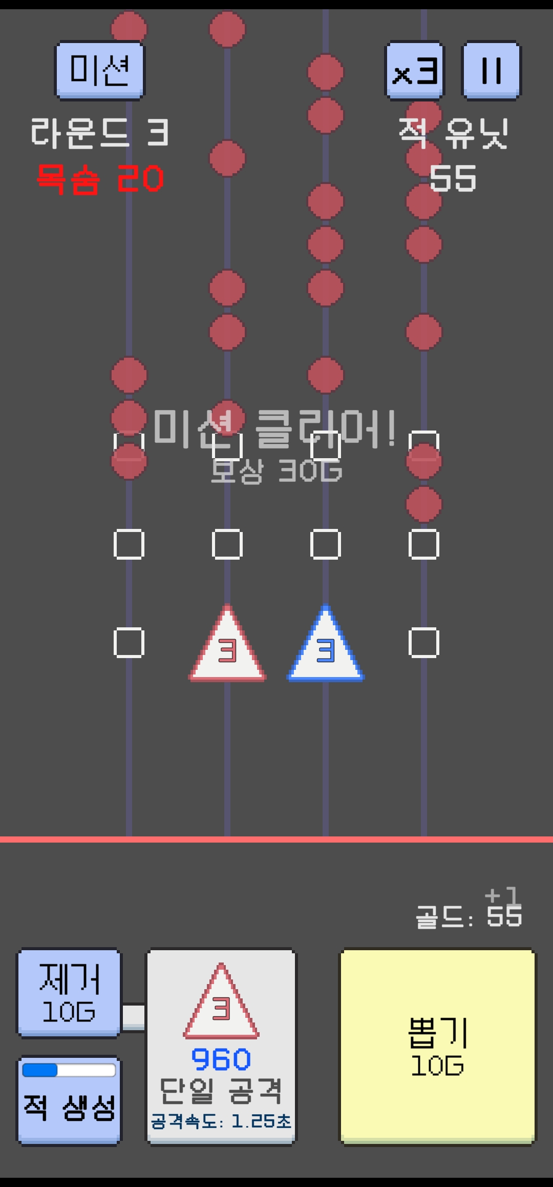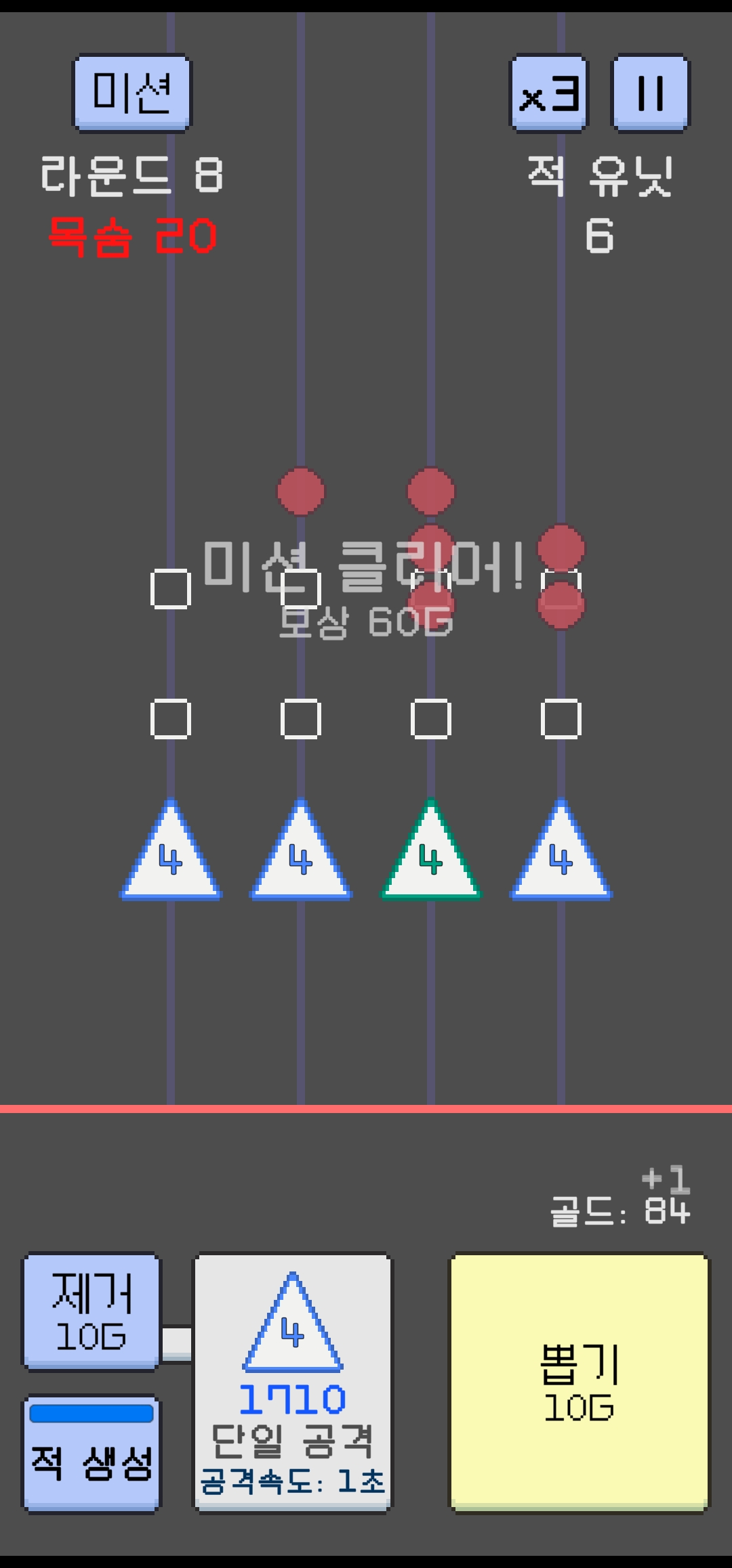 아까와 같은 방법으로 아래쪽으로 내리면서 4짜리를 4개 만들어 준다. 그 후에는 잠시 10레벨까지 아무것도 뽑지 않고 있어야 한다. 돈을 모으는 것이다. 그 이유는 바로 미션에 있다. 미션에서는 다양한 혜택을 제공하고 있다. 도형의 피해량이 30% 증가하는 것 뿐 아니라 돈을 더 받을 수도 있다. 하지만 그 중에서도 집중해야 하는 것은 바로 레벨+1. 레벨+1은 뽑을 수 있는 기본 도형의 레벨을 올려준다. 따라서 10레벨까지 잠시 돈을 모아두도록 하자.