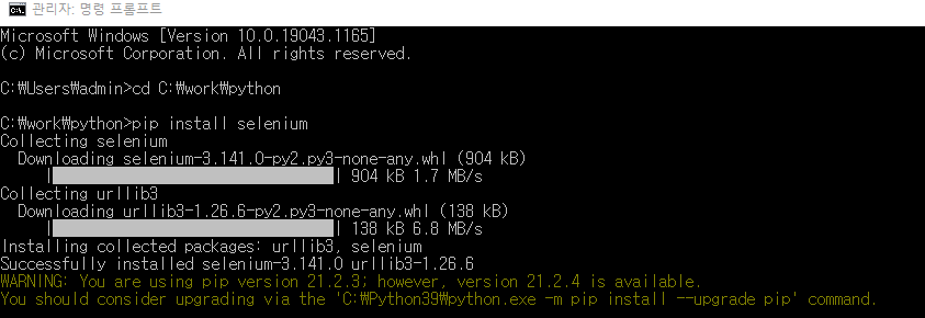 우선 cmd를 열어 작업할 workspace가 있는 경로로 이동합니다. 그 후 pip install selenium 명령어를 입력합니다.