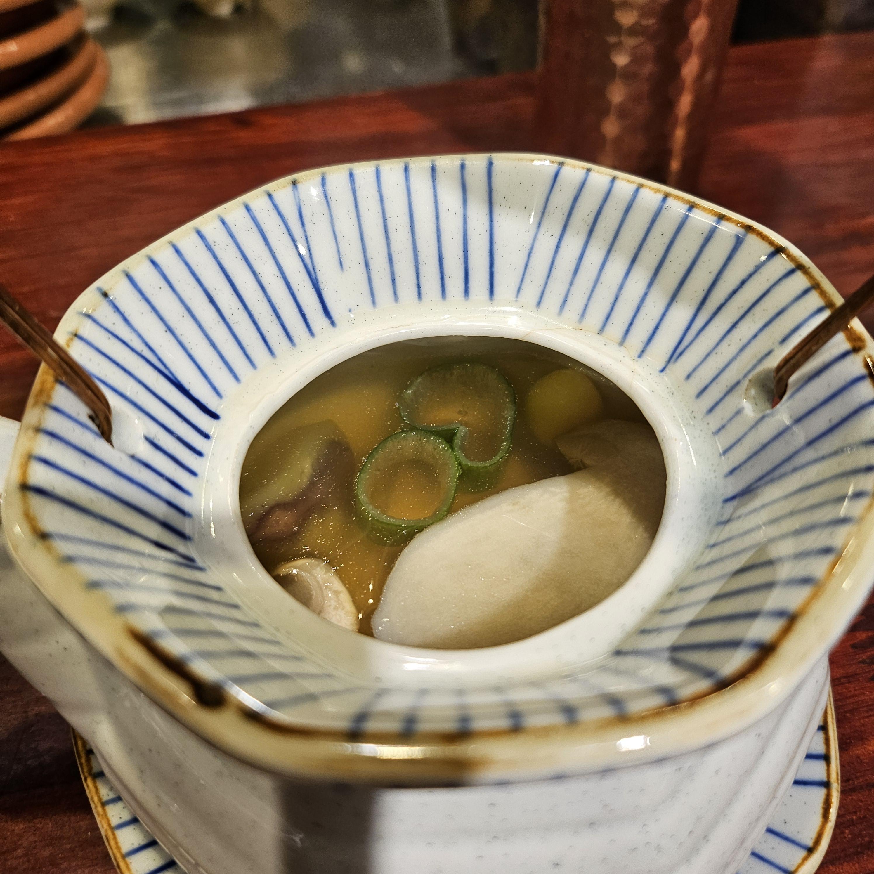 저 주전자에 삼계탕같은 국물이 들어있고 그걸 차처럼 따라 마시면 된다.