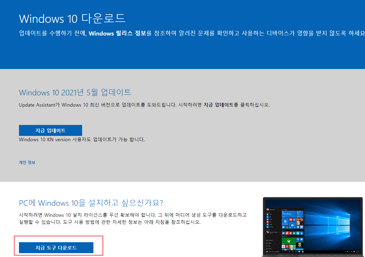 사이트에 접속하여 윈도우 10을 다운로드 받는다.