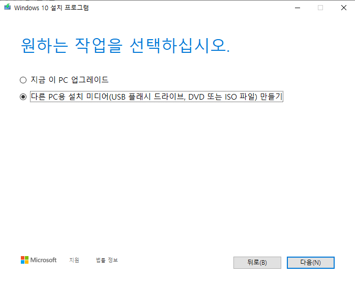 잠시 기다린 뒤 확인하면 작업을 선택할 수 있다. 지금 PC를 업그레이드 하고자 하는 것이 아니기 때문에 다른 PC용 설치 미디어 만들기를 선택해준다.