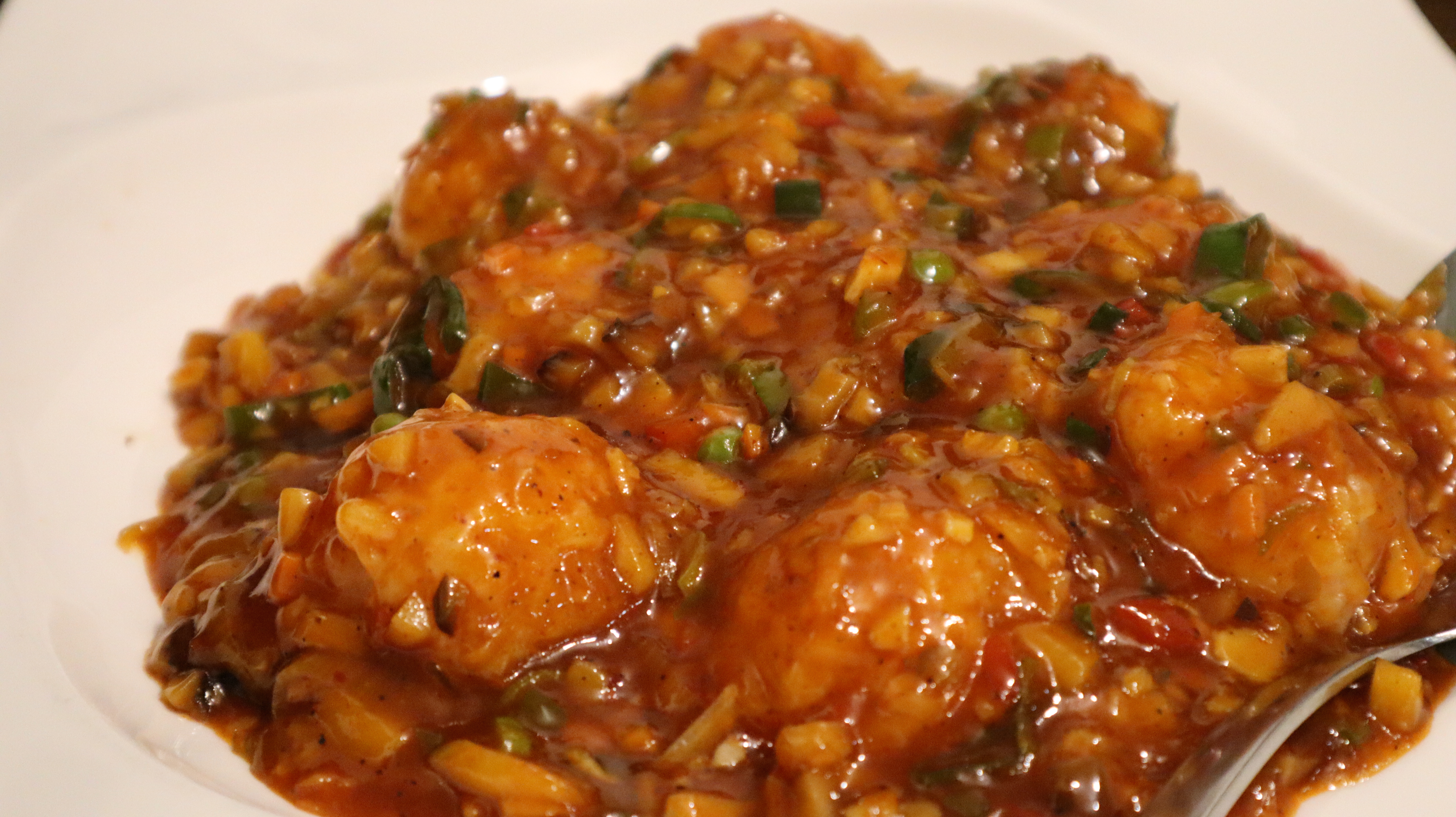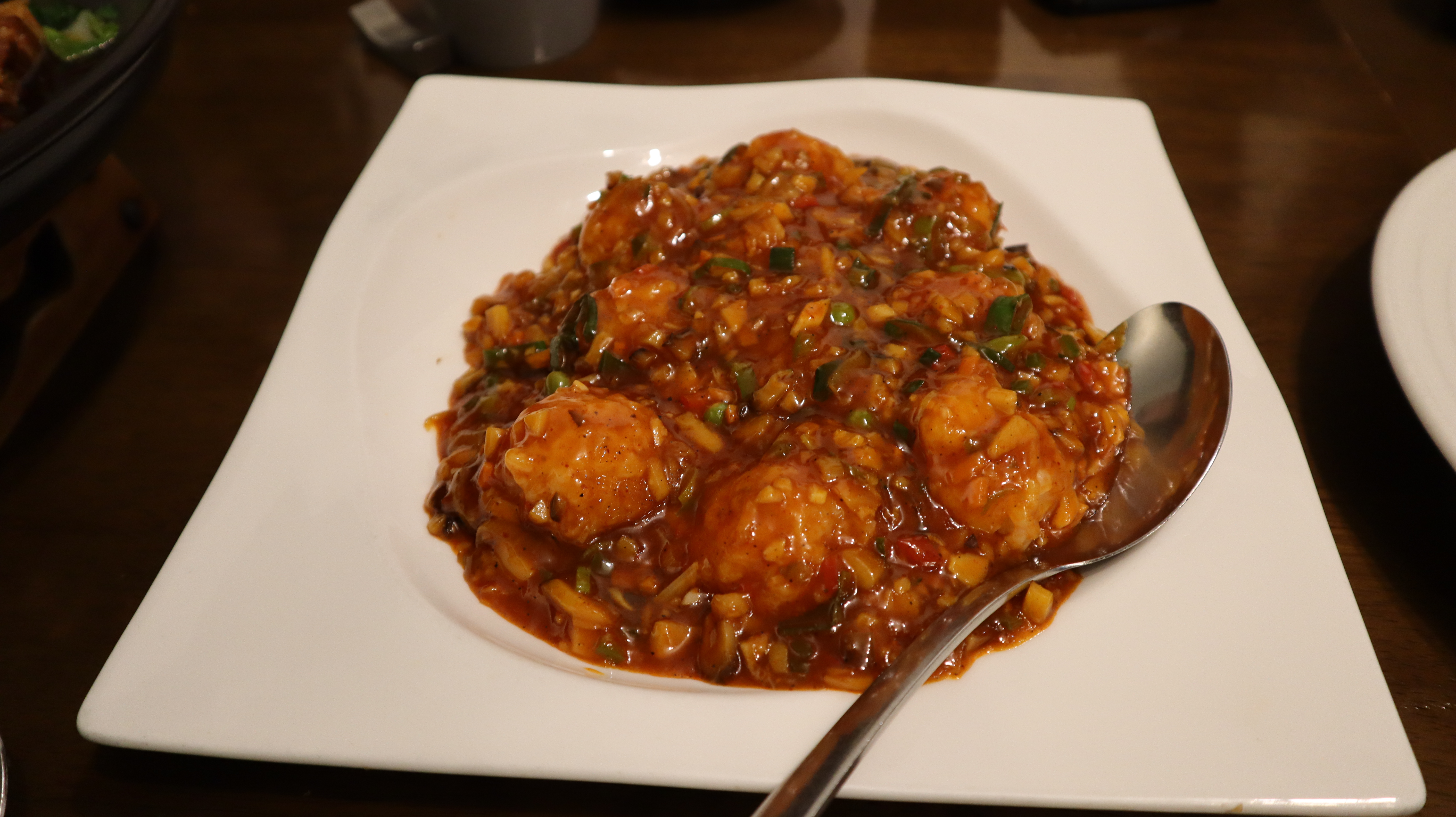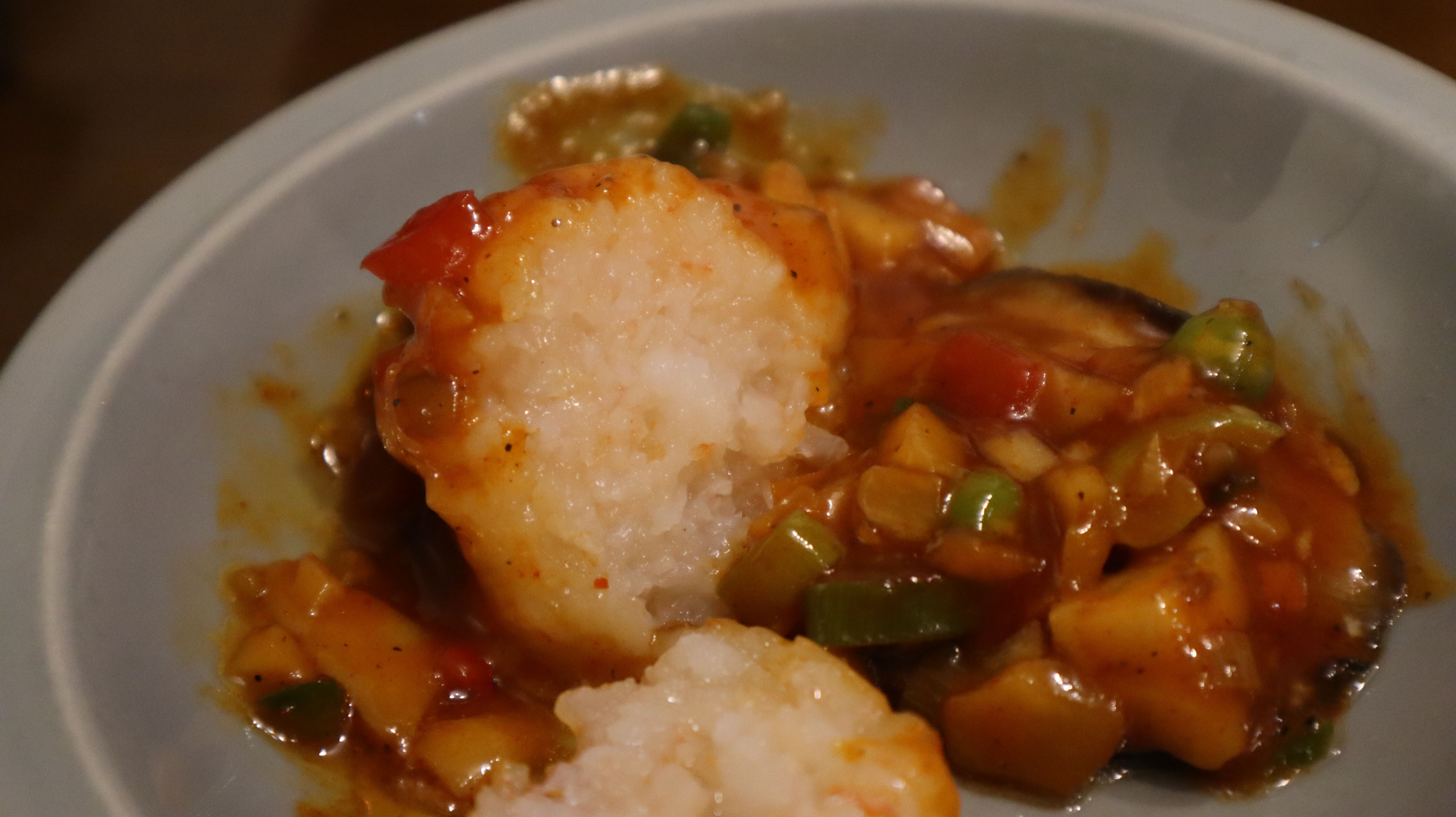 동고버섯 위에 어향 소스가 뿌려져있고.. 거기에 새우볼이 올라가있다.